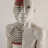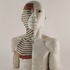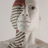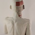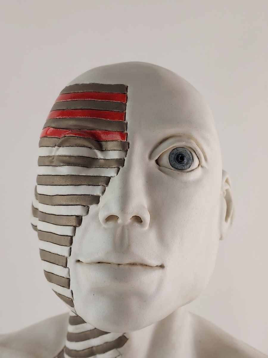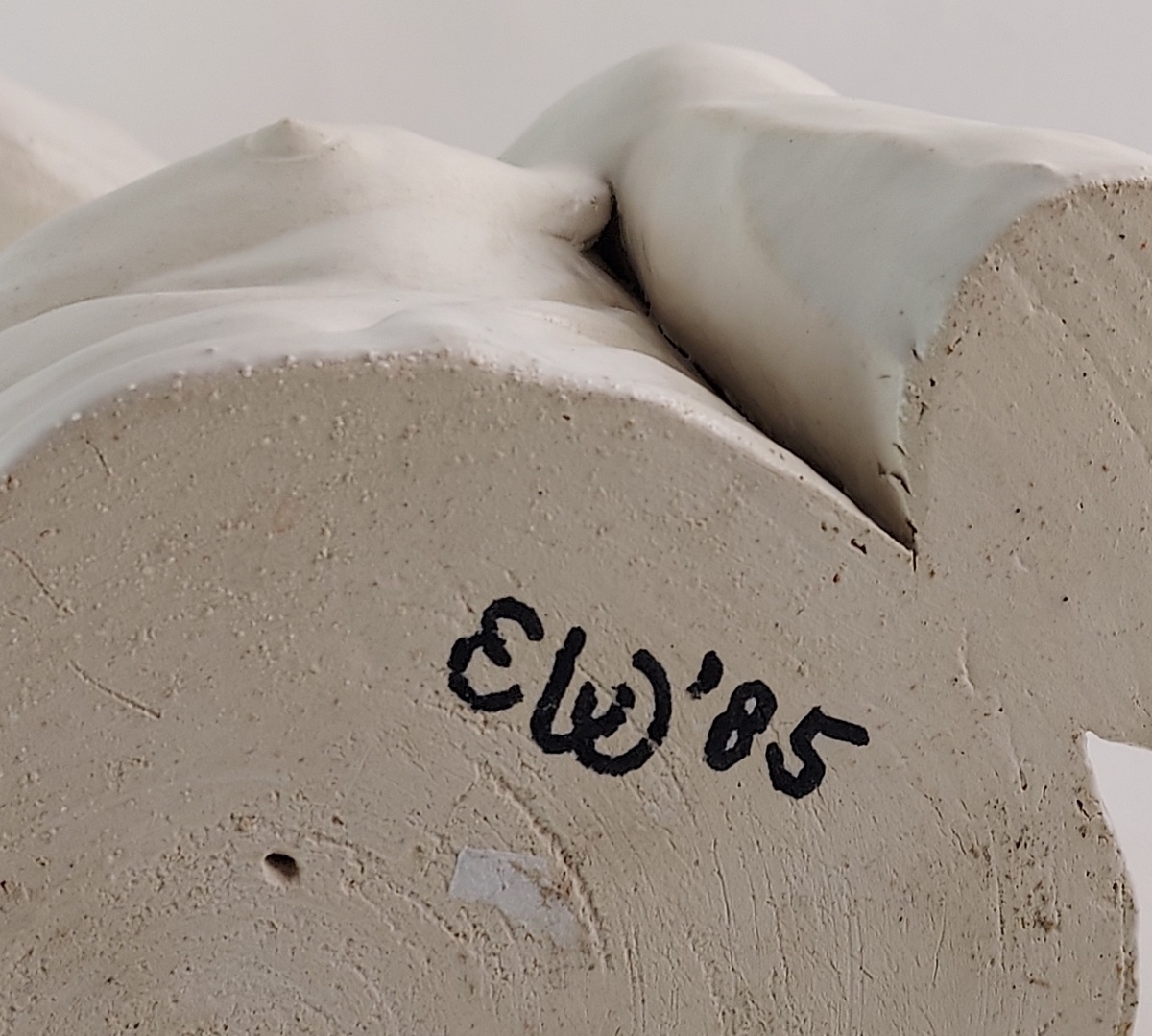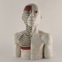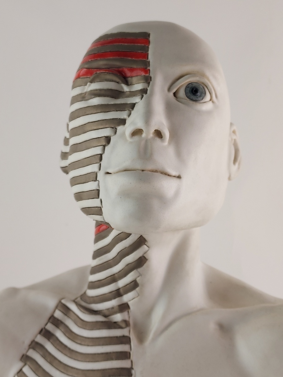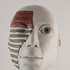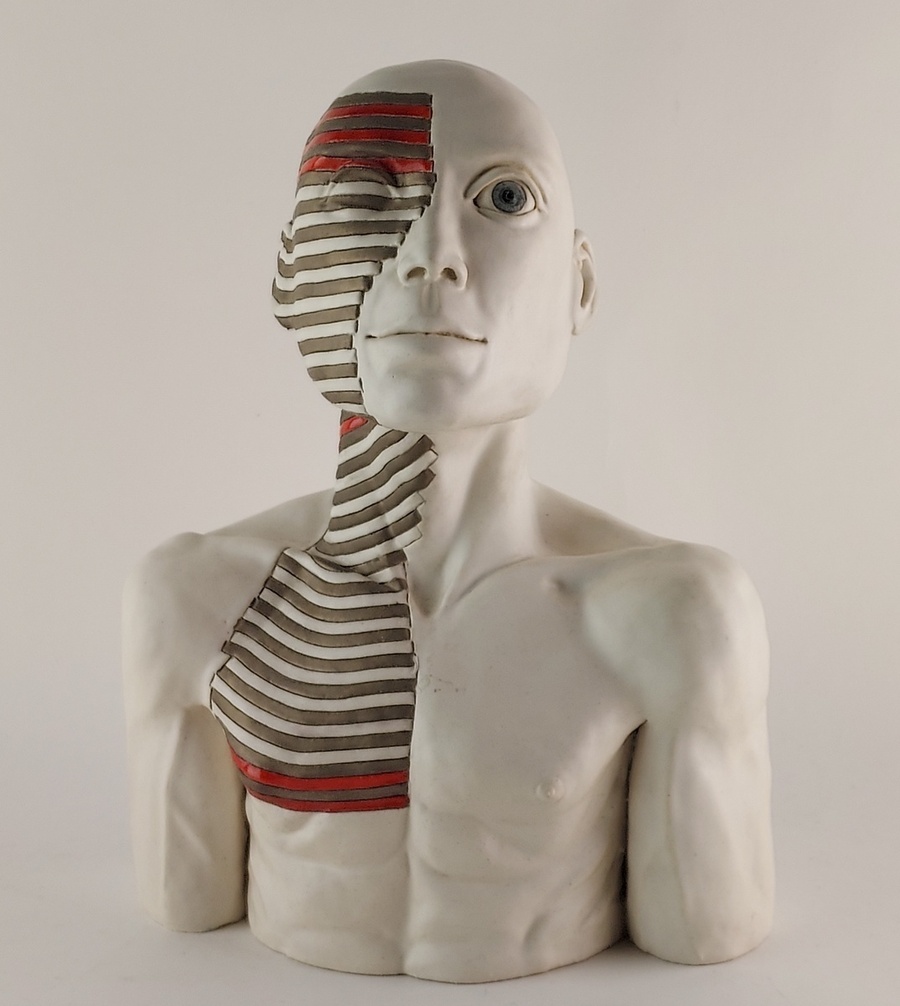 Keramische sculptuur van een buste met rood wit lijnenspel. Onderzijde gesigneerd en verzamelaars etiket. Ex Collectie J.W.N. van Agterbergh.