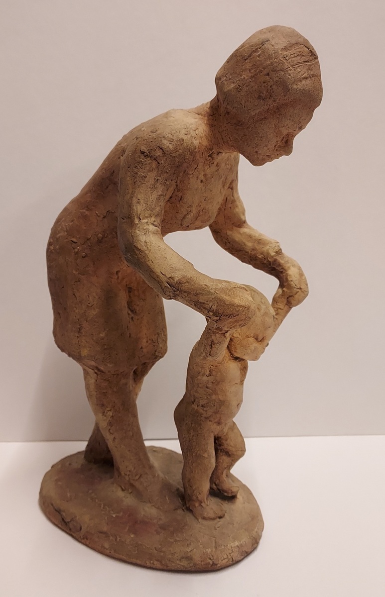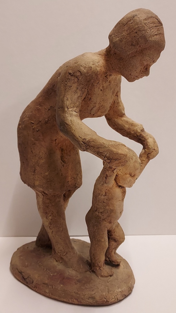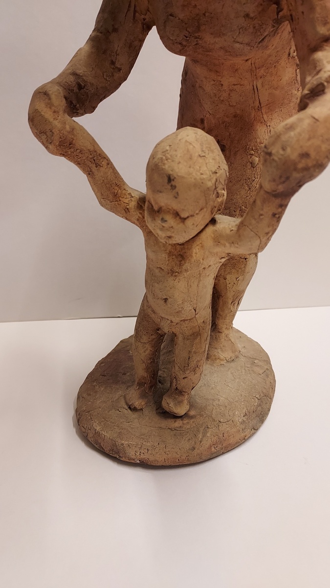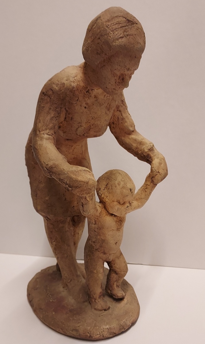 Aardewerken sculptuur naar ontwerp van Hanna Mobach. Moeder met kind. Gesigneerd op de voet.