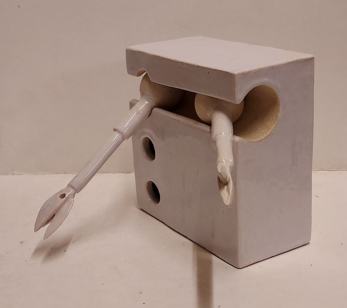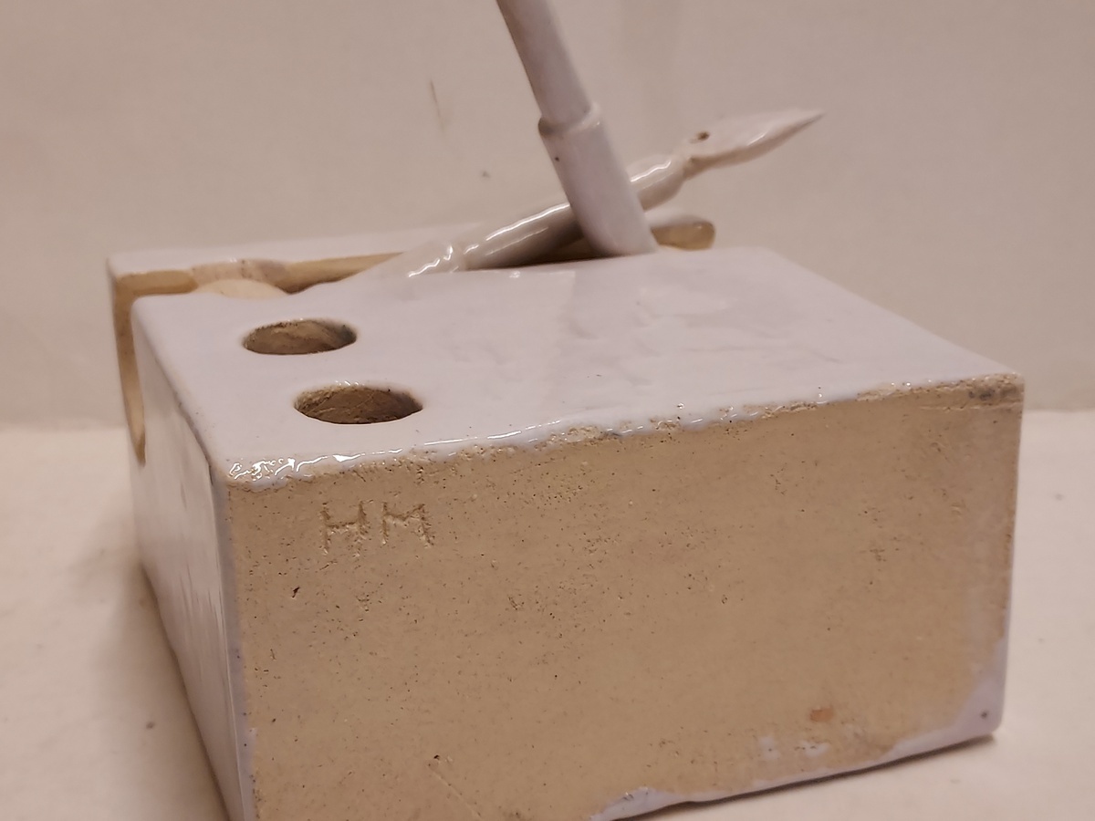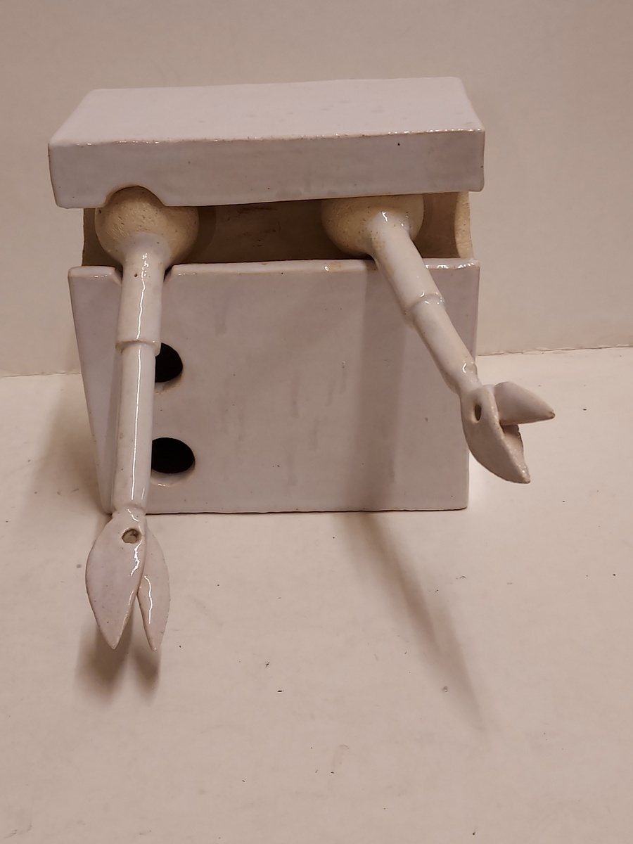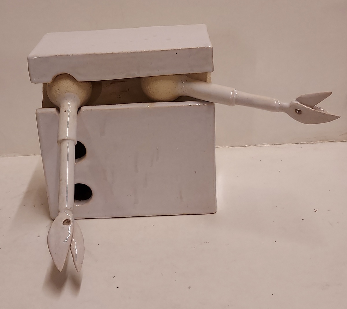 Keramische sculptuur met 2 beweegbare armen. Gesigneerd met monogram.
