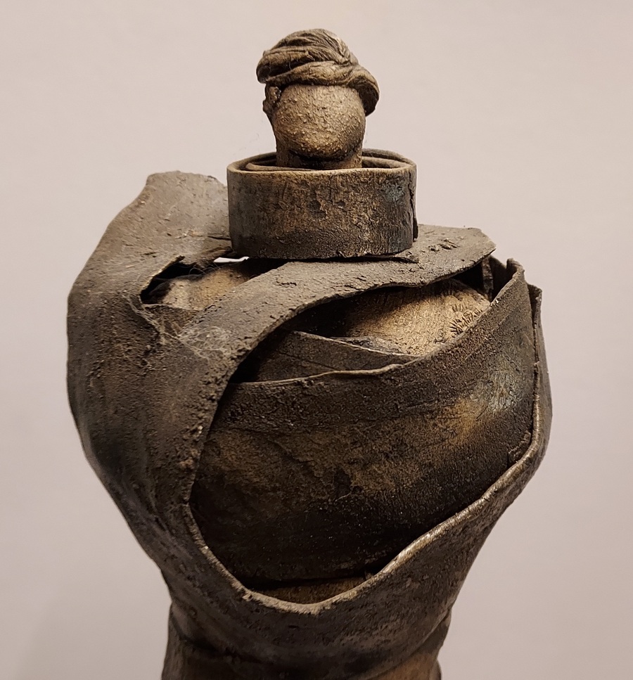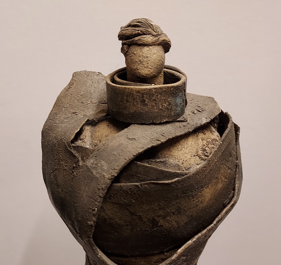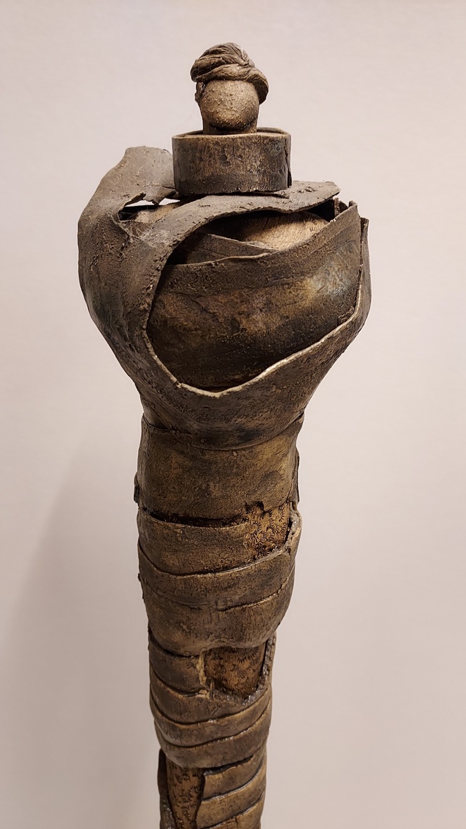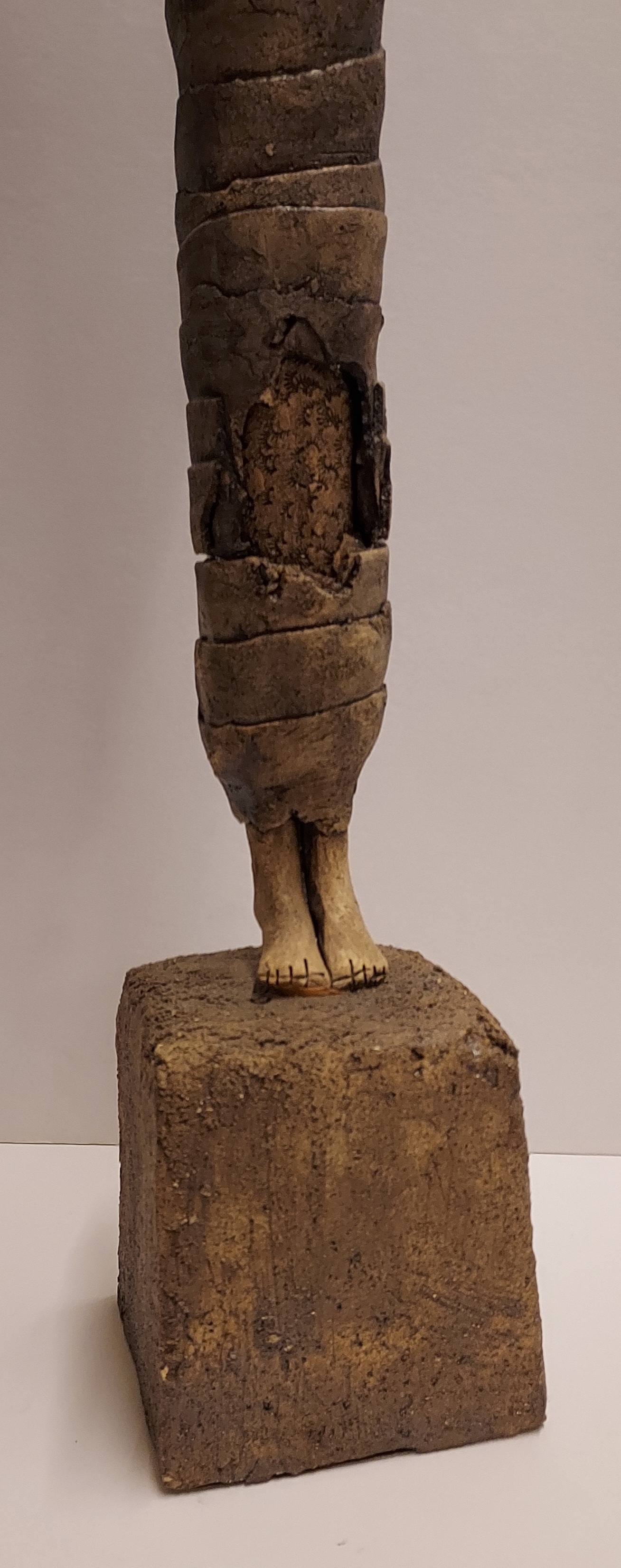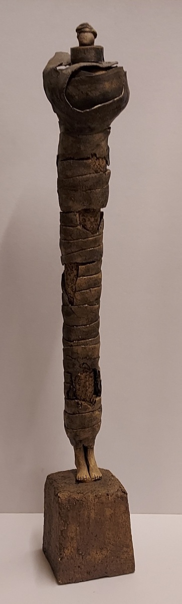Keramische sculptuur van een staand figuur deels ingewikkeld, staande op vierkant basement.