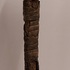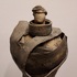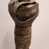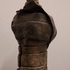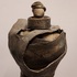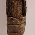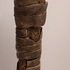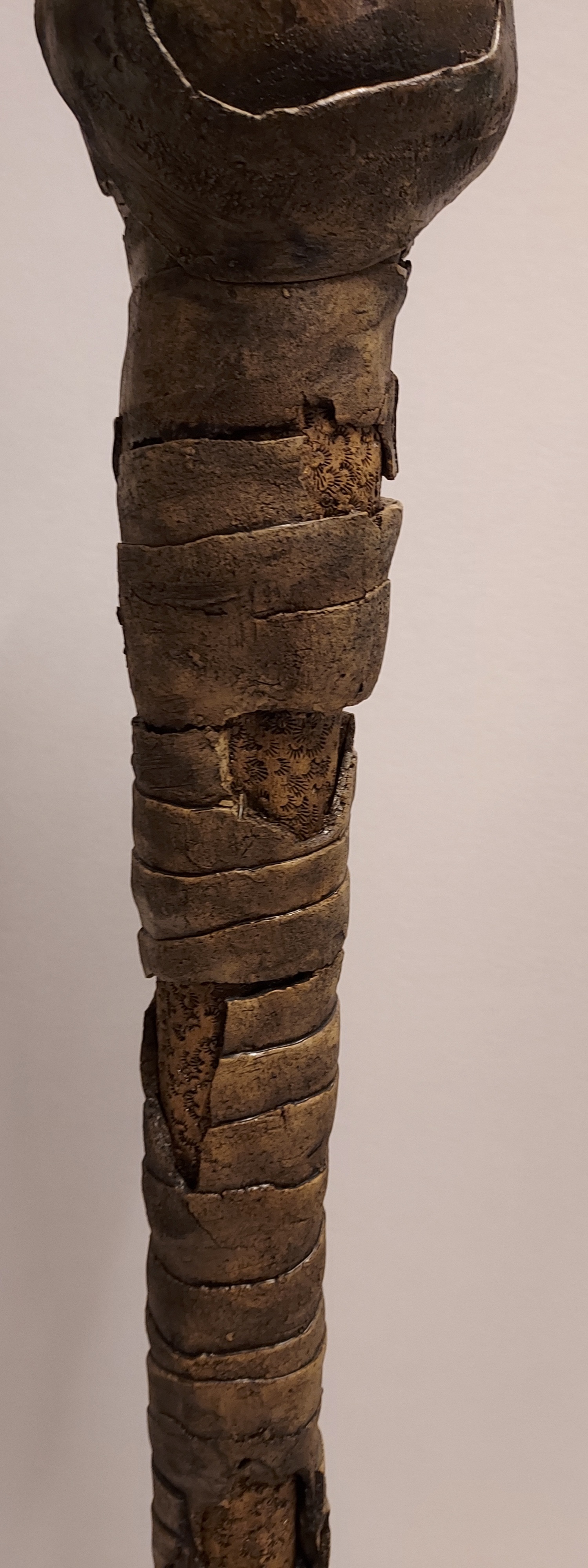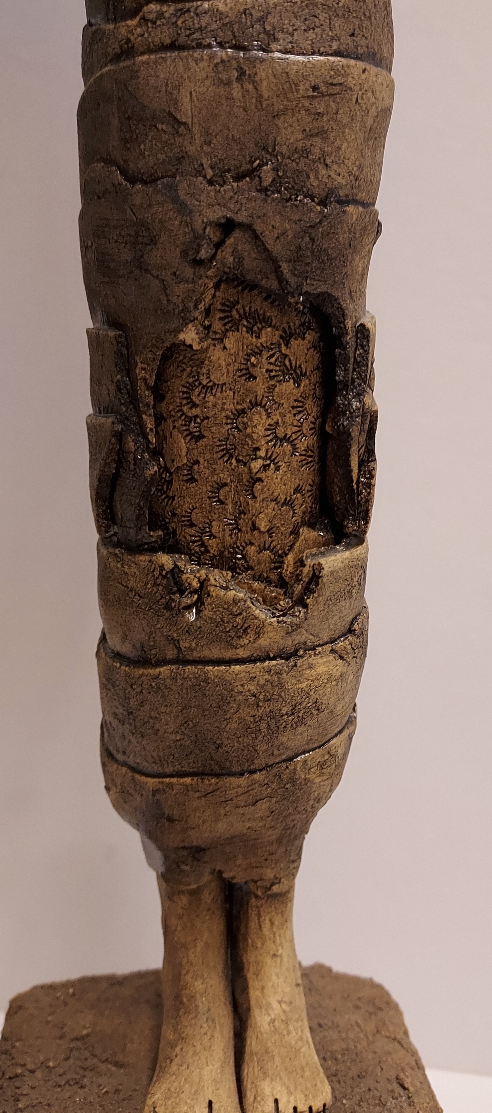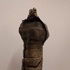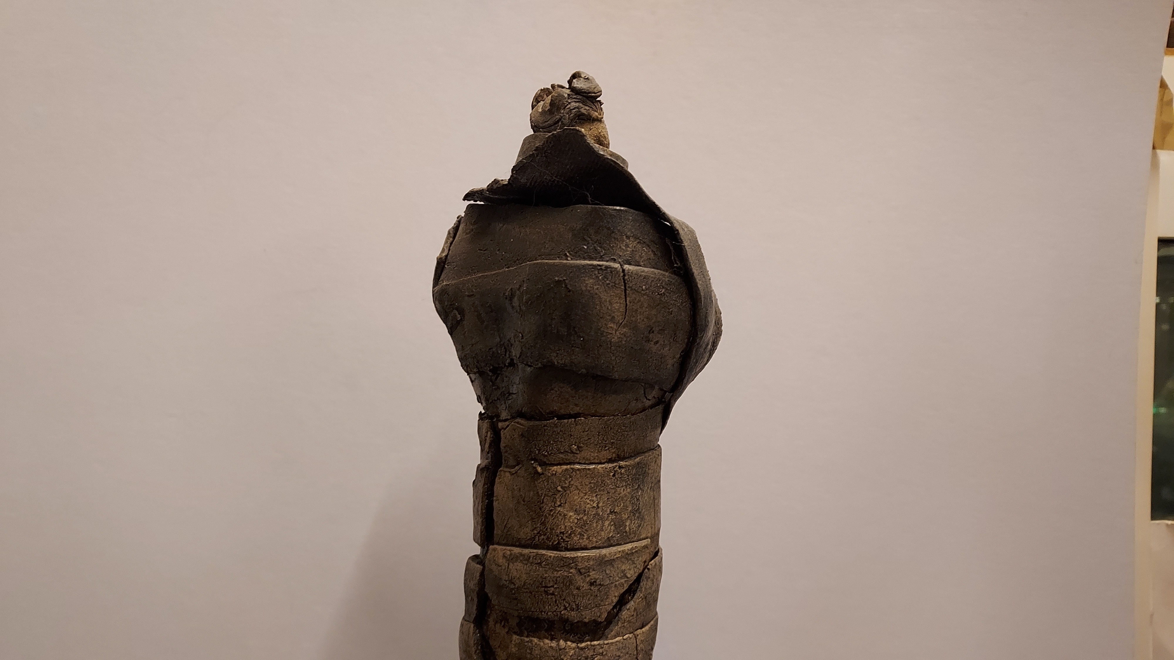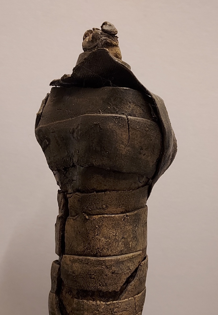 Keramische sculptuur van een staand figuur deels ingewikkeld, staande op vierkant basement.