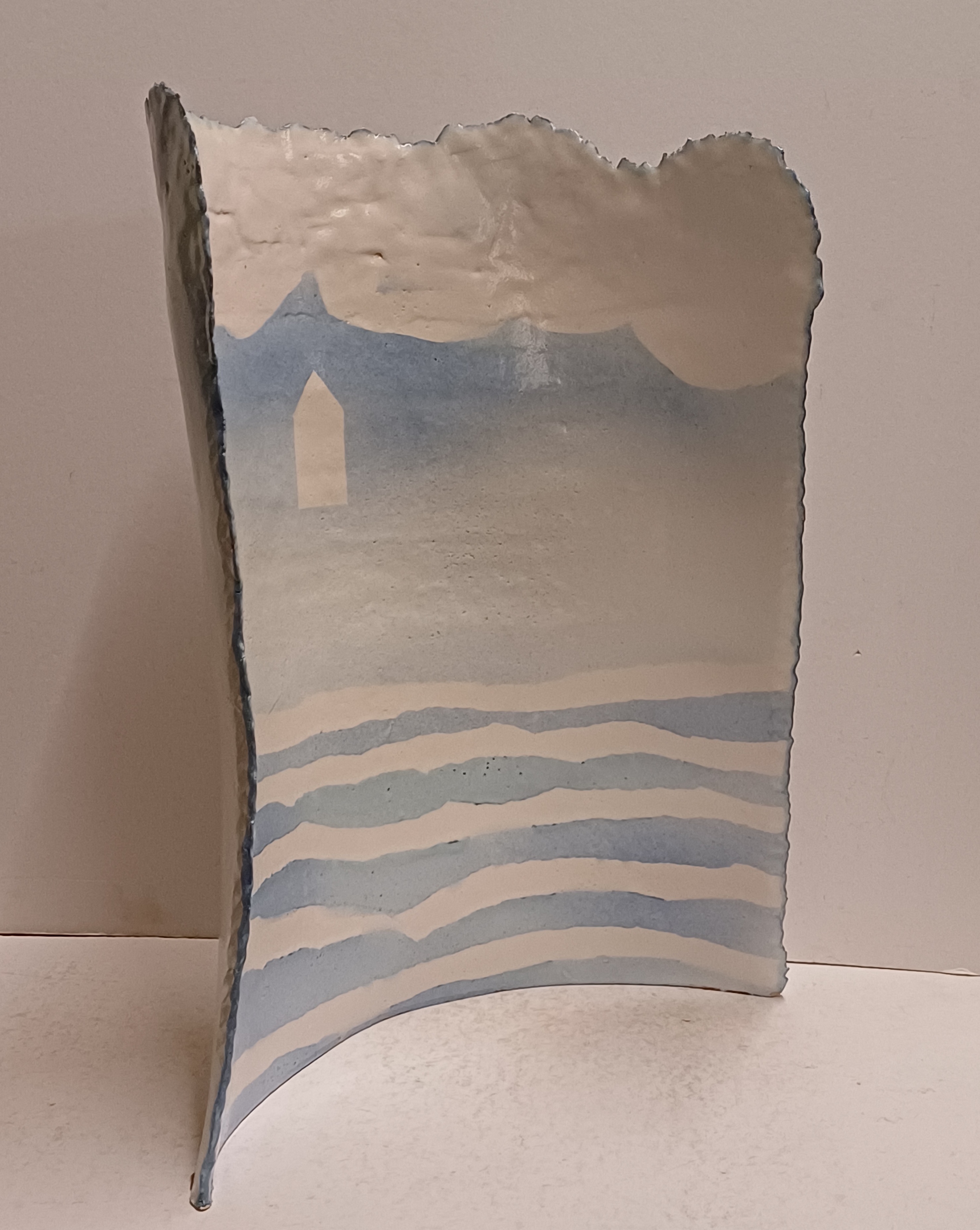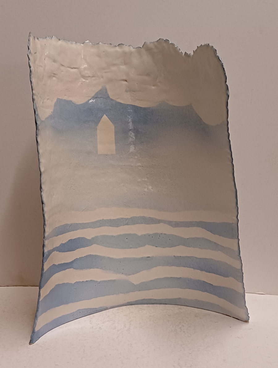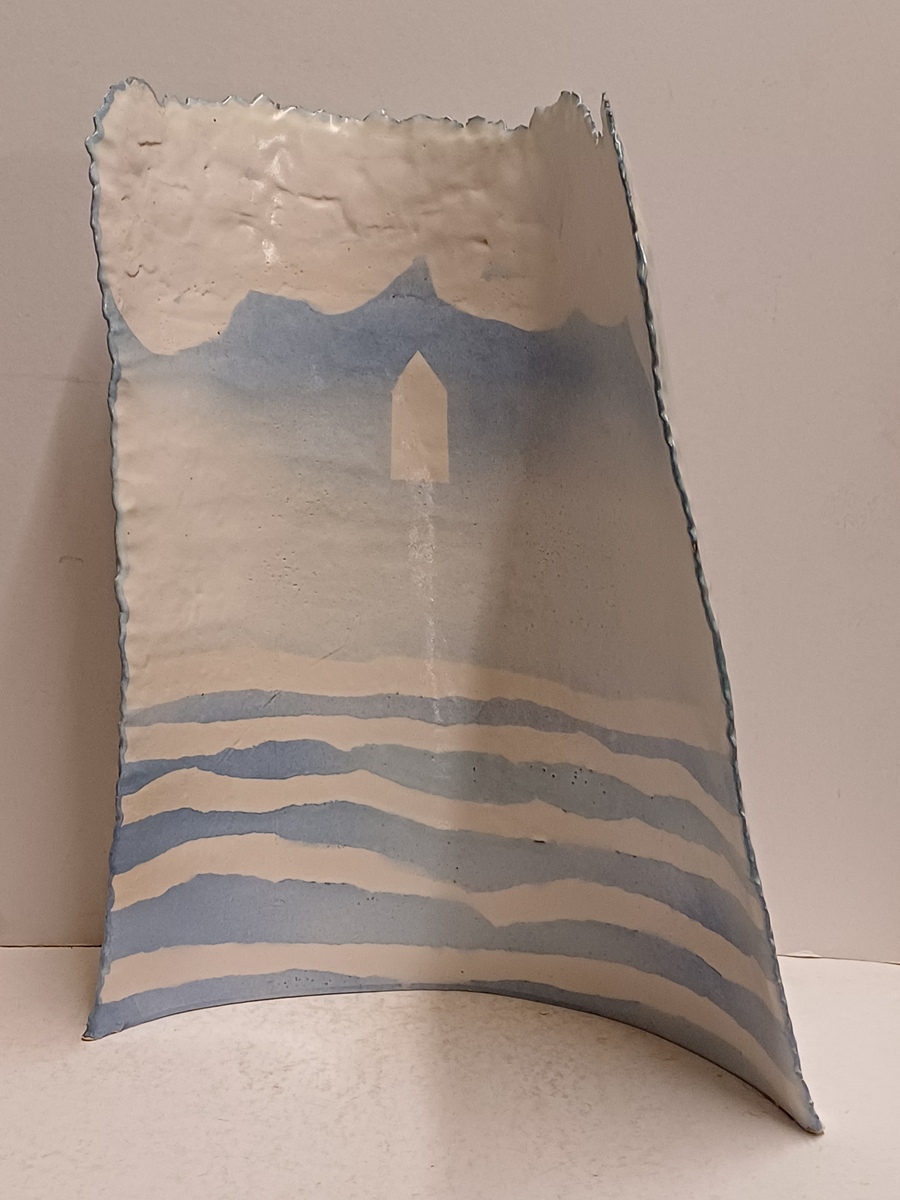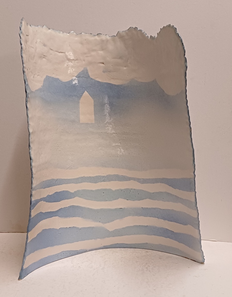 Aardewerken gebogen plaat met blauw wit landschappelijk decor op voor en achterzijde. Niet gesigneerd