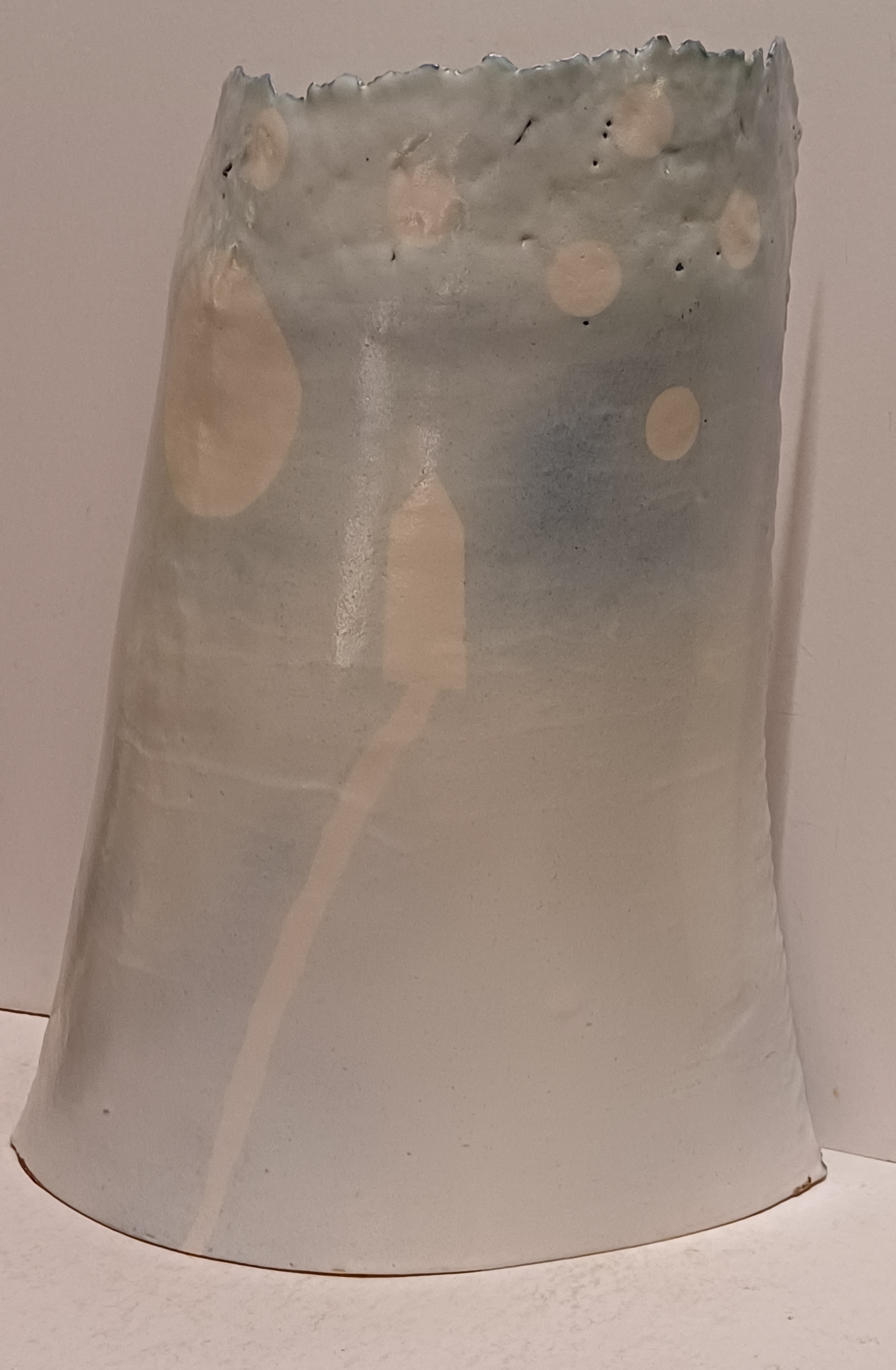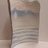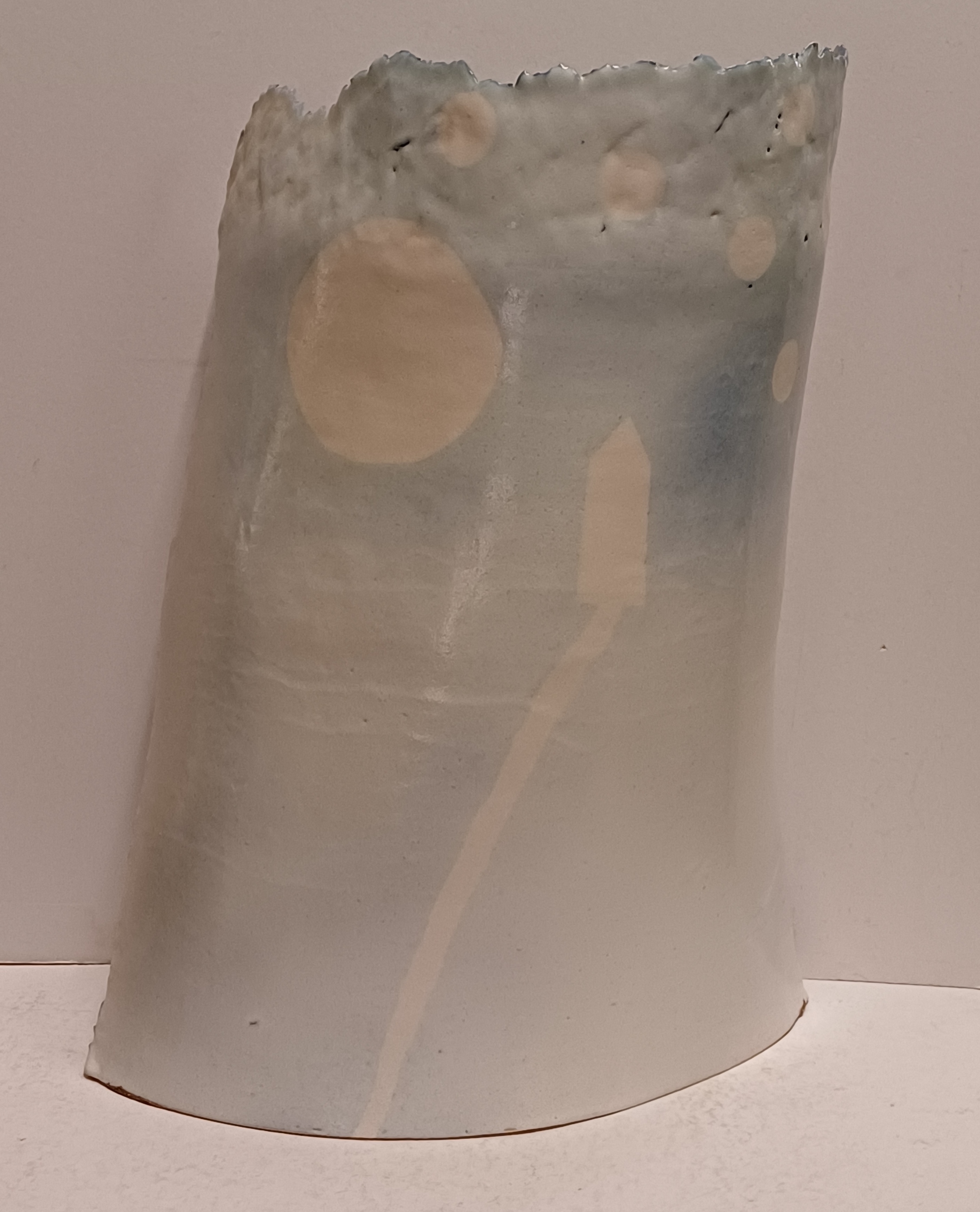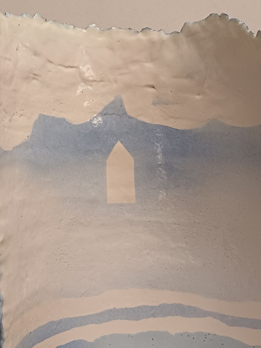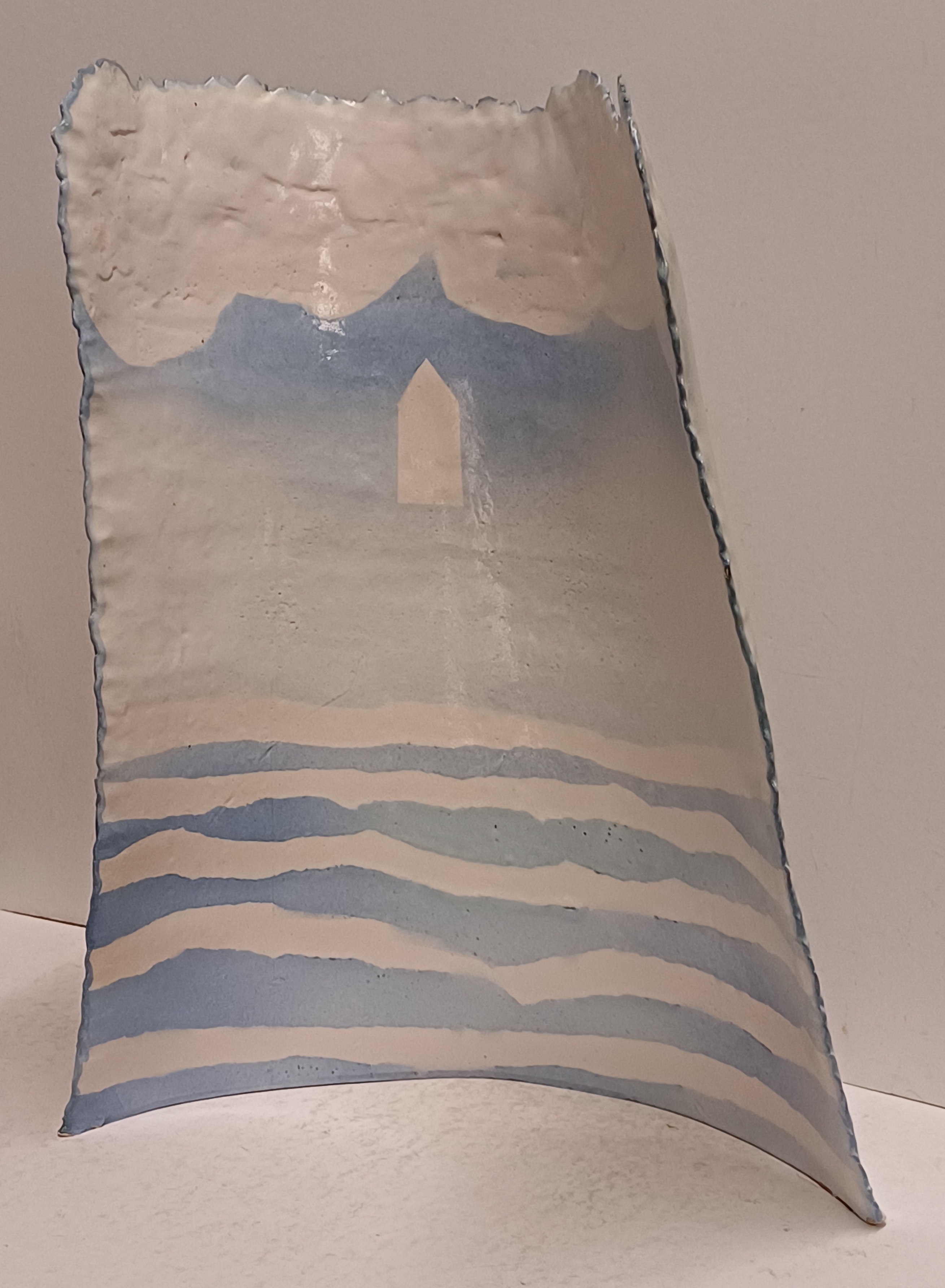Aardewerken gebogen plaat met blauw wit landschappelijk decor op voor en achterzijde. Niet gesigneerd