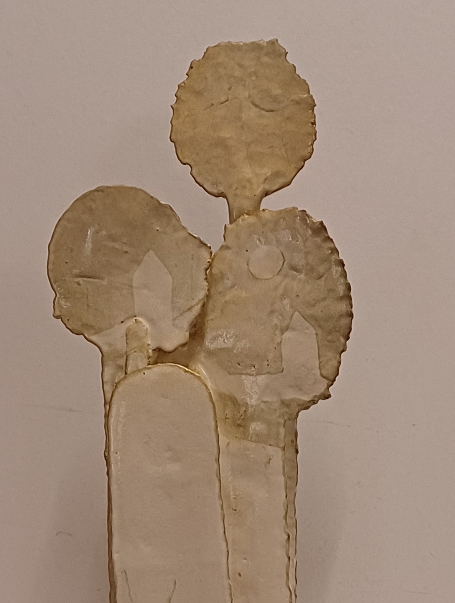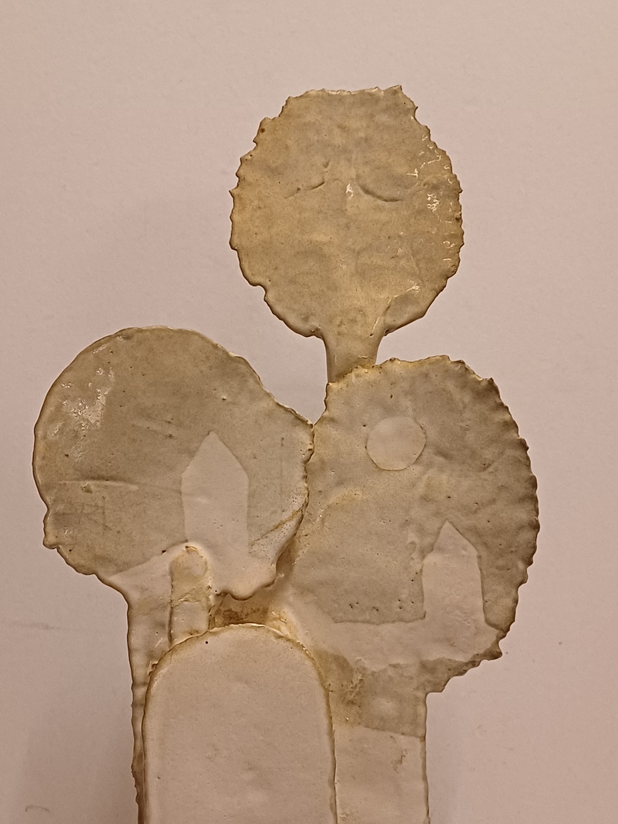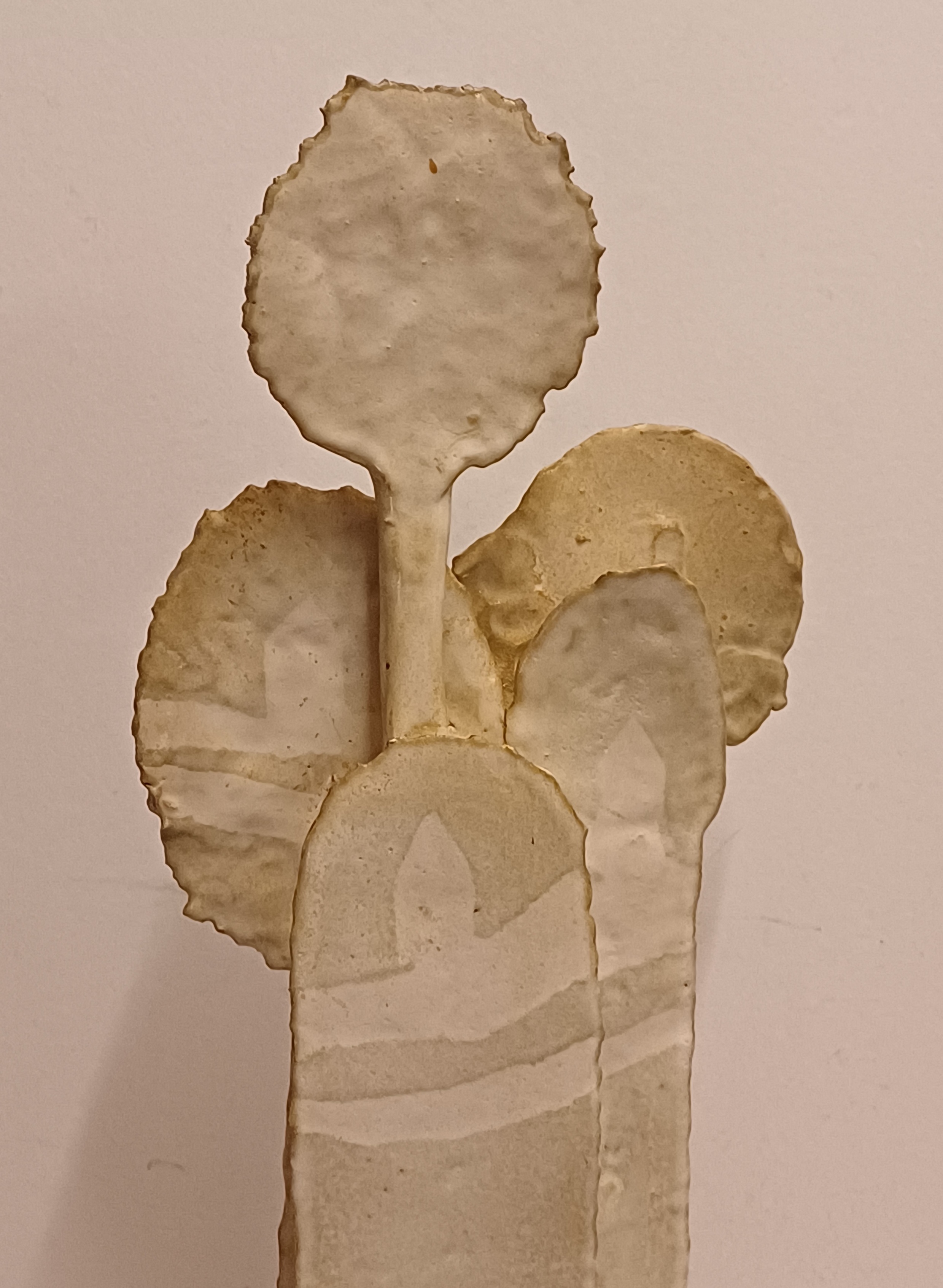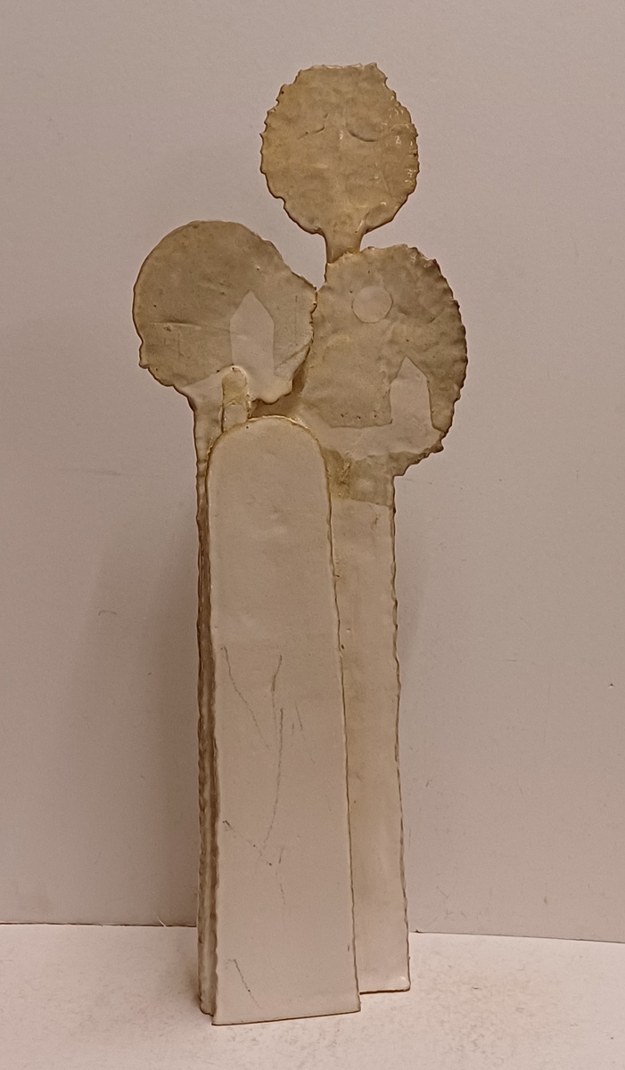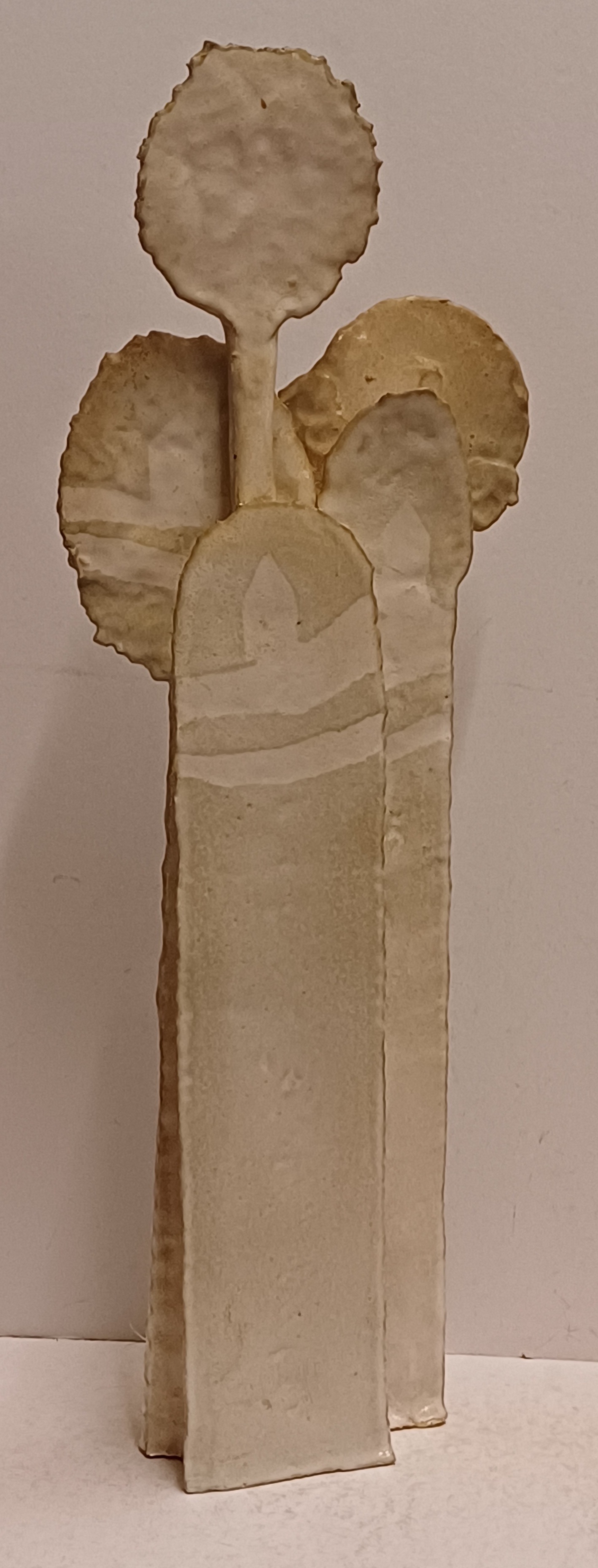 Uit platen opgebouwde sculptuur met decor van huisjes en 3 bomen op pilaren. Onderzijde gesigneerd