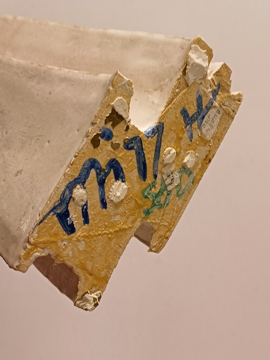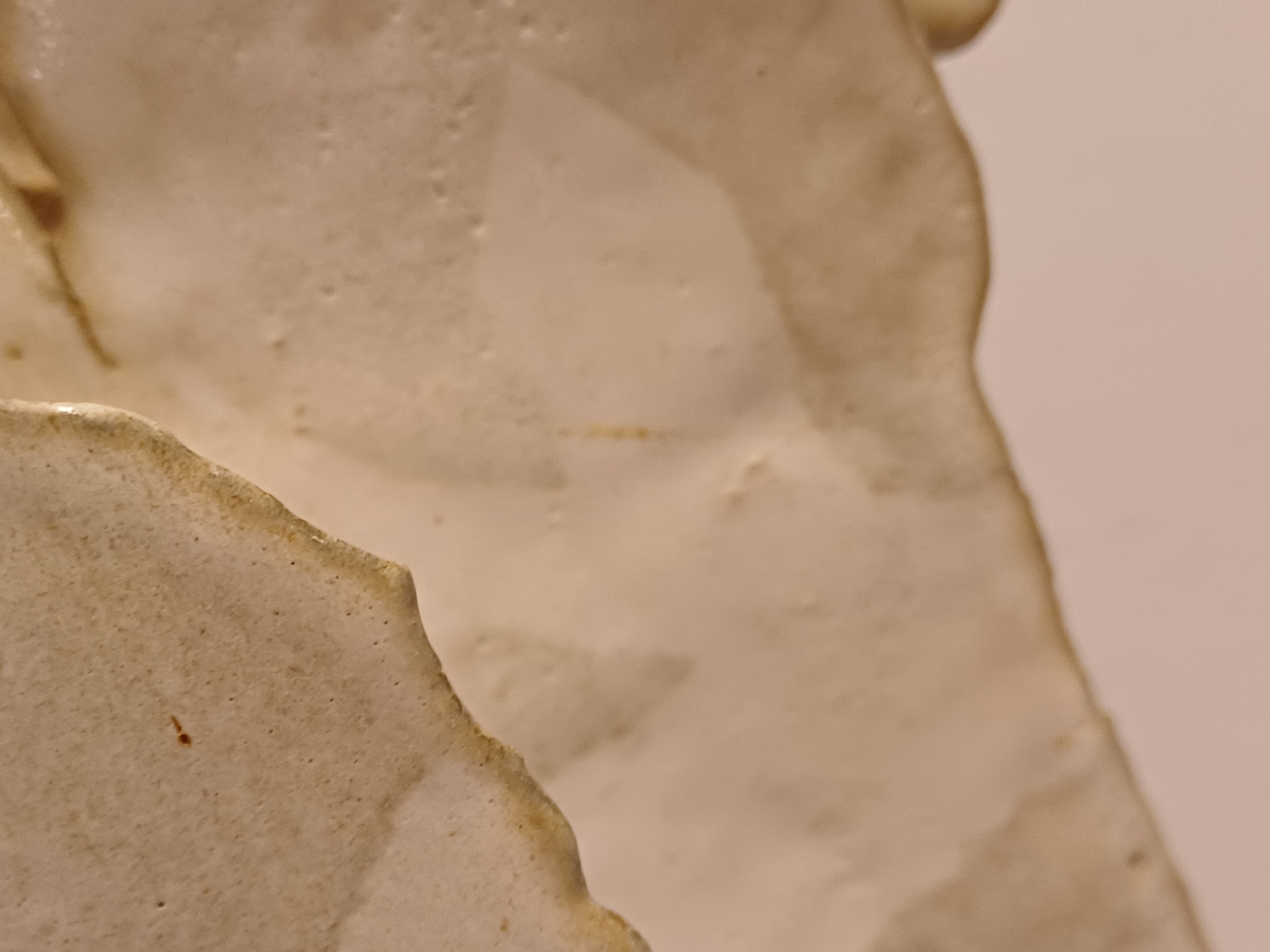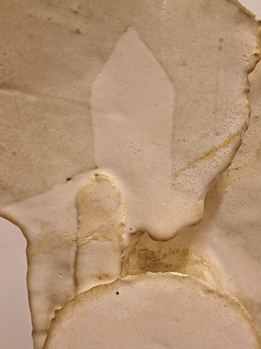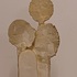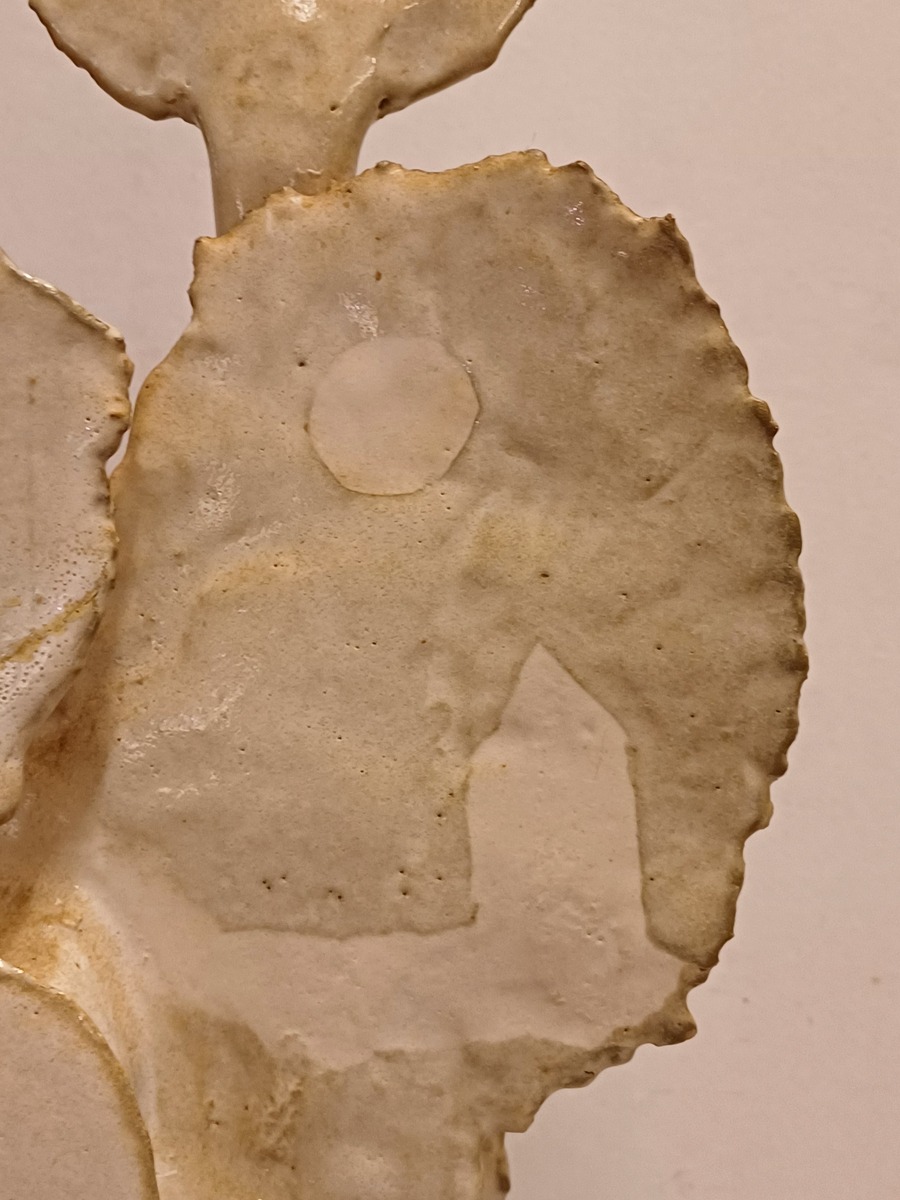 Uit platen opgebouwde sculptuur met decor van huisjes en 3 bomen op pilaren. Onderzijde gesigneerd