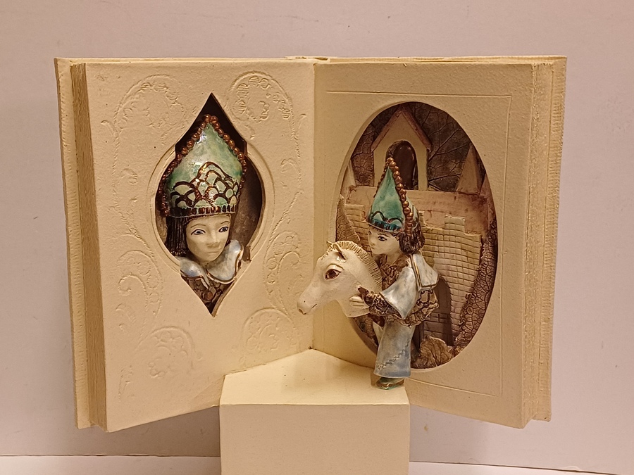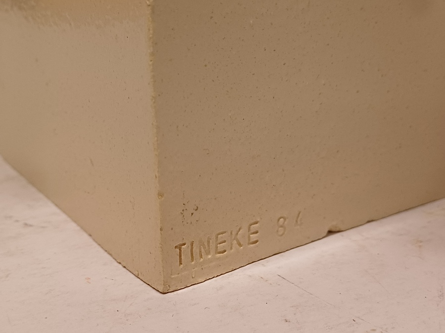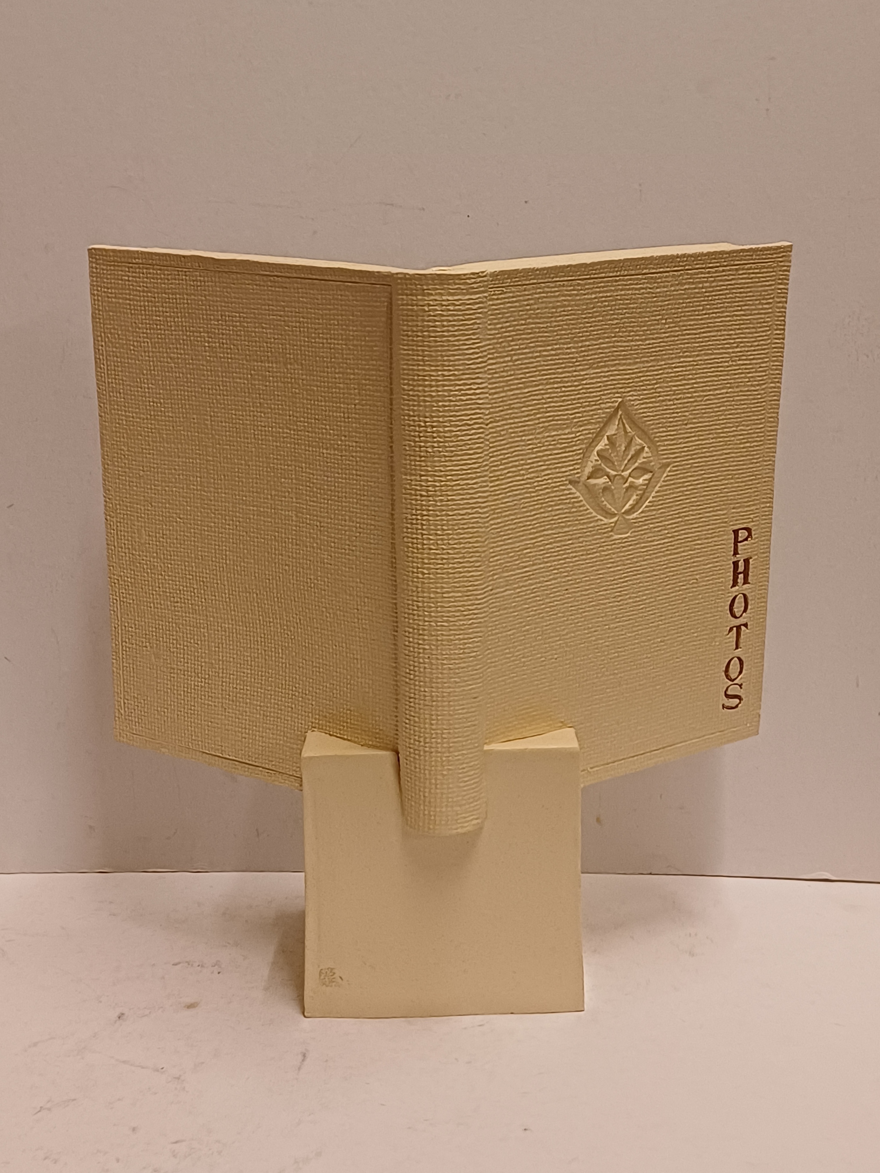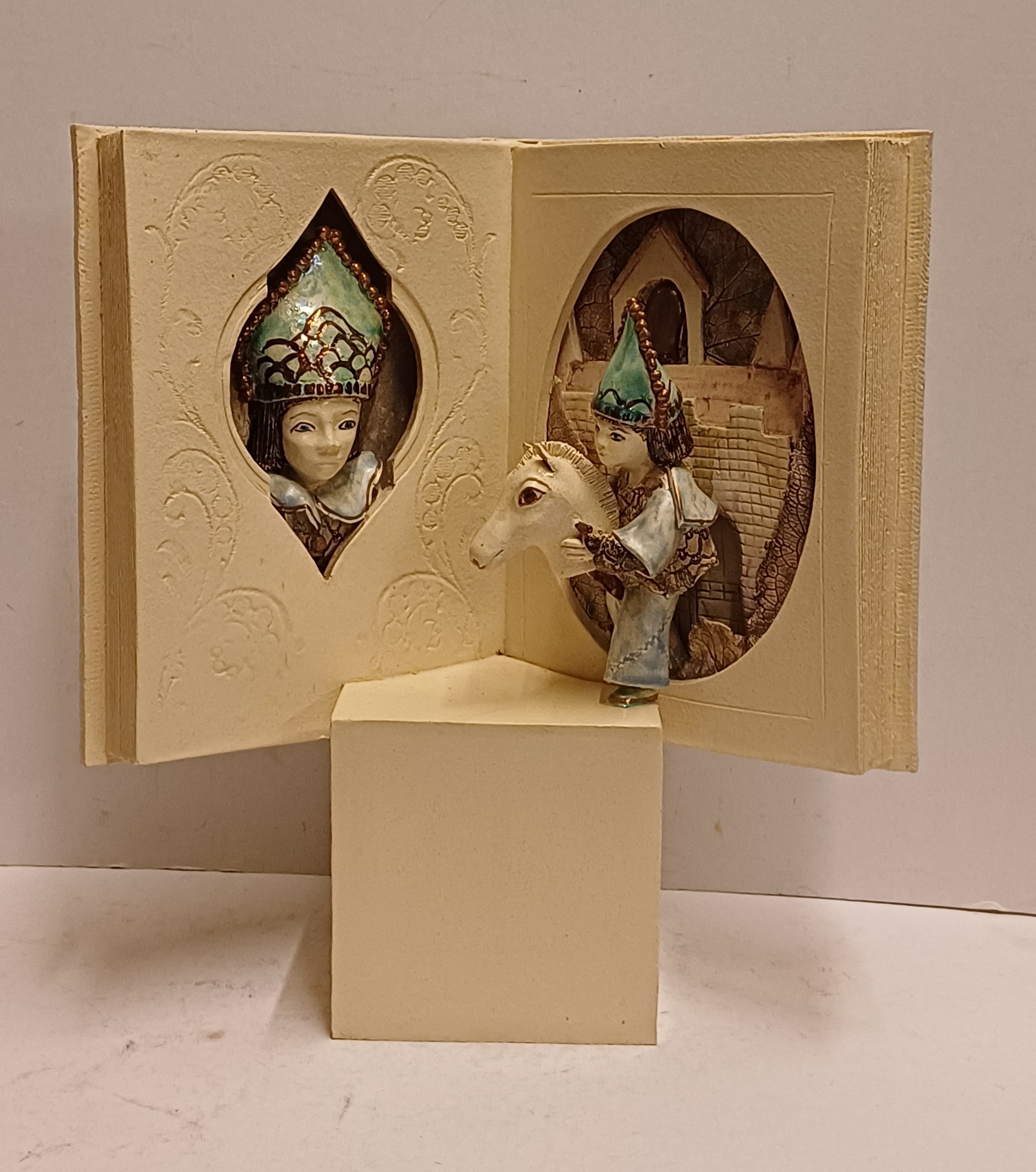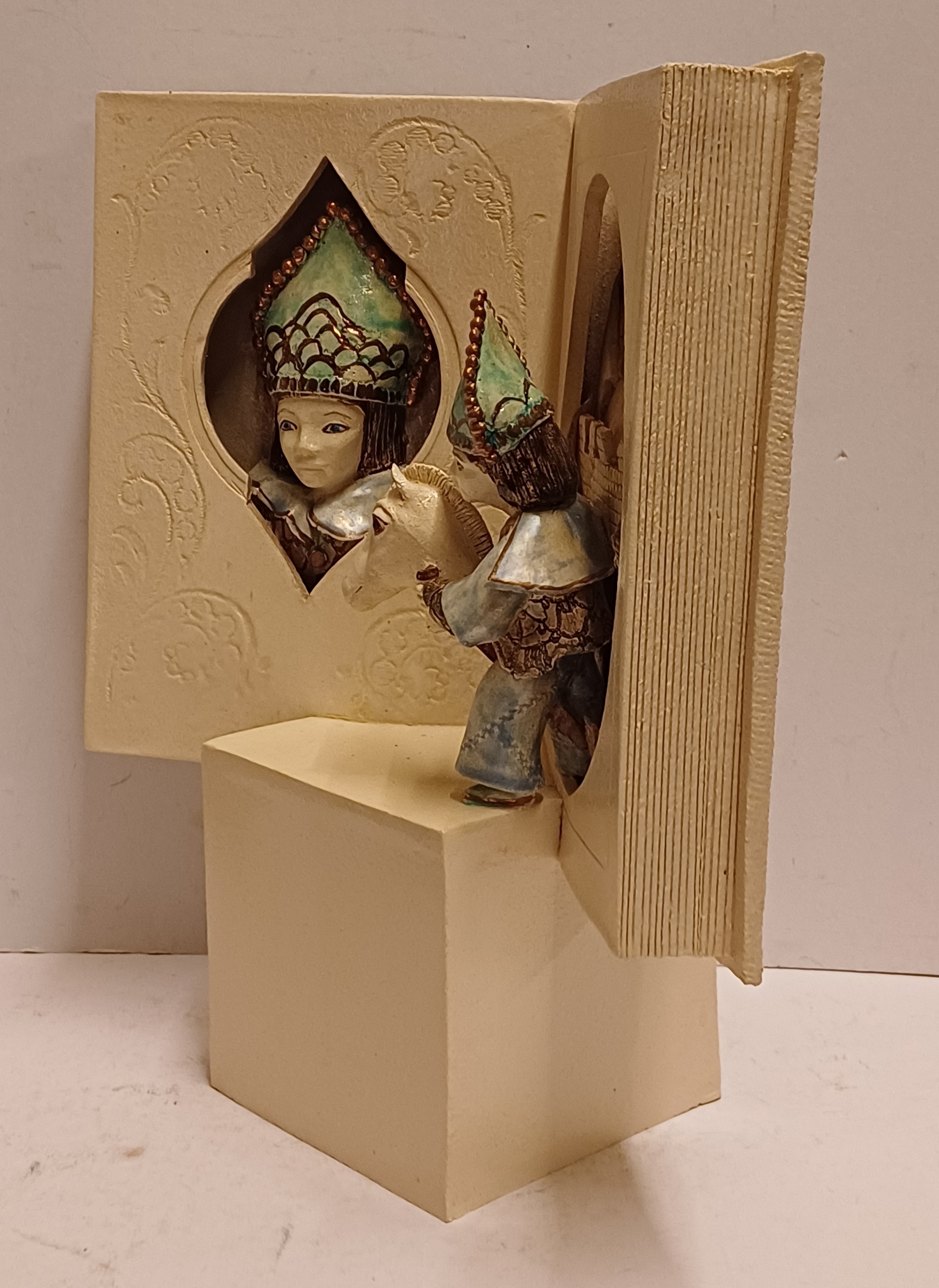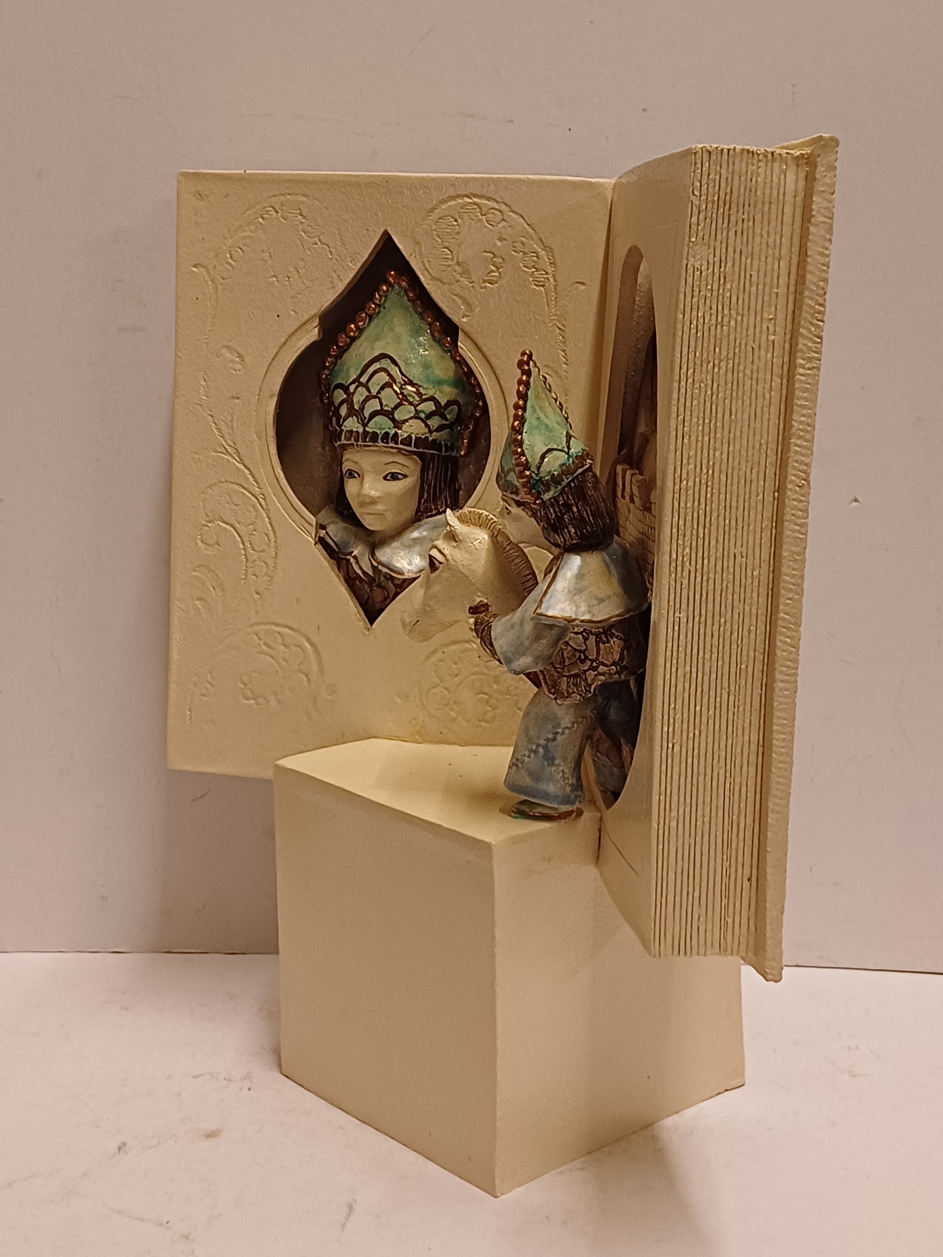 Aardewerken sculptuur van een opengeslagen fotoalbum waaruit een meisje met stokpaardje komt en een ander toeschouwt. Zijkant van het voetstuk gesigneerd Tineke '84.