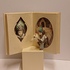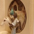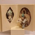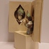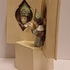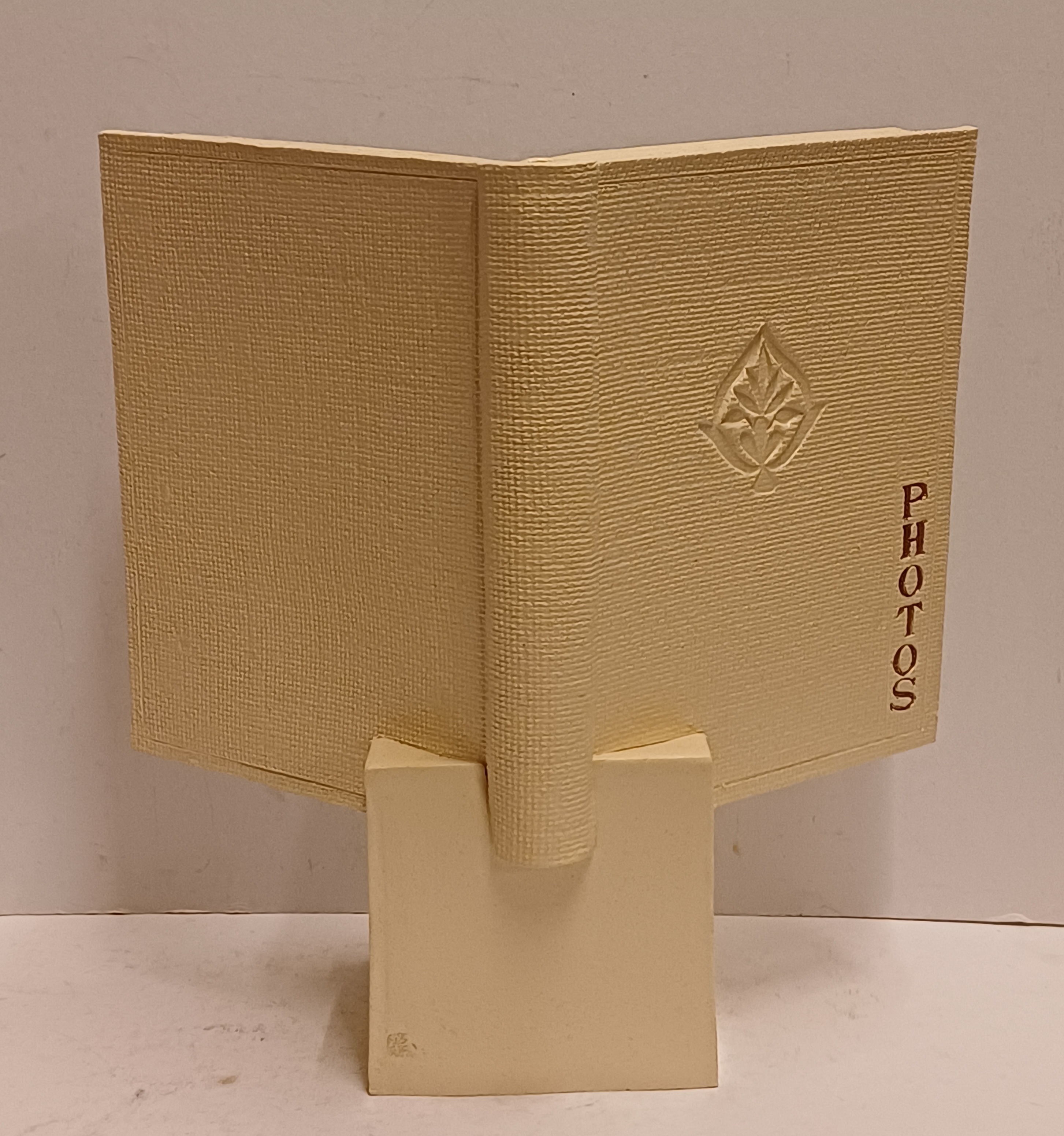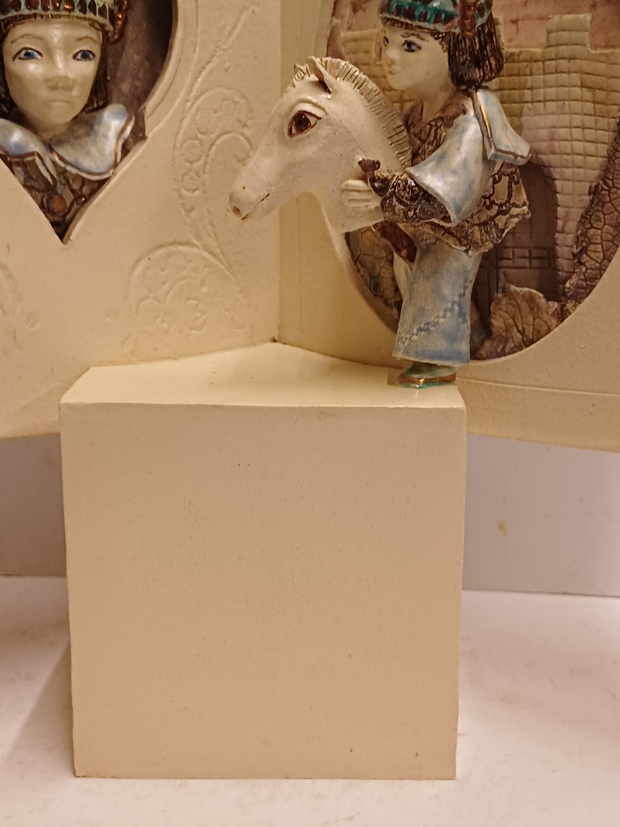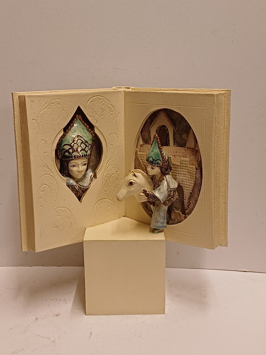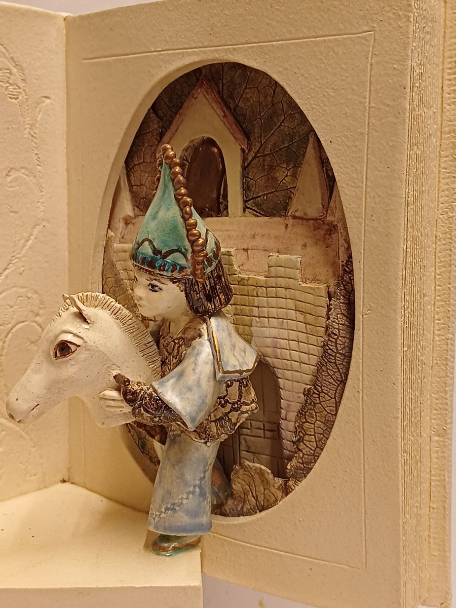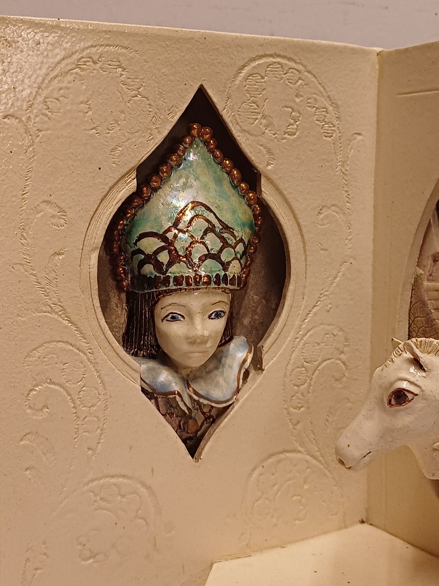 Aardewerken sculptuur van een opengeslagen fotoalbum waaruit een meisje met stokpaardje komt en een ander toeschouwt. Zijkant van het voetstuk gesigneerd Tineke '84.