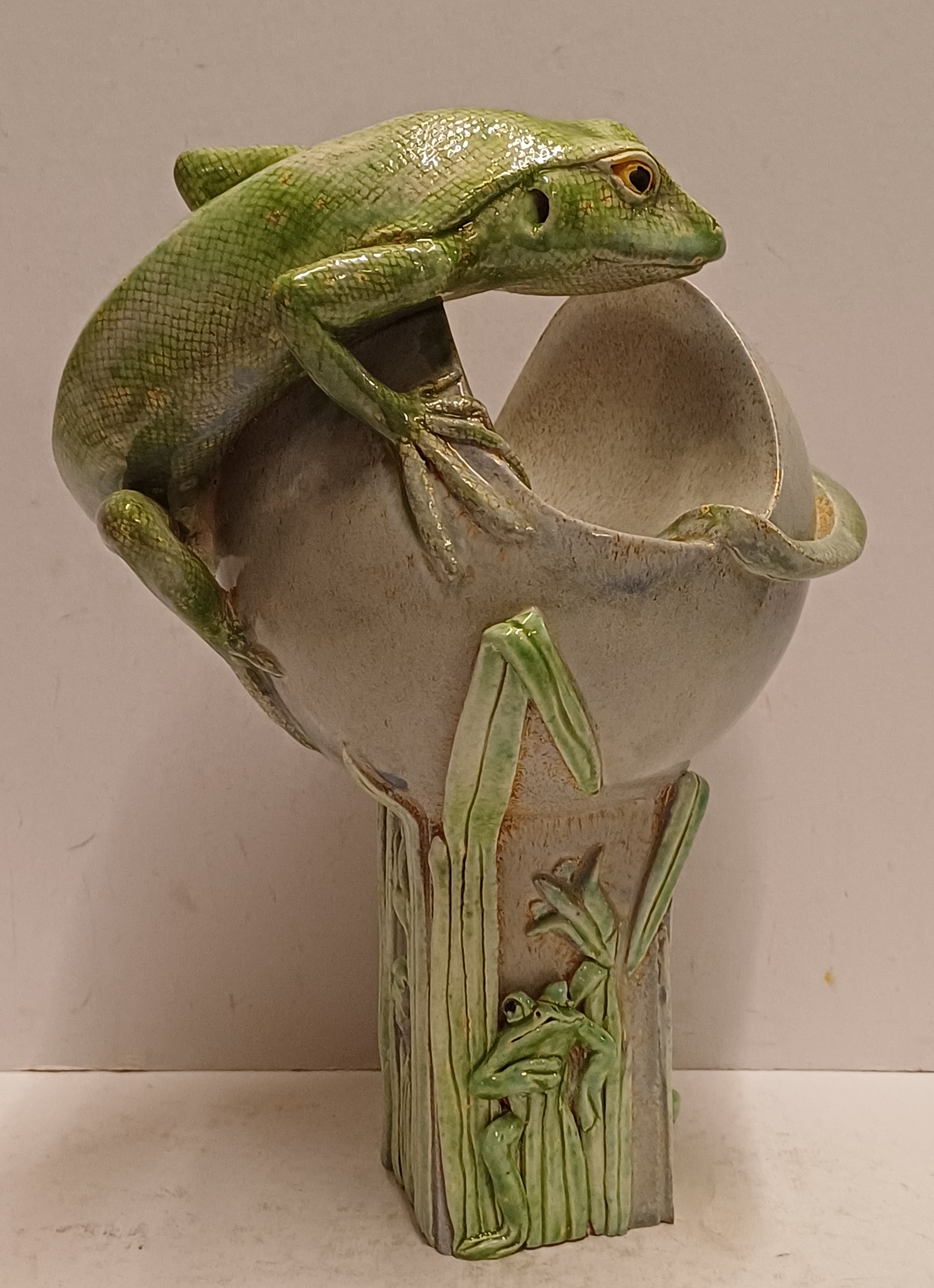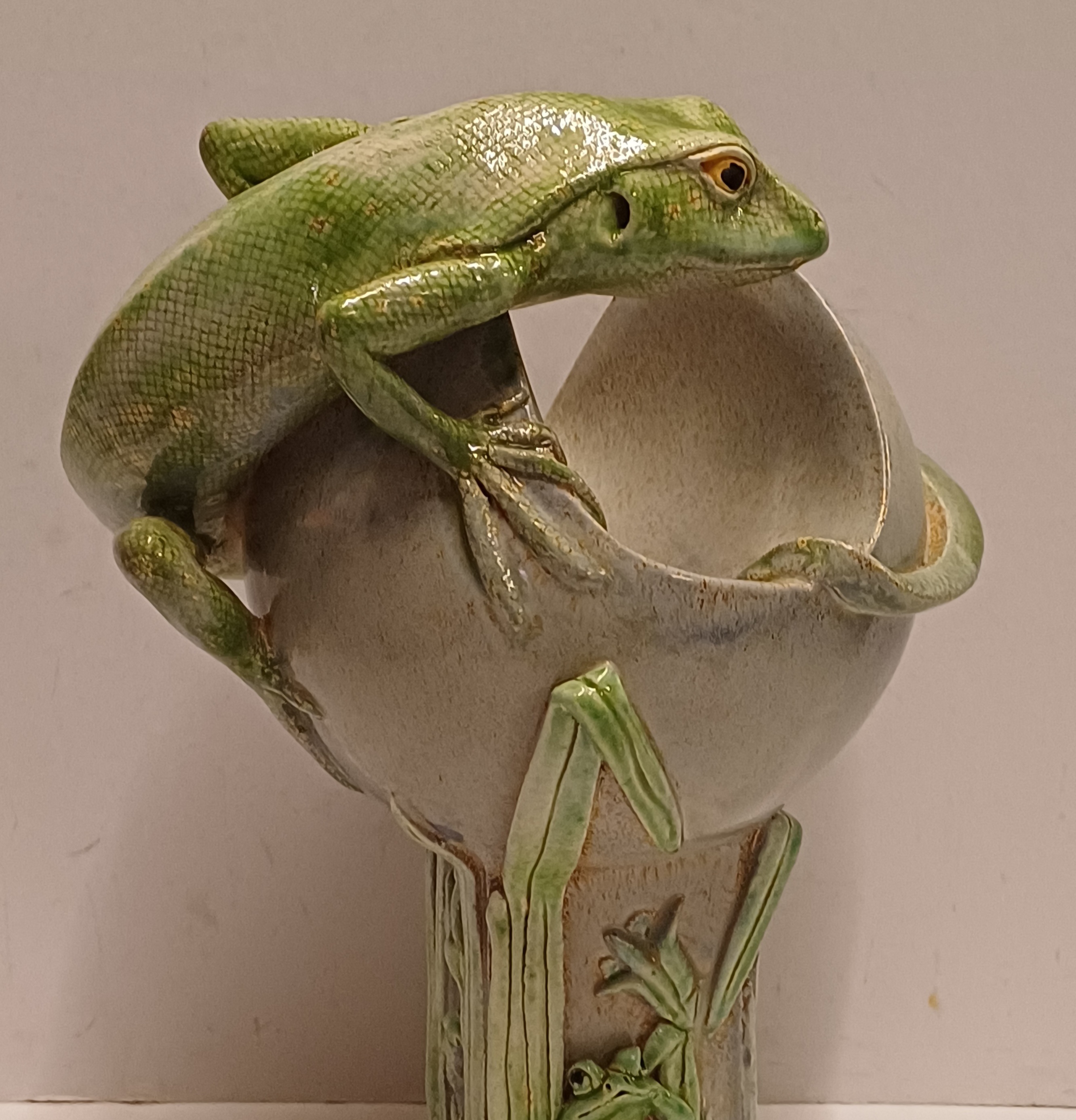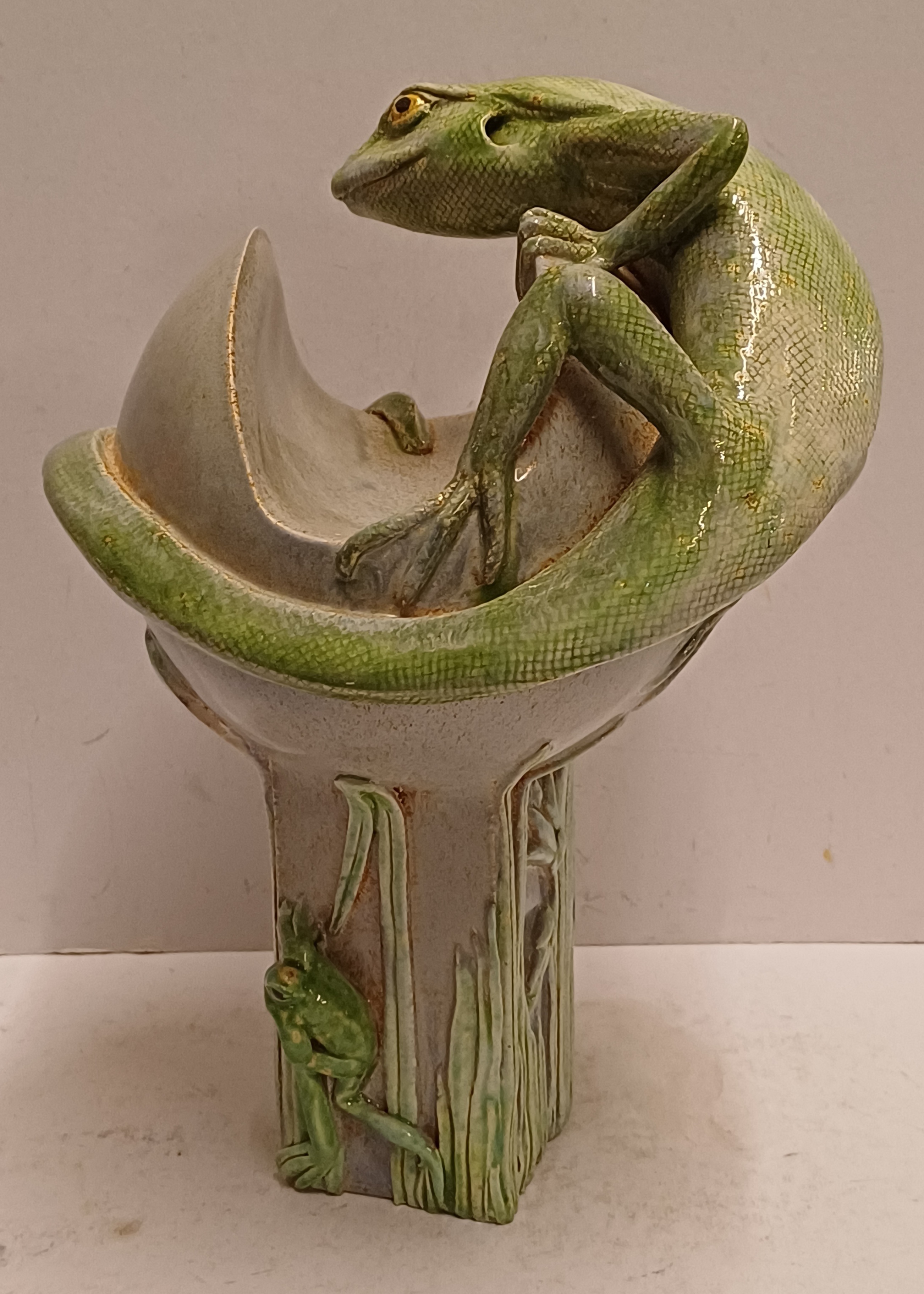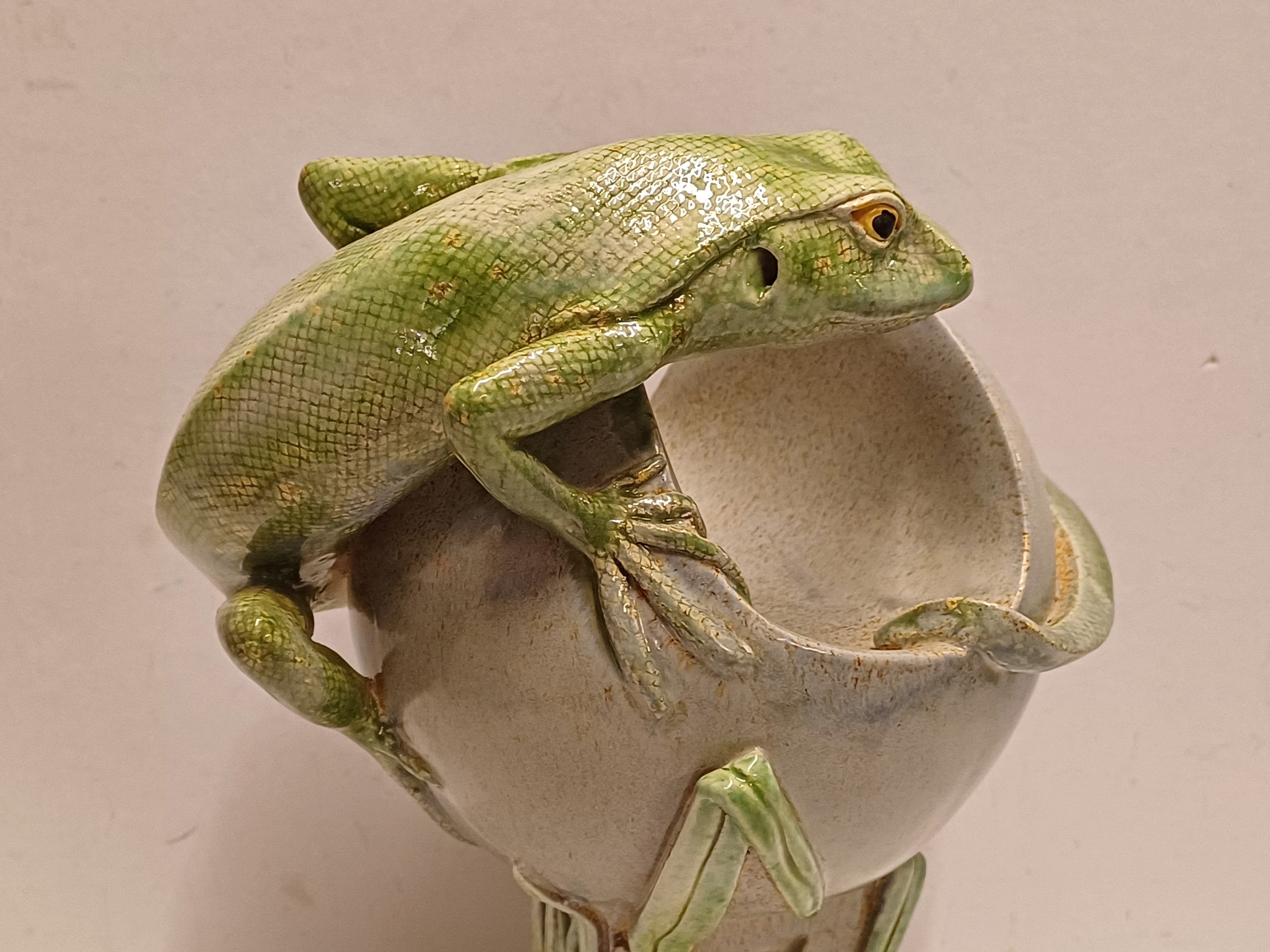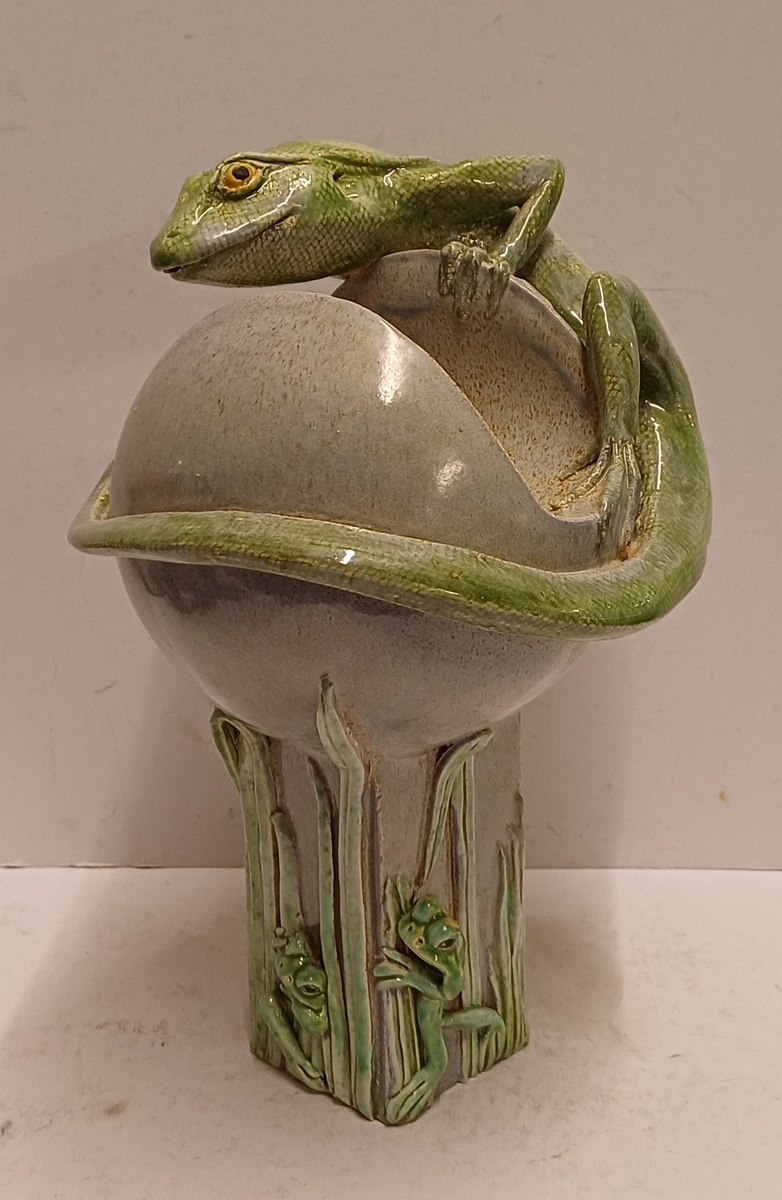 Aardewerken sculptuur van een salamander die een bol beklimt. De zijkanten gedecoreerd met riet met daarin verstopte kikkers. Ogenschijnlijk niet gesigneerd.