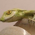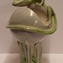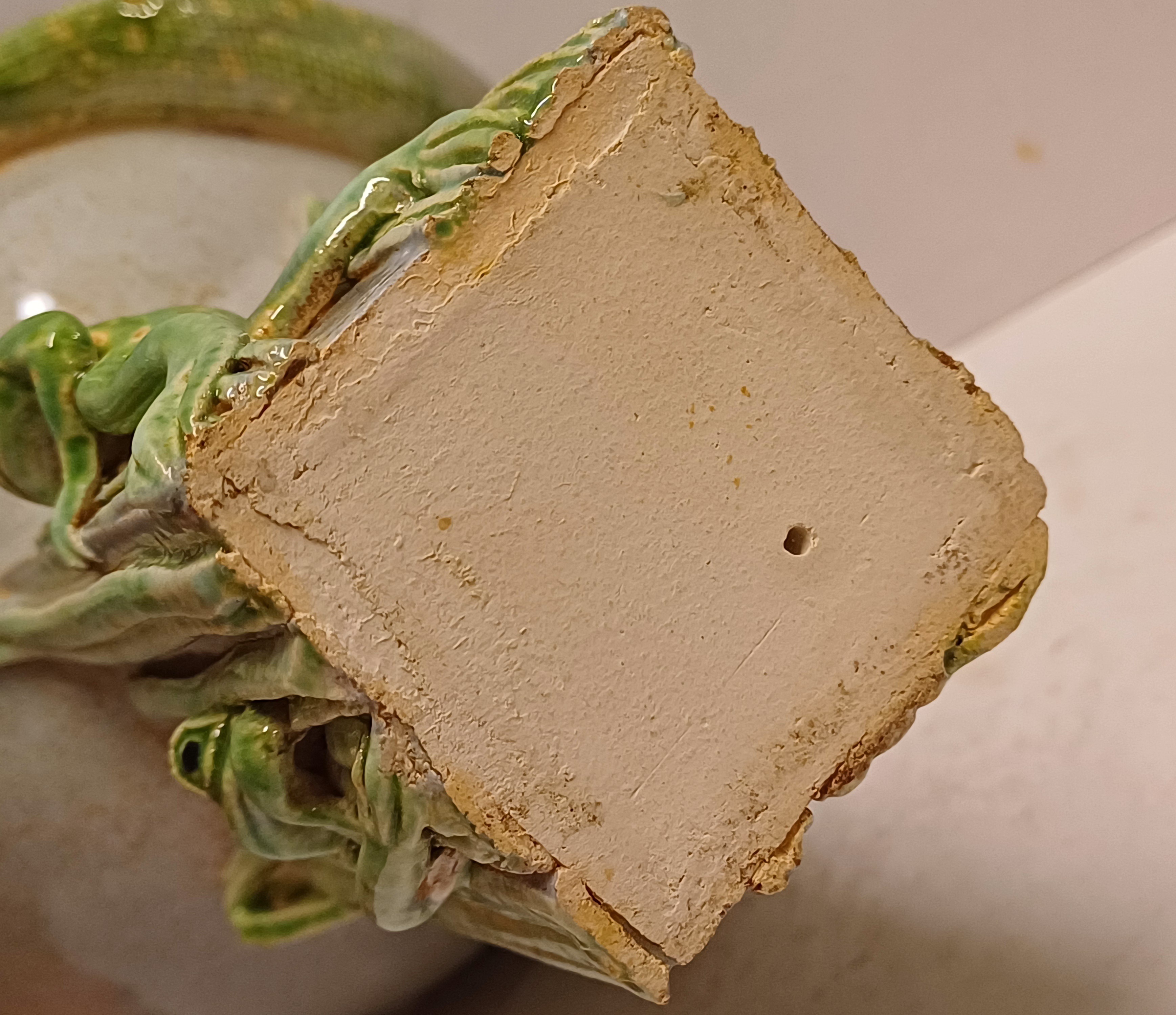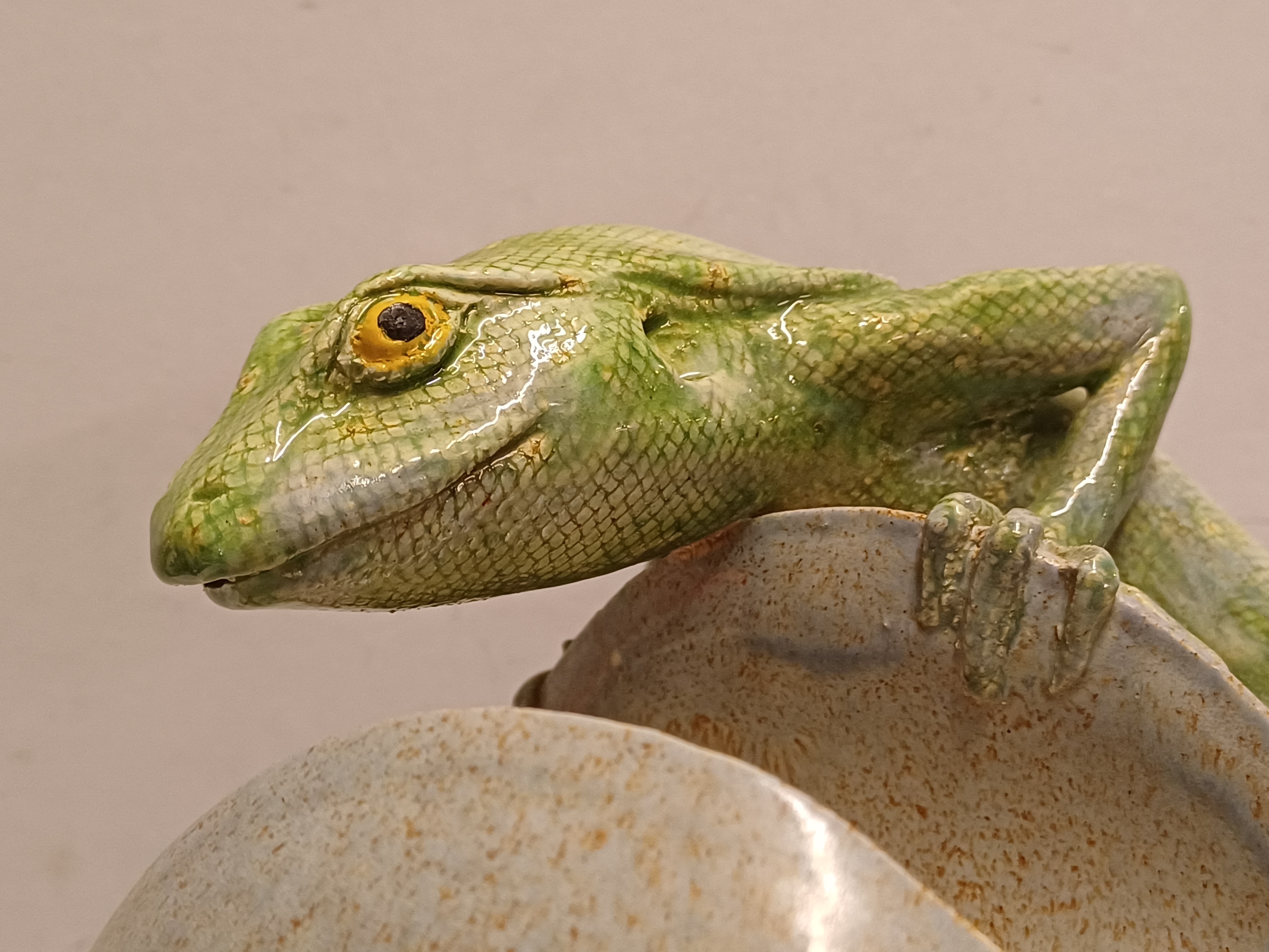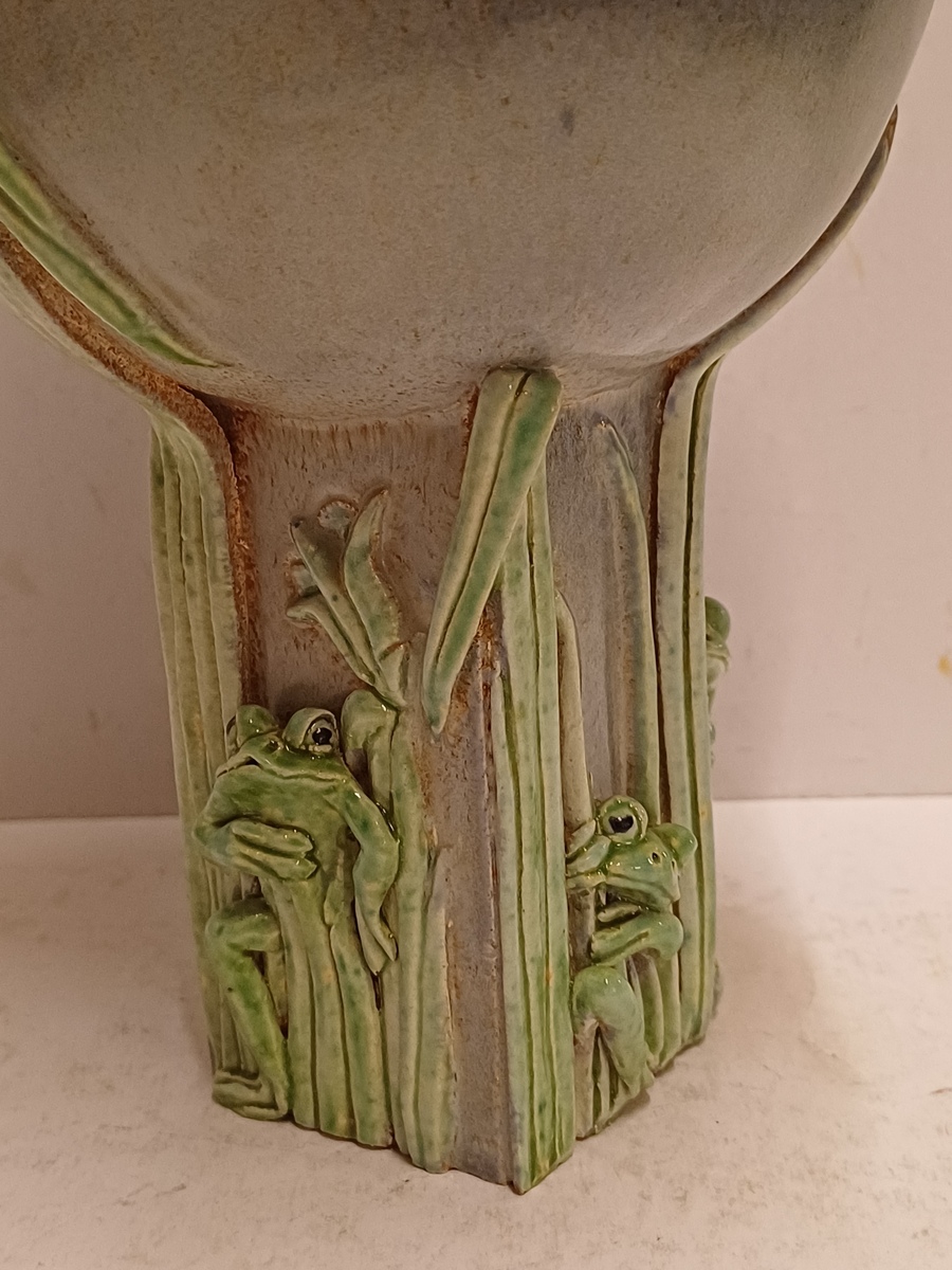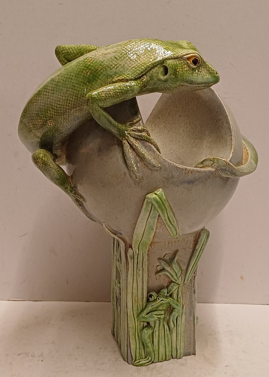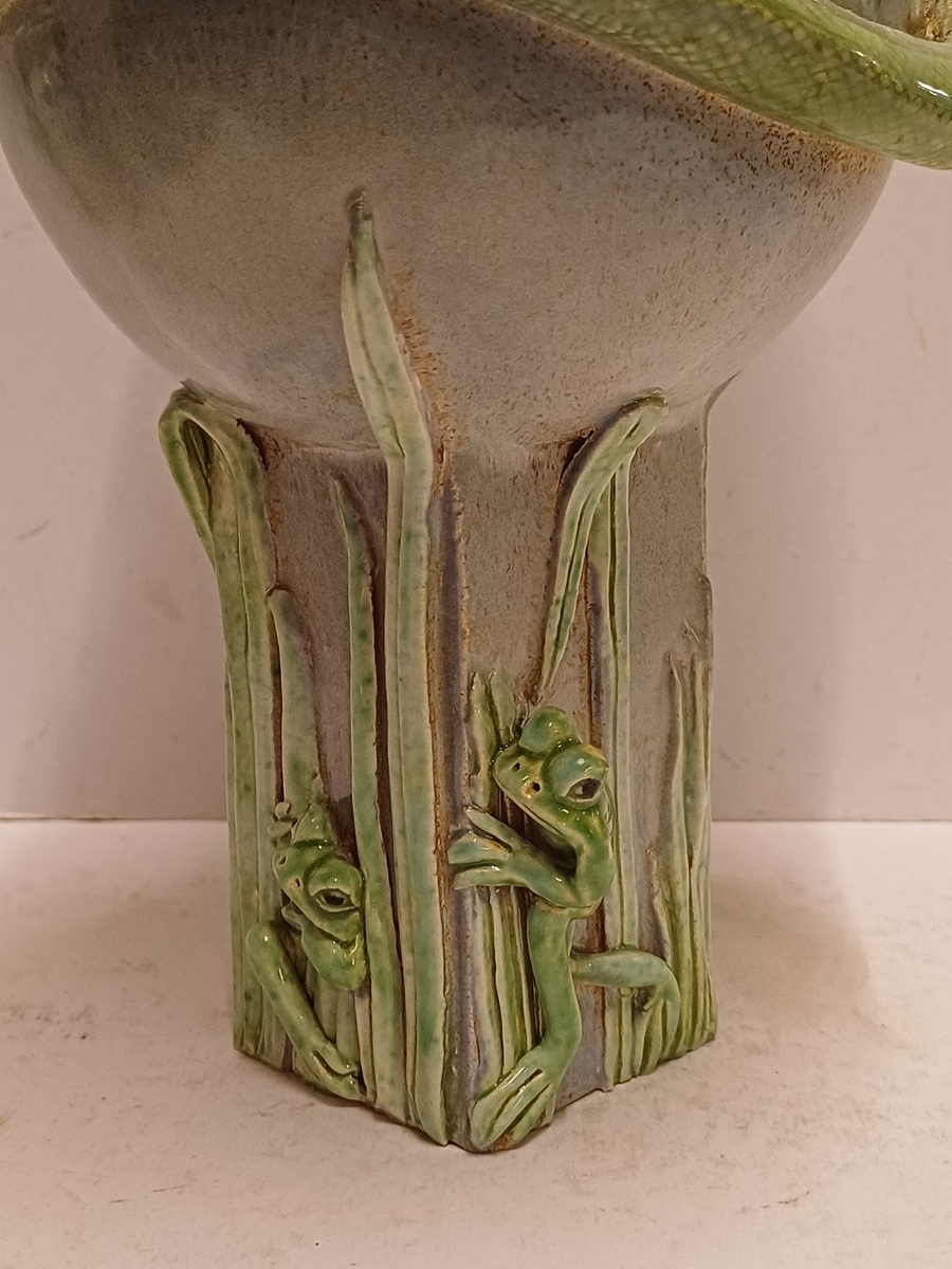 Aardewerken sculptuur van een salamander die een bol beklimt. De zijkanten gedecoreerd met riet met daarin verstopte kikkers. Ogenschijnlijk niet gesigneerd.