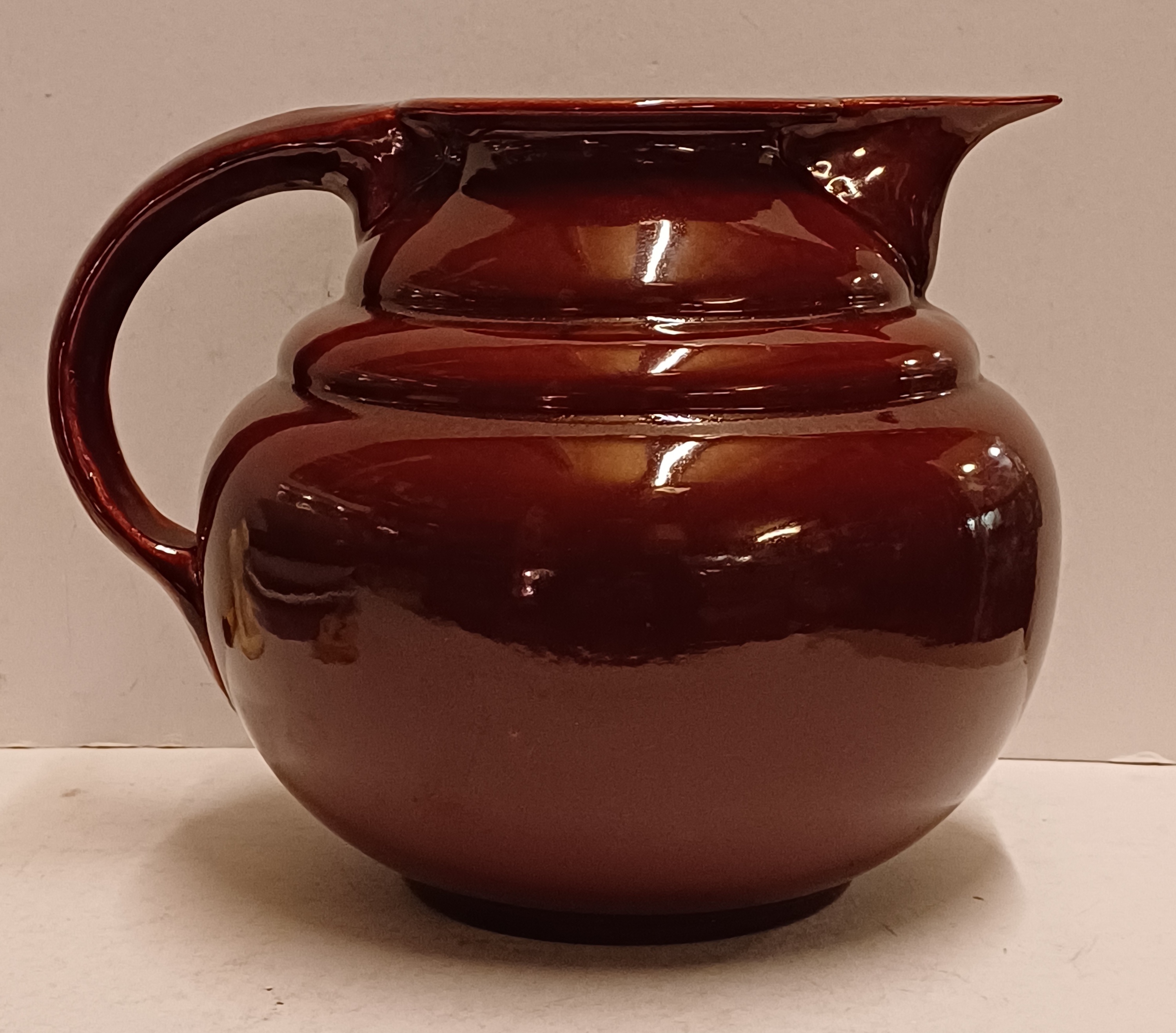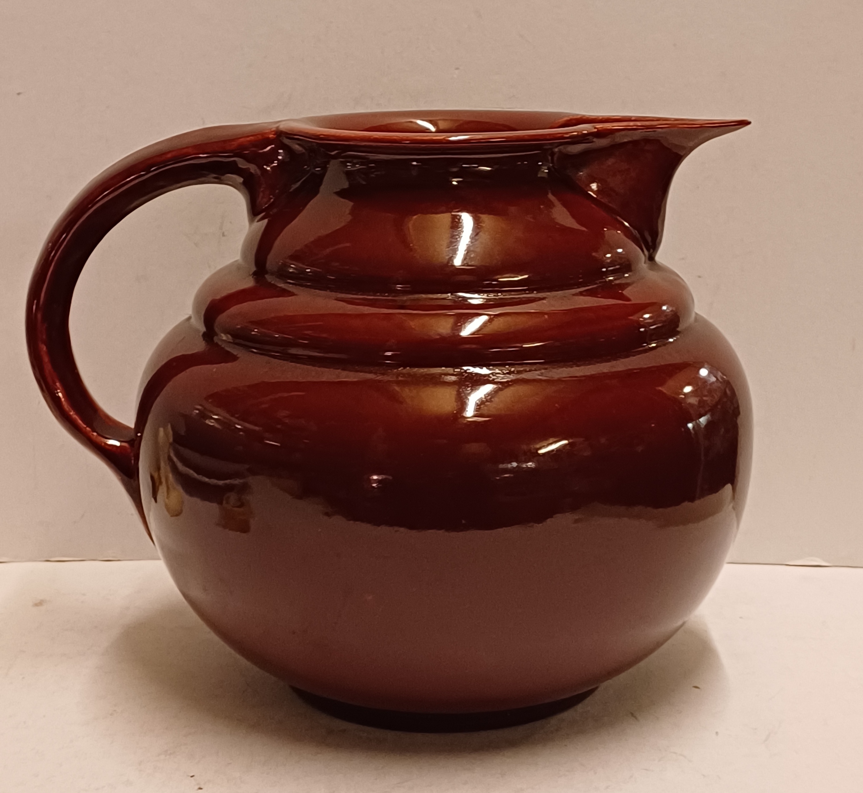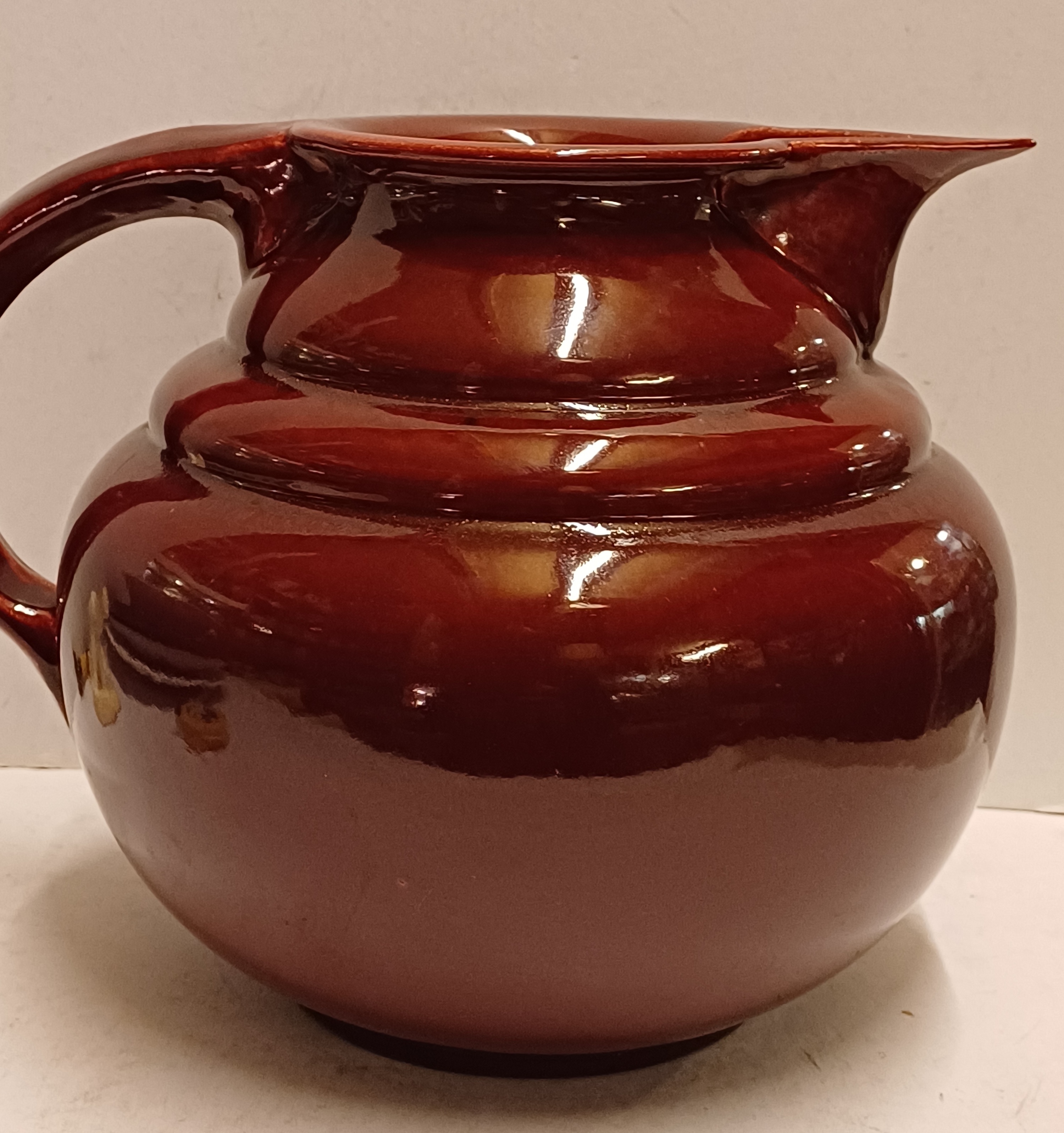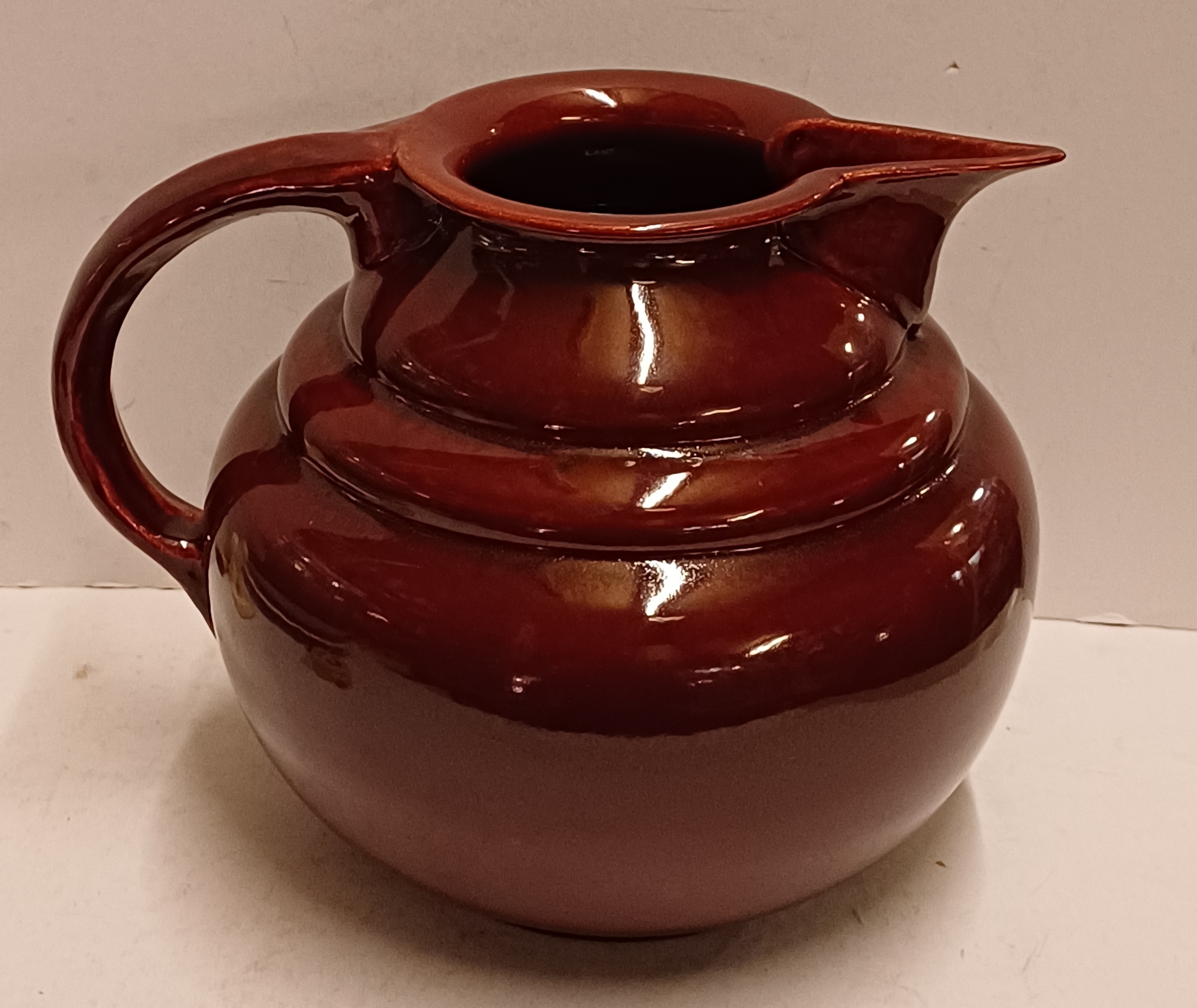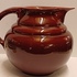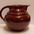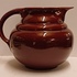Gedraaide aardewerken bordeaux rood geglazuurde schenkkan. Onderzijde met vroeg Adco merk.