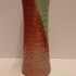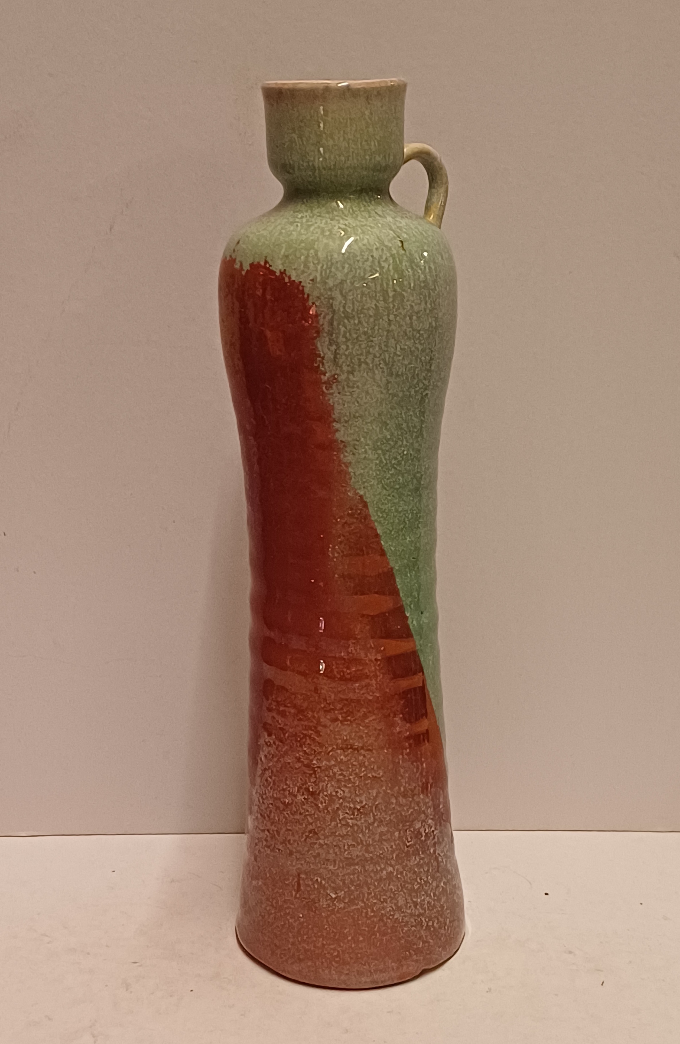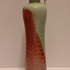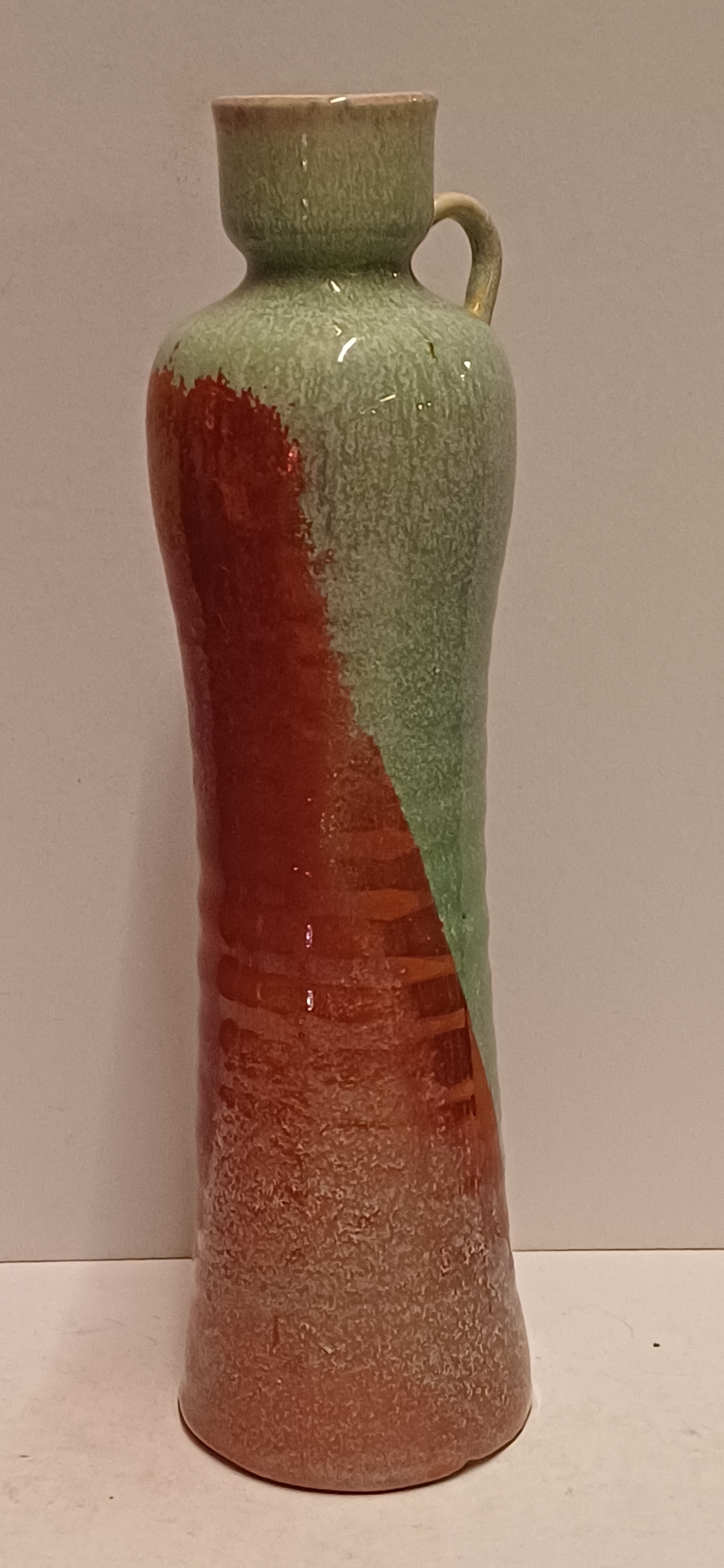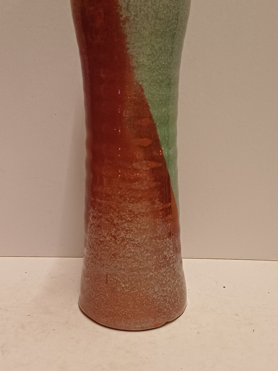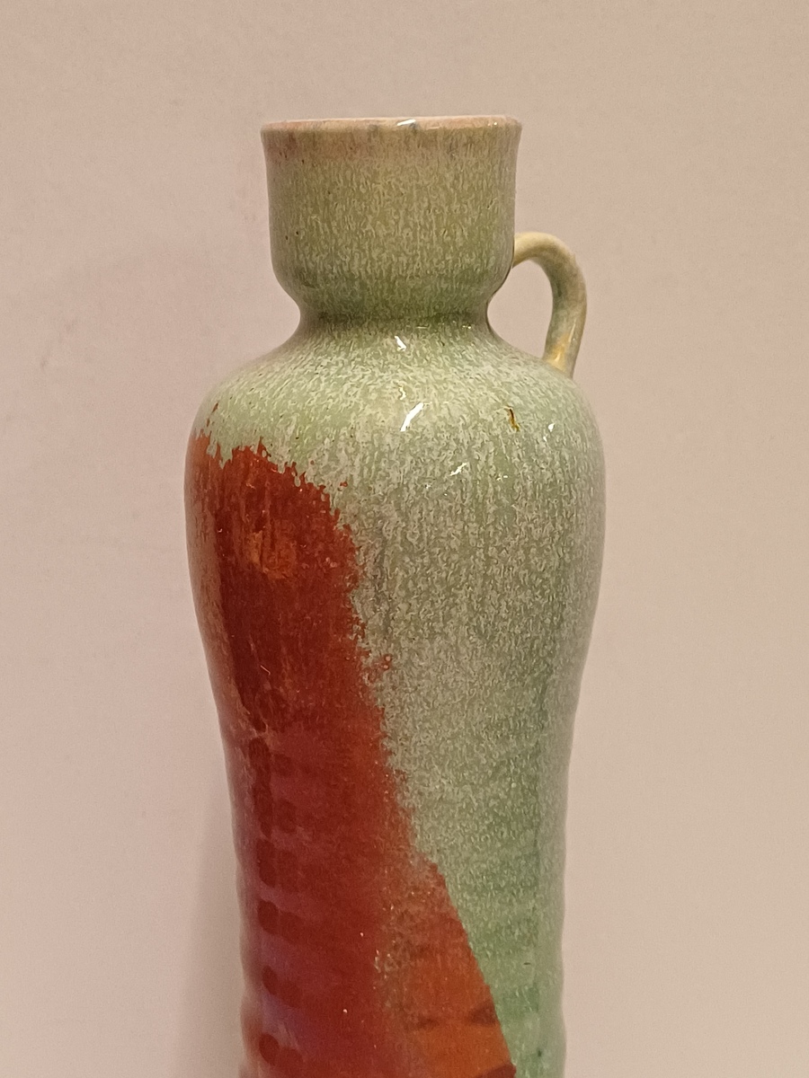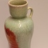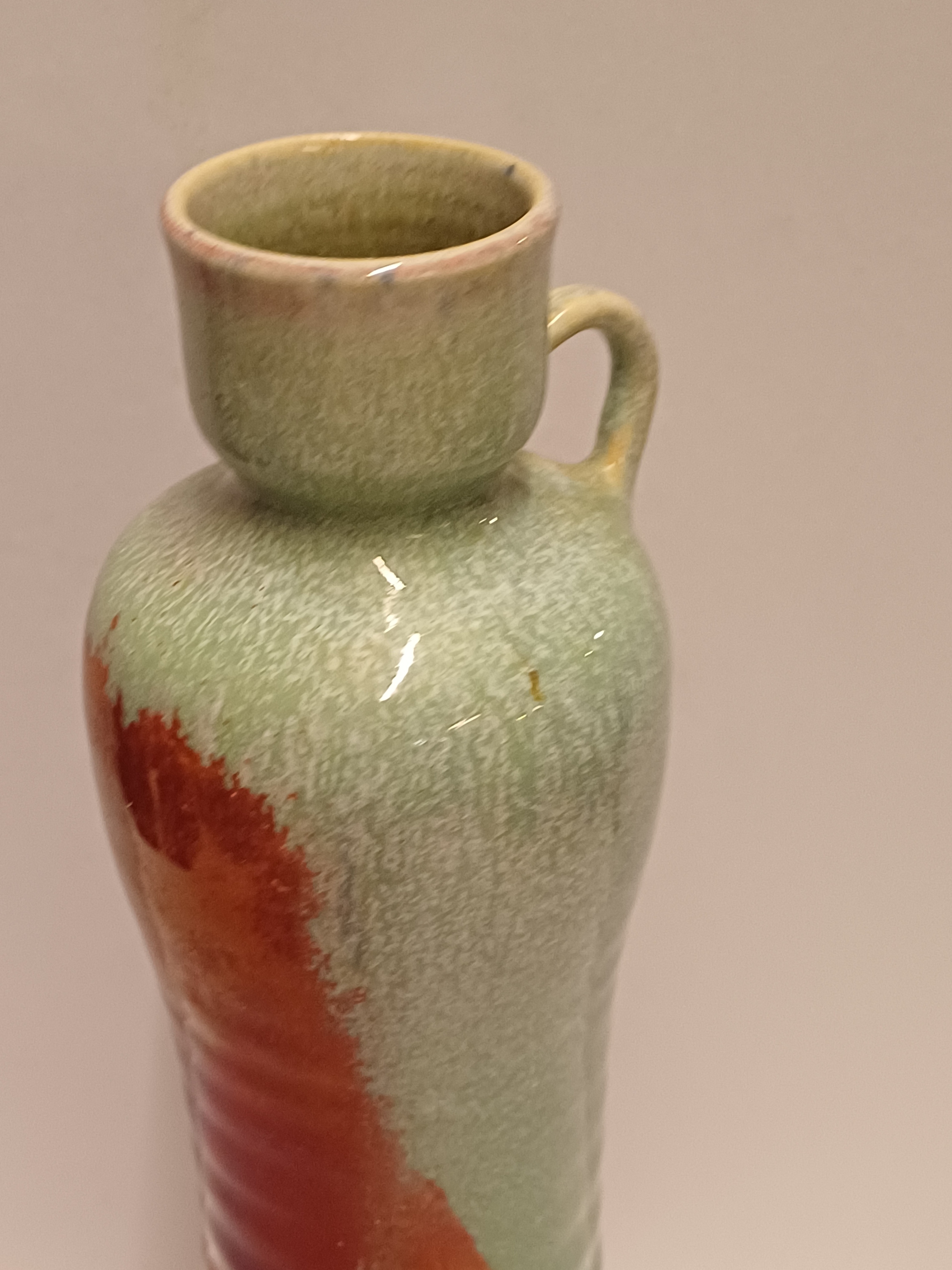 Smal sierkannetje met rode metallic glazuur met groene oxidatie aan bovenzijde. Onderzijde gesigneerd.
