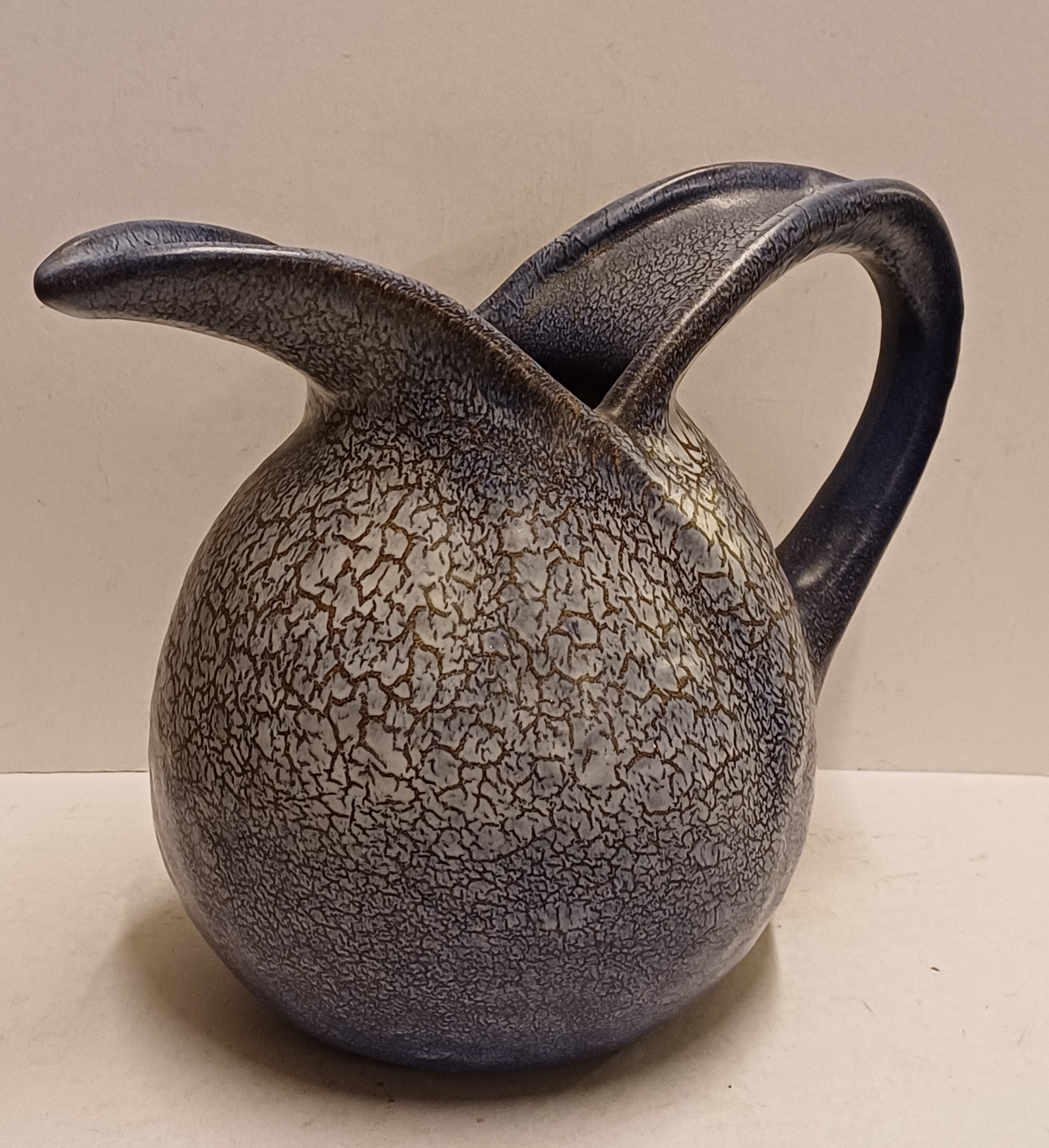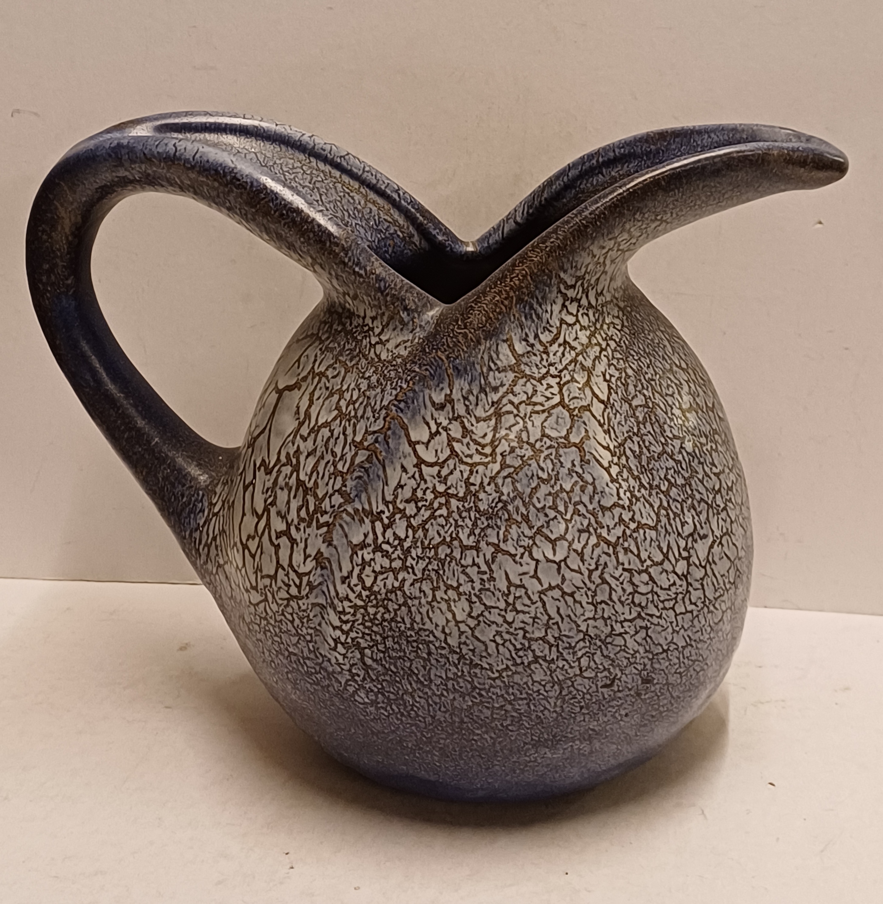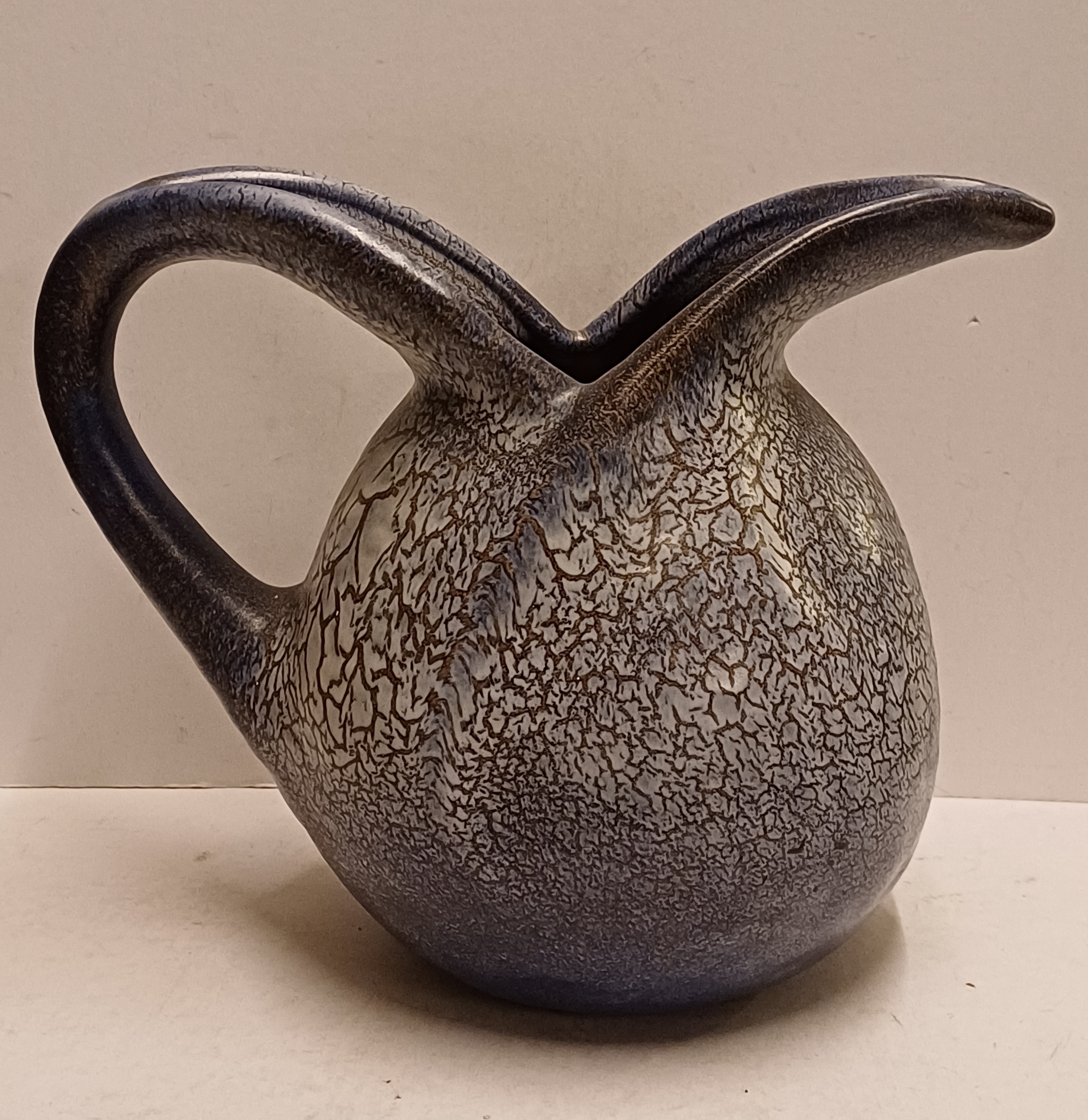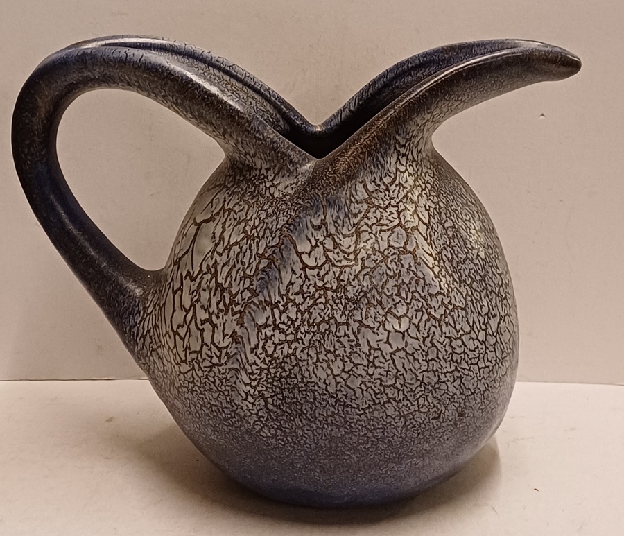 Aardewerken handgevormde sierkan met gewolkte glazuur in blauw grijs. Onderzijde met fabrieksmerk en modelnummer. Ontwerp Willem Stuurman.