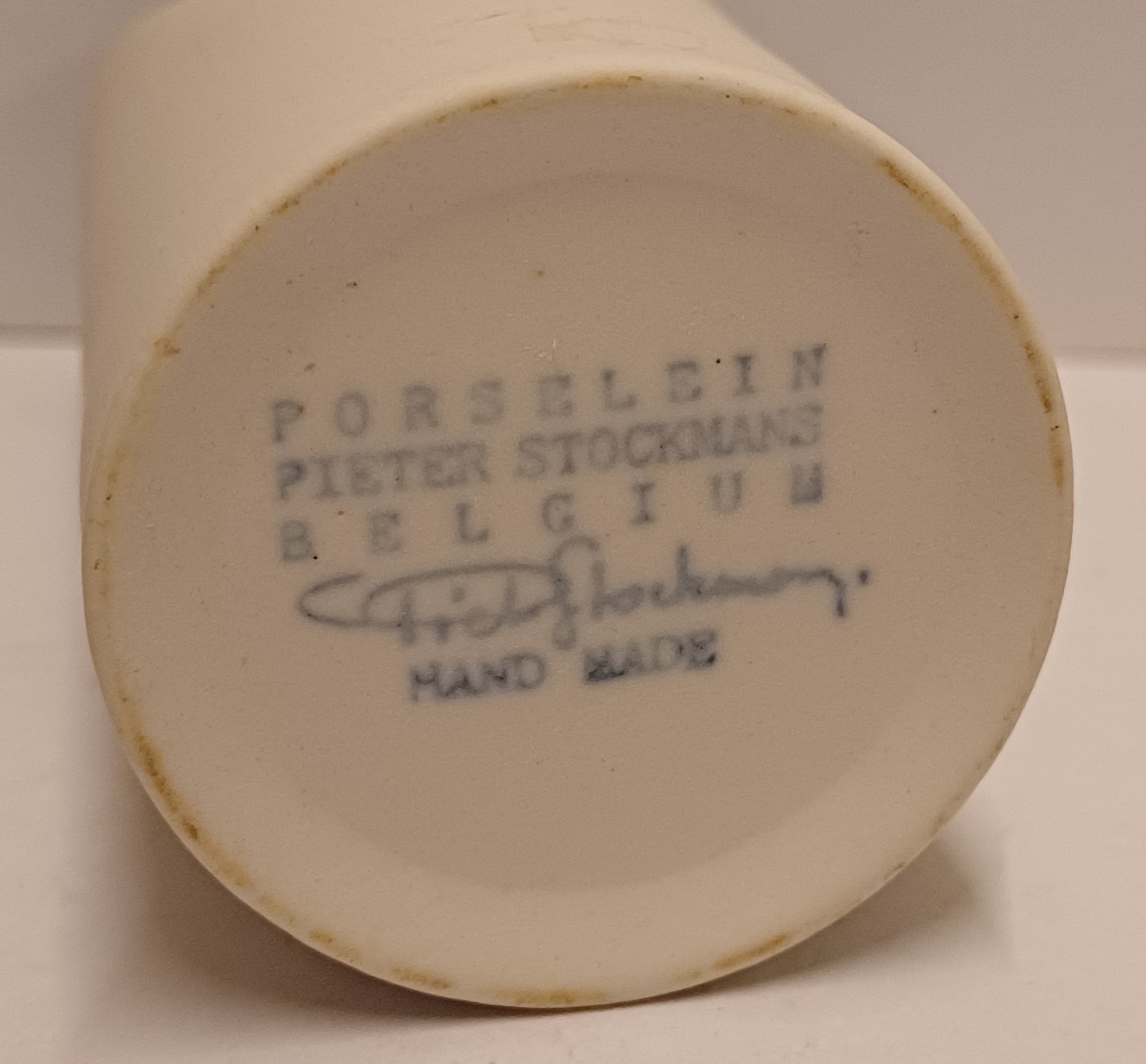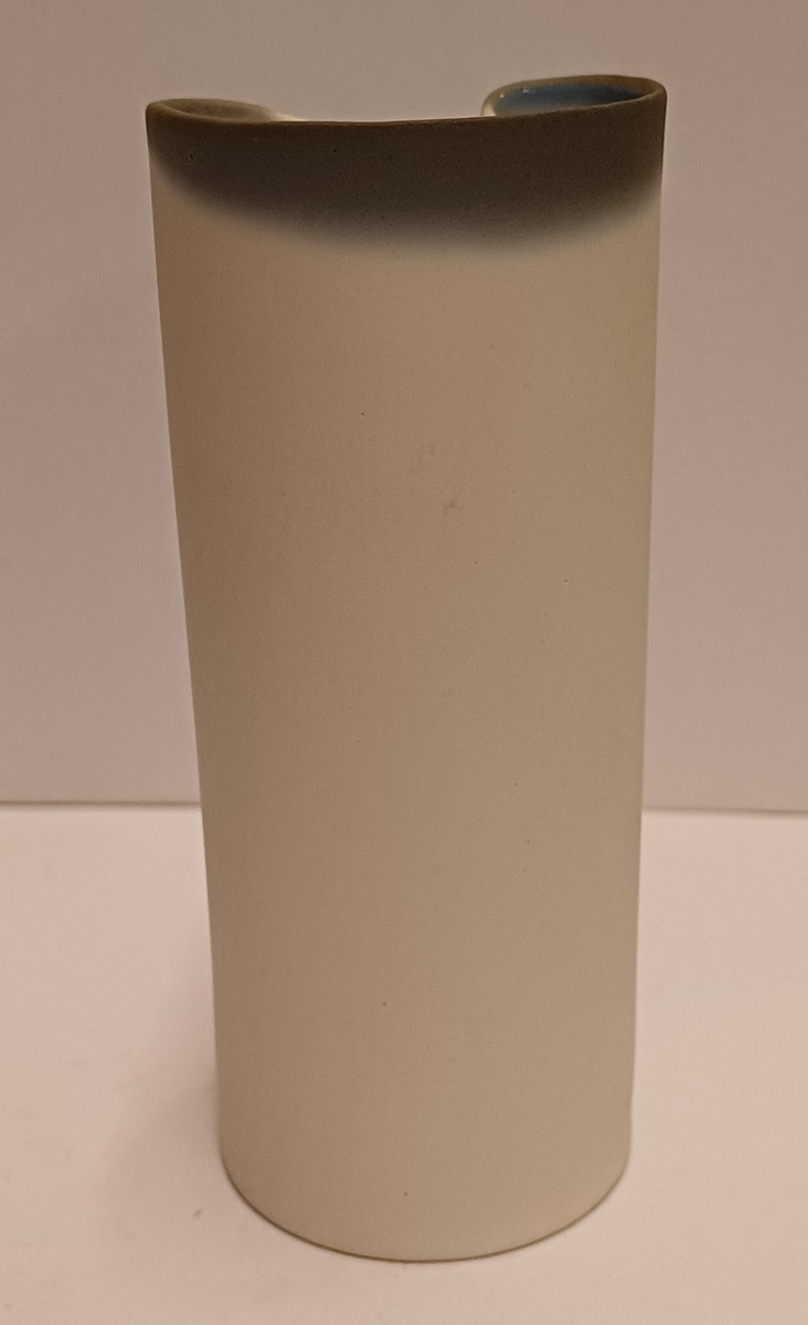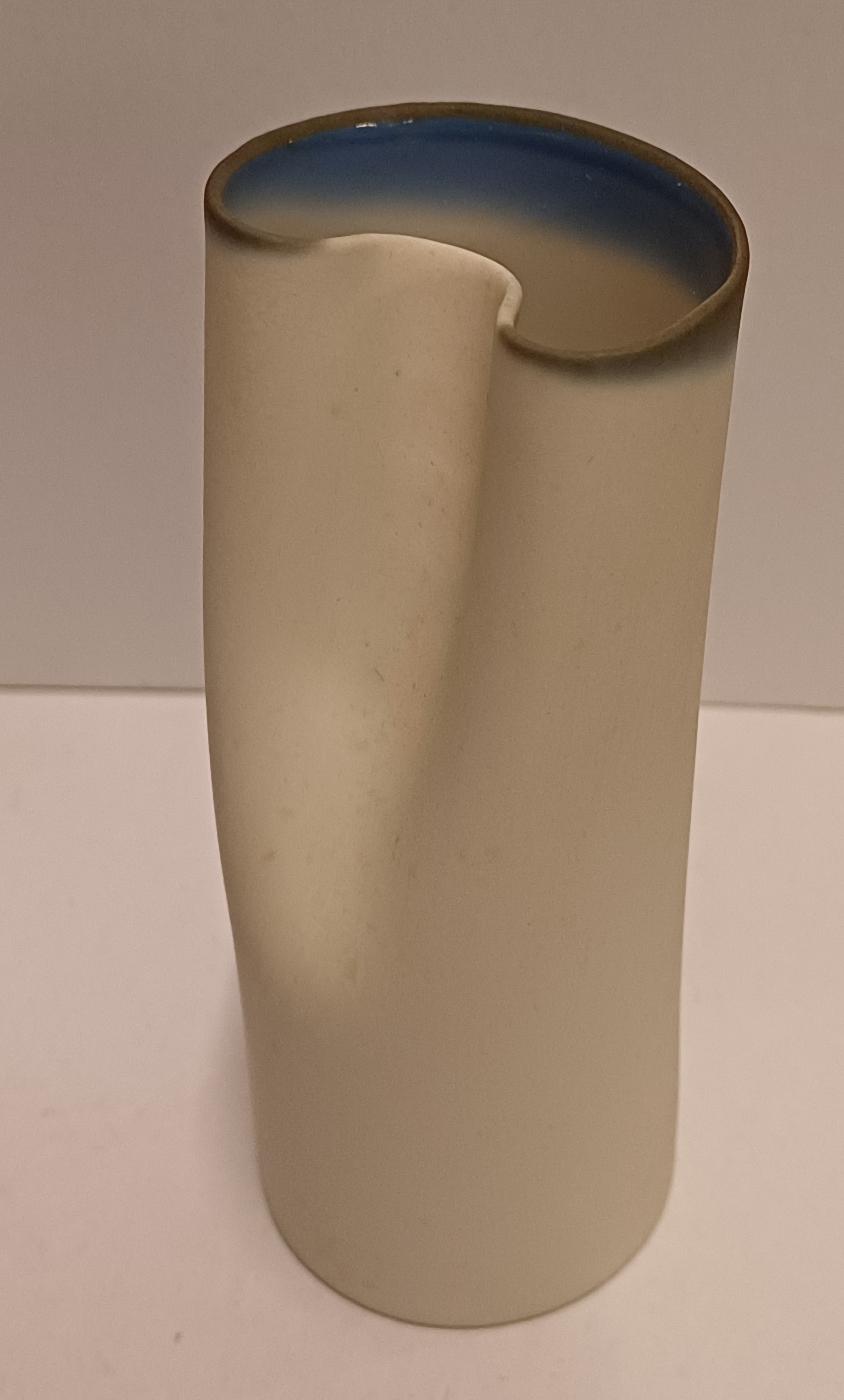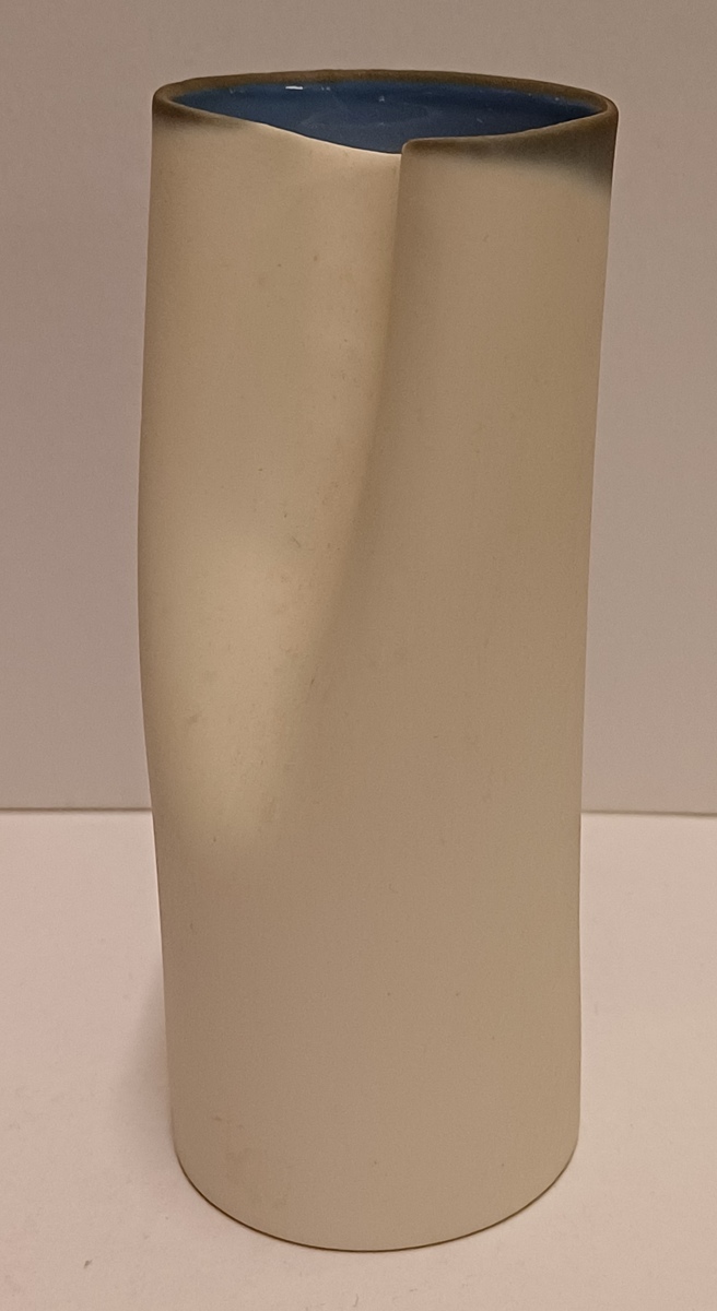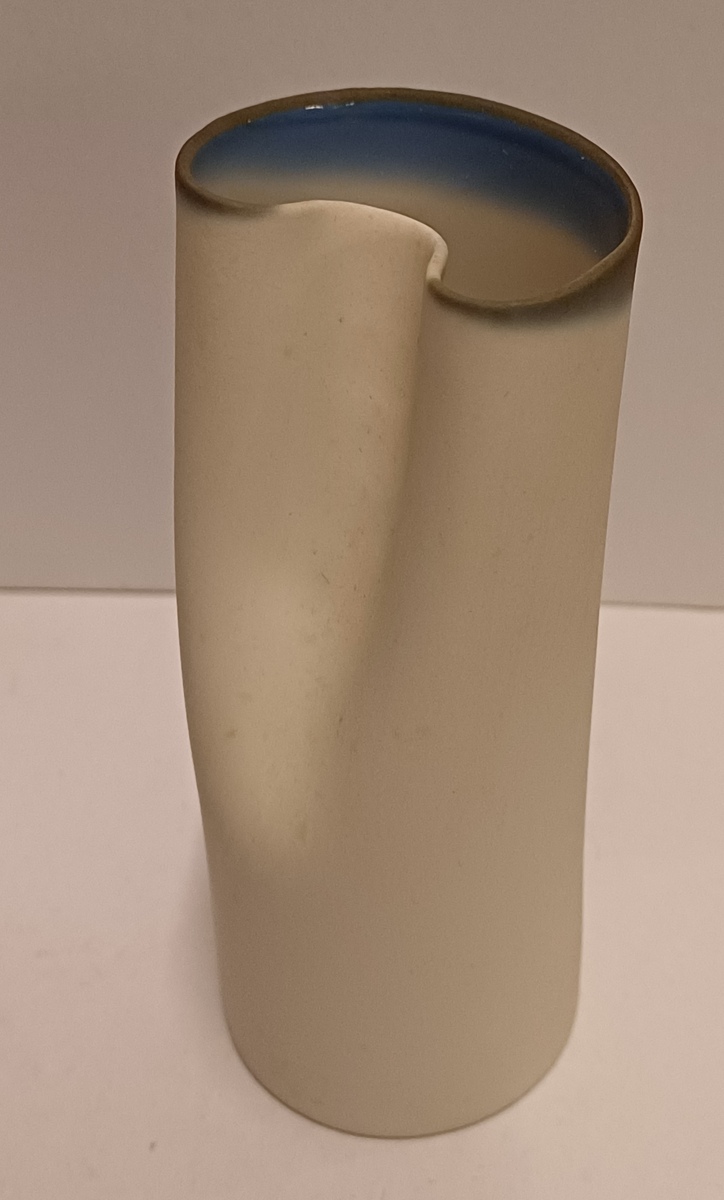 Porseleinen vaas met ingeknepen bovenzijde. De binnenkant met blauwe glazuur.