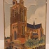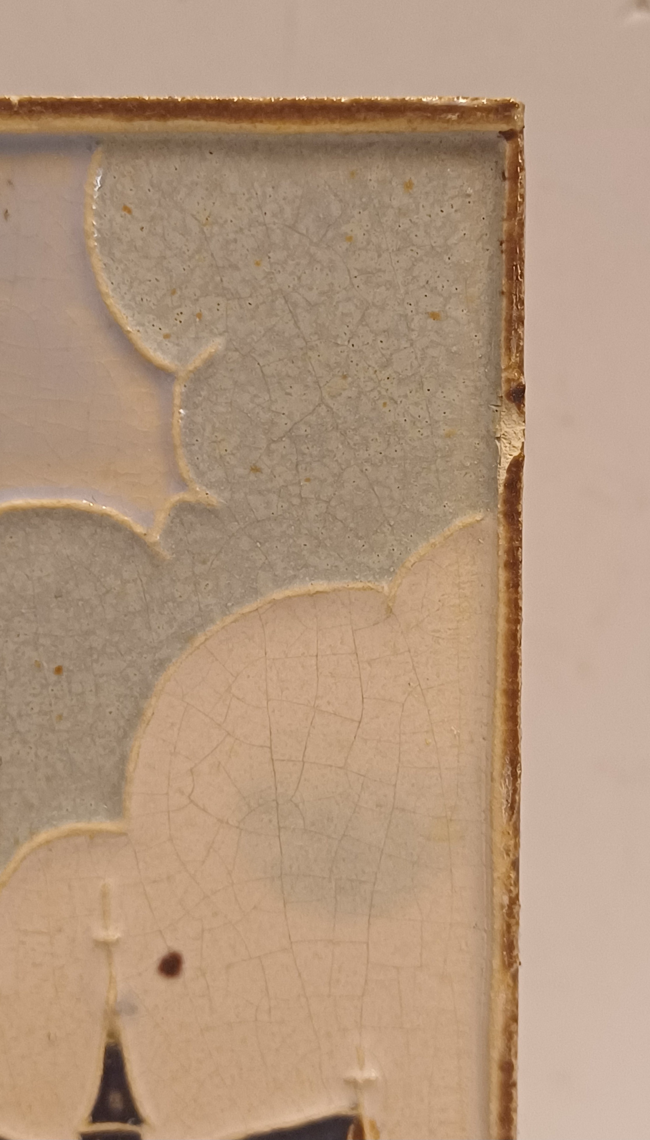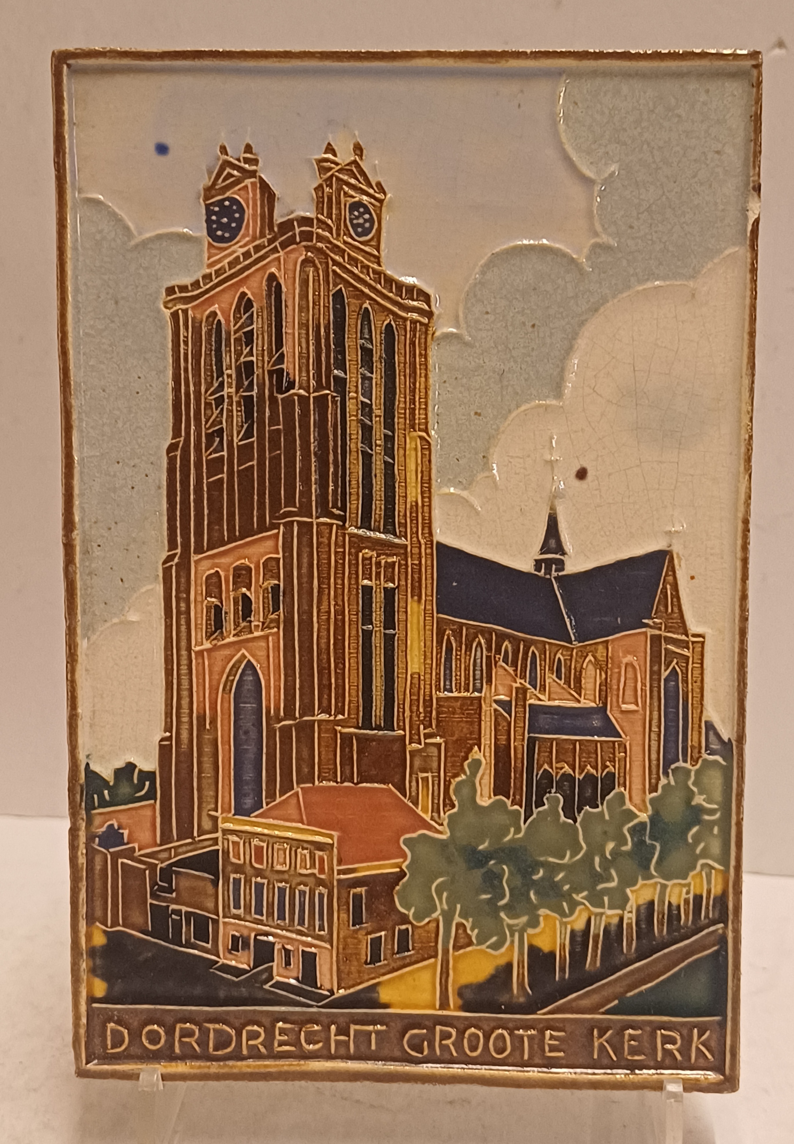 Cloisonne tegel met afbeelding van de Groote kerk te Dordrecht. Achterzijde gemerkt.