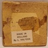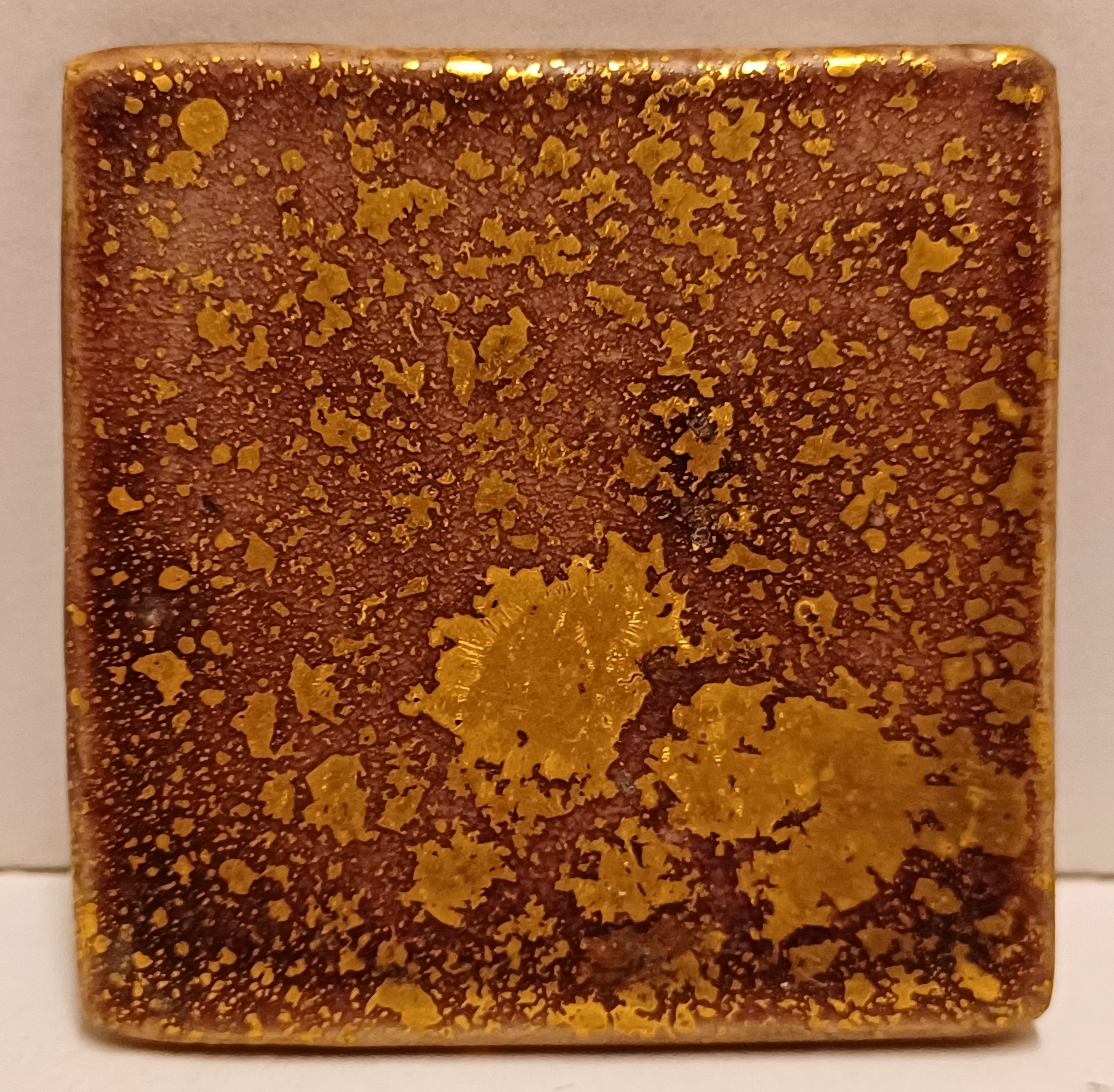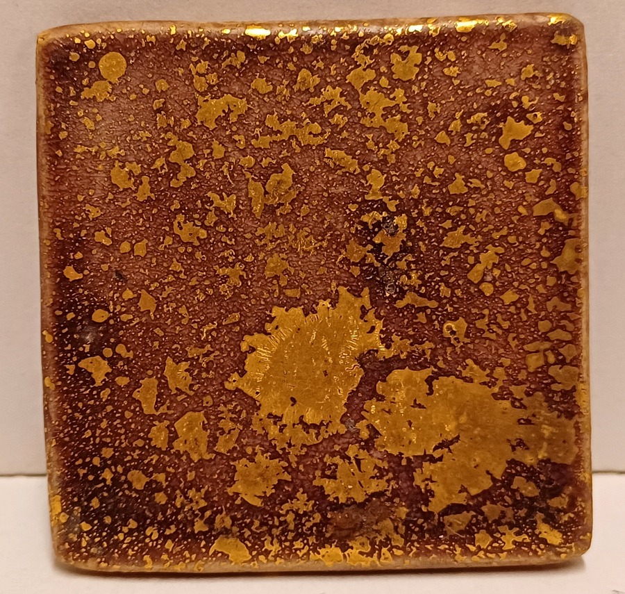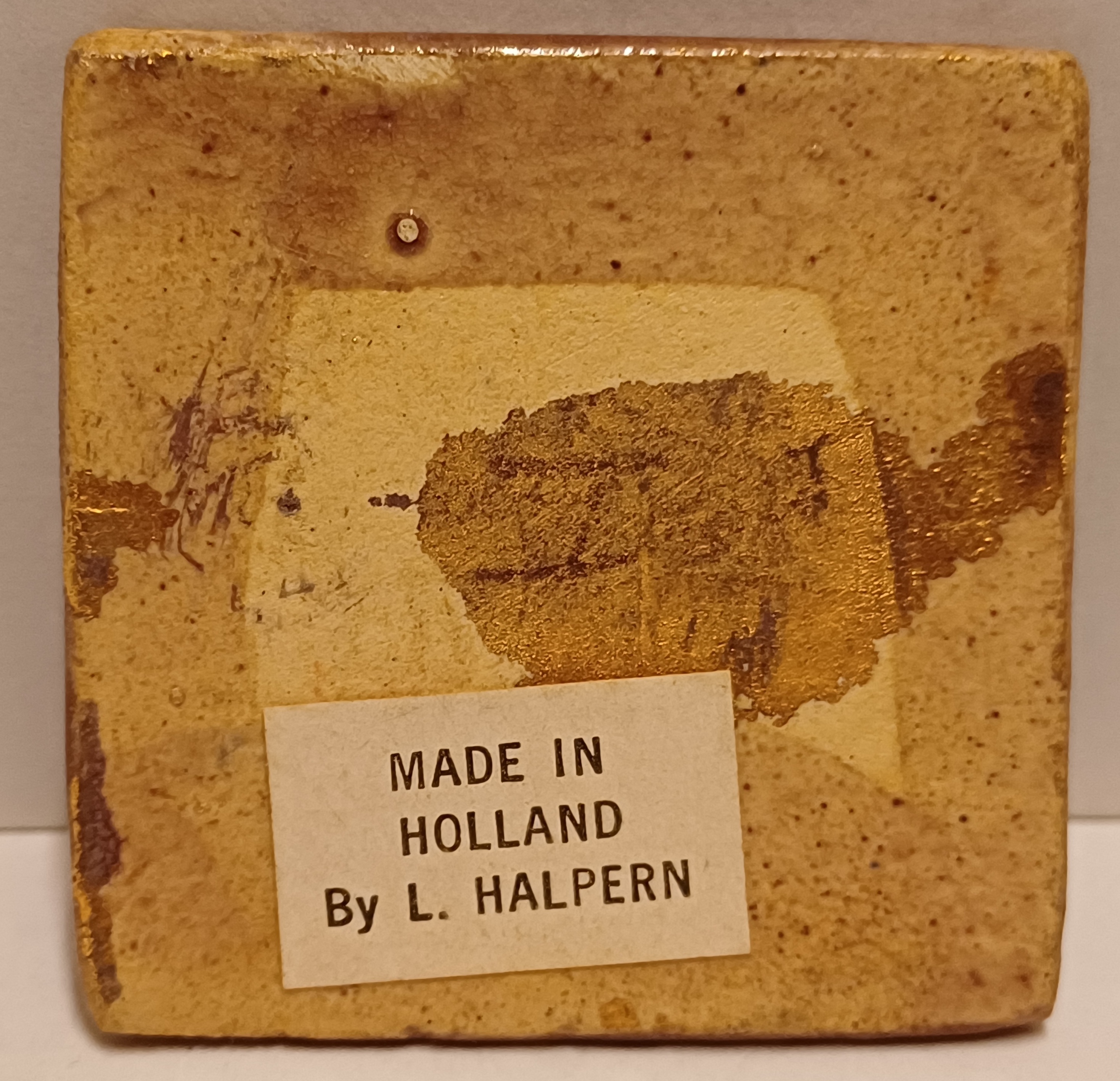Glazuurproef tegeltje, die ze op den duur als broches vermaakte en los verkocht. Afkomstig uit haar nalatenschap wat ze in begin 2000 naar Nederland gehaald is. Gemerkt met etiket