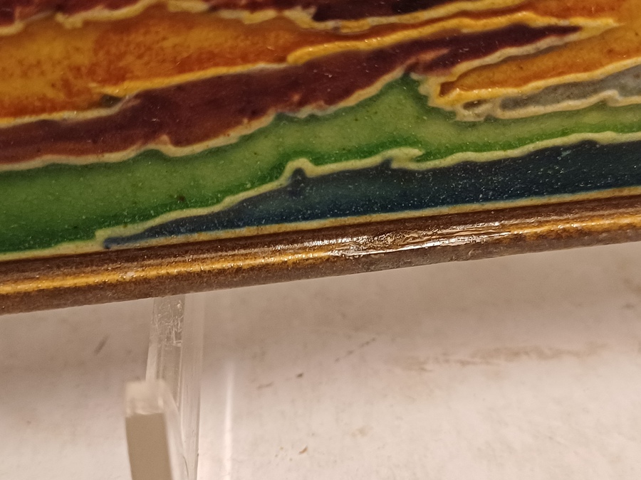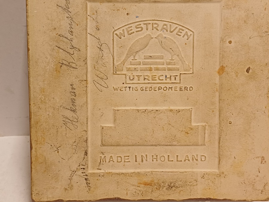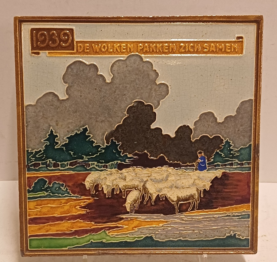 Cloisonne tegel met heide landschap en de tekst 1939 de wolken pakken zich samen.