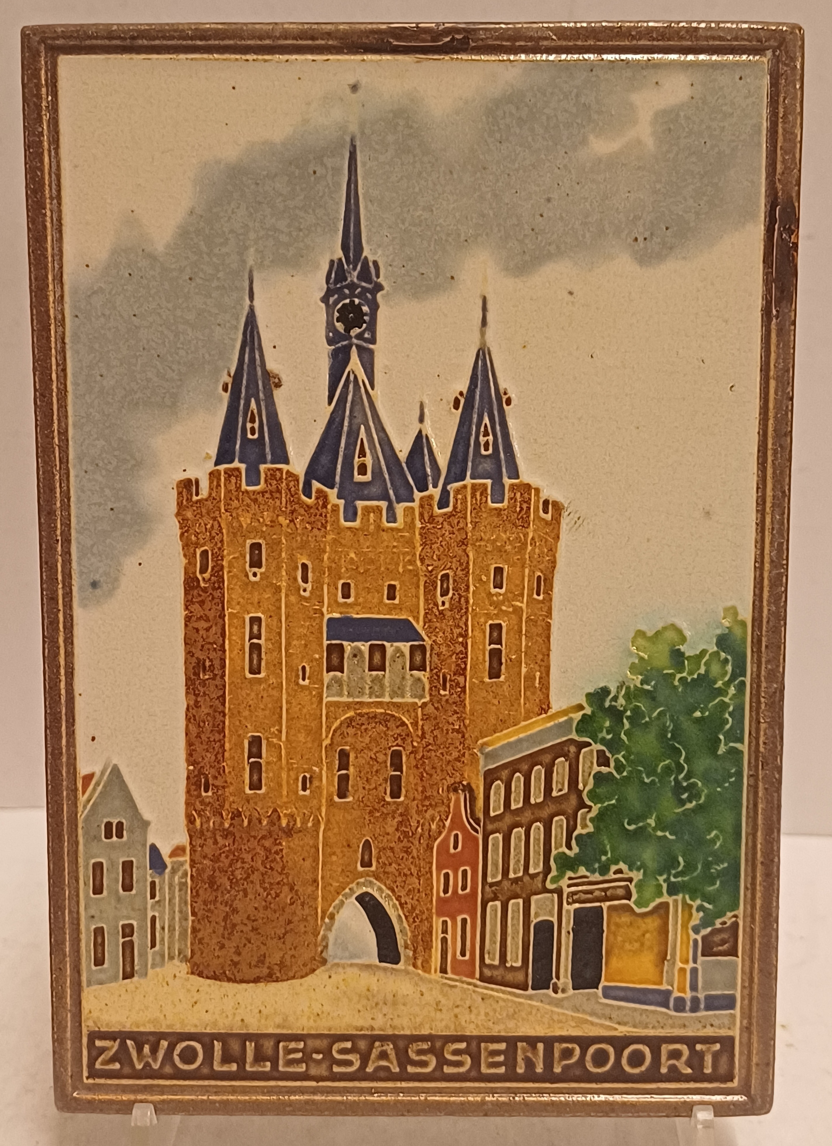 Cloisonne tegel met afbeelding van de Sassenpoort te Zwolle. Achterzijde gemerkt.