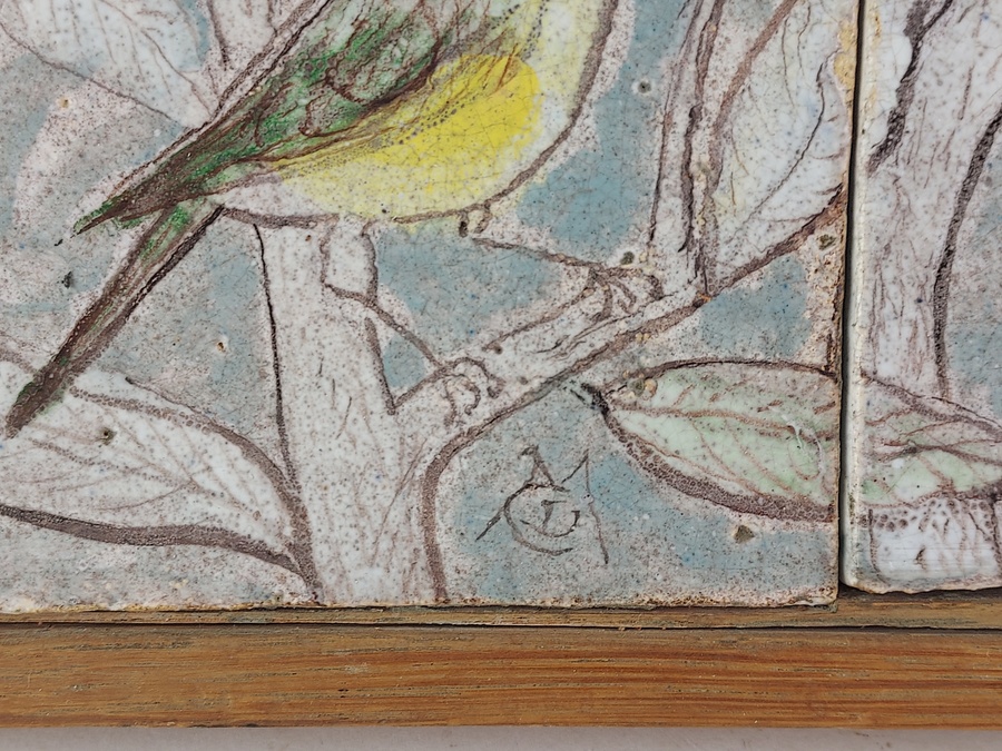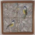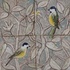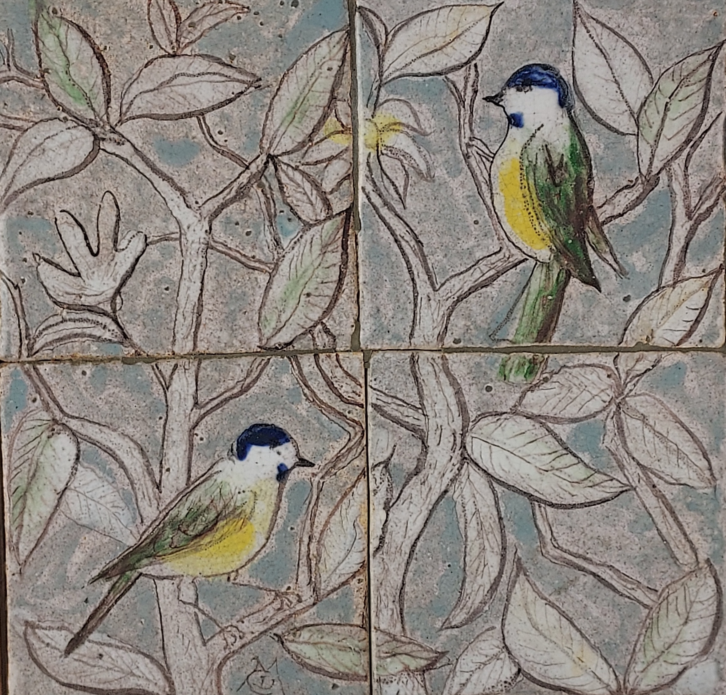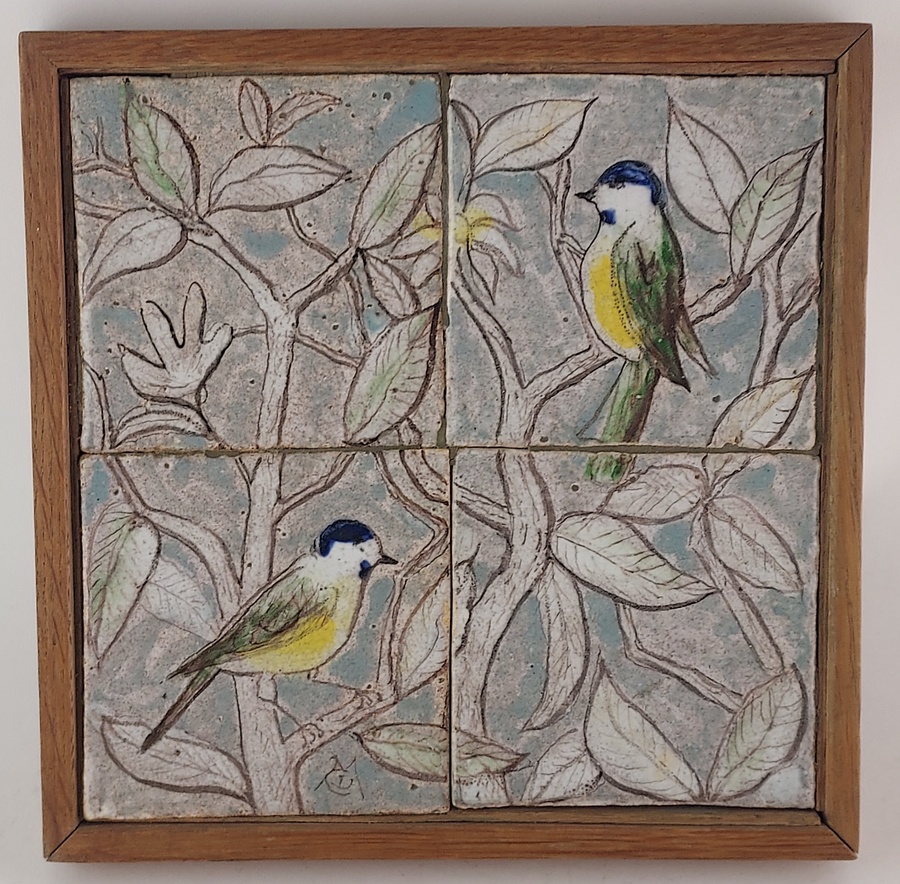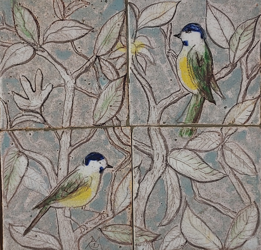 4-pas tegeltableau met decoratie van musjes op takken. Voorzijde gesigneerd met monogram.