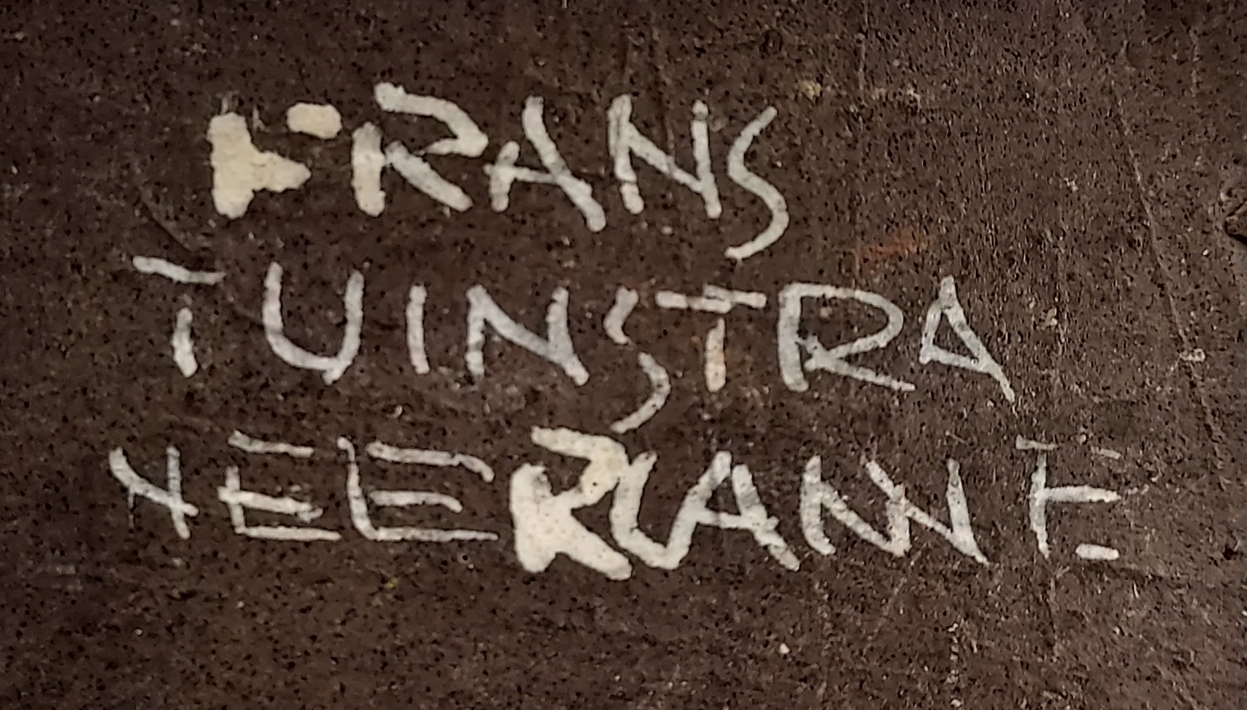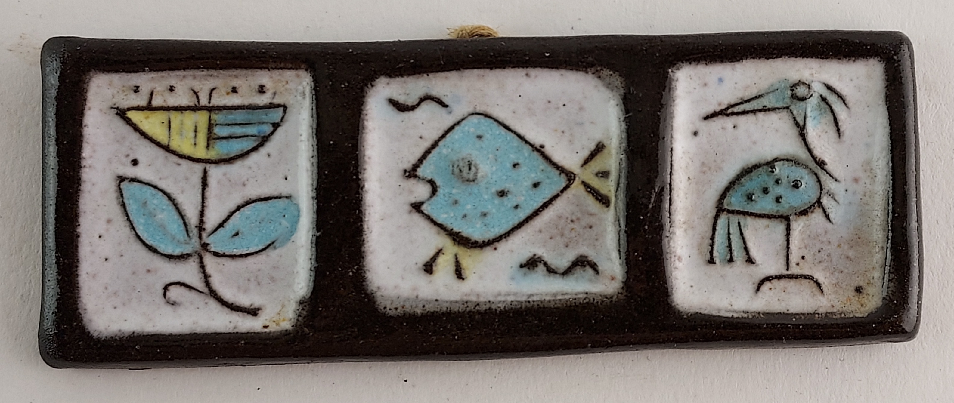 Smal tegeltje met decoratie van bloem, vis en vogel. Achterzijde voluit gesigneerd.