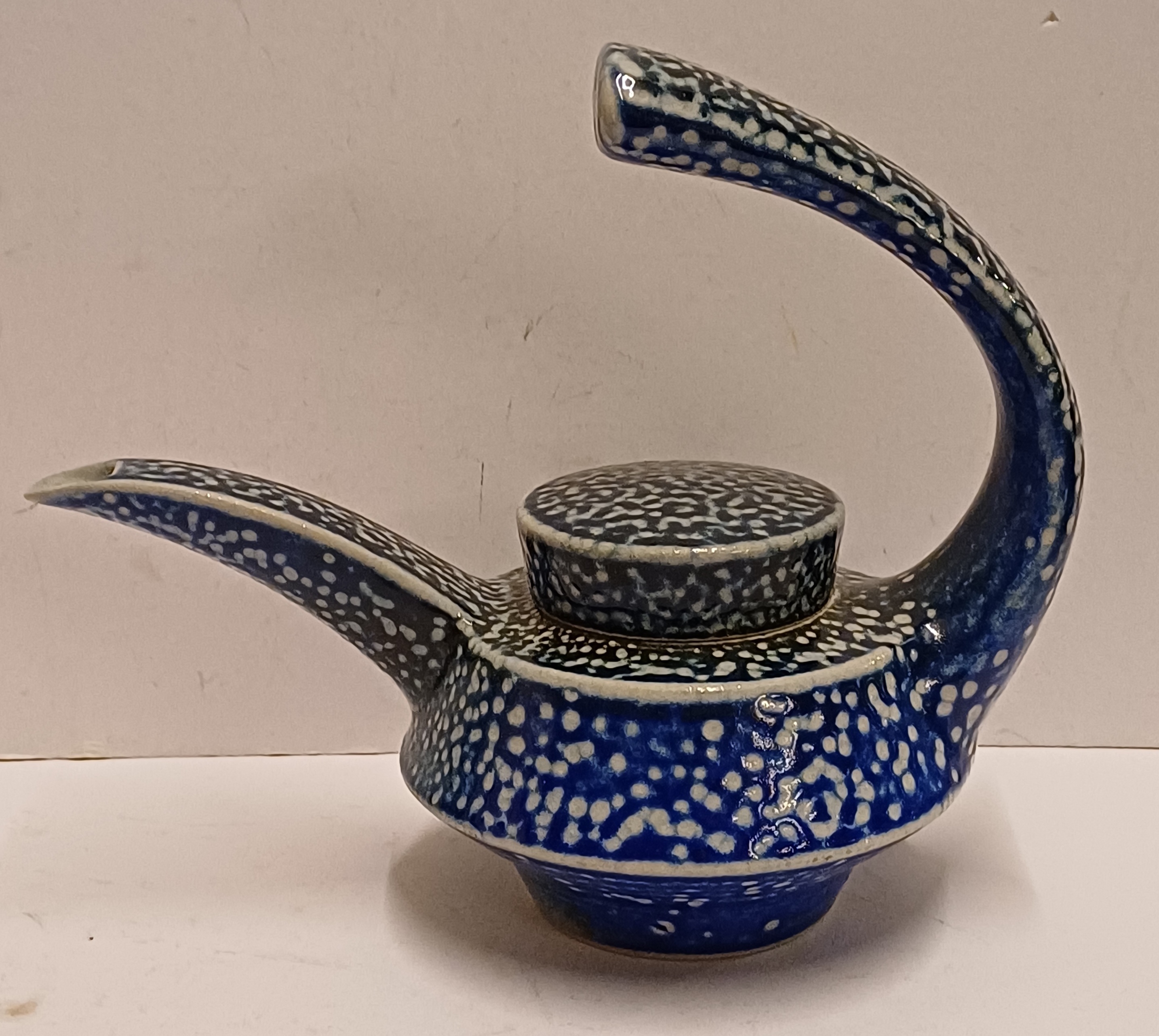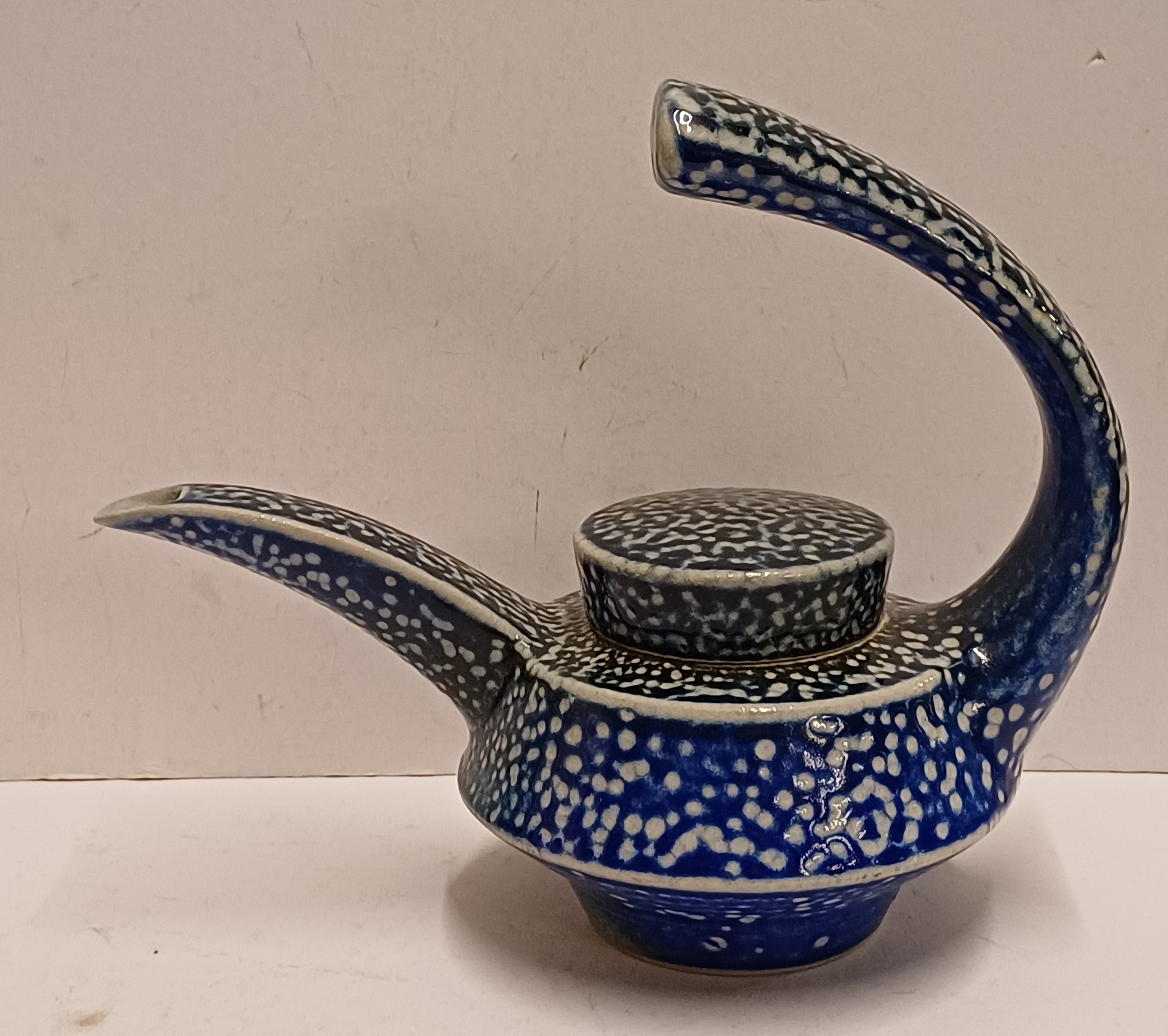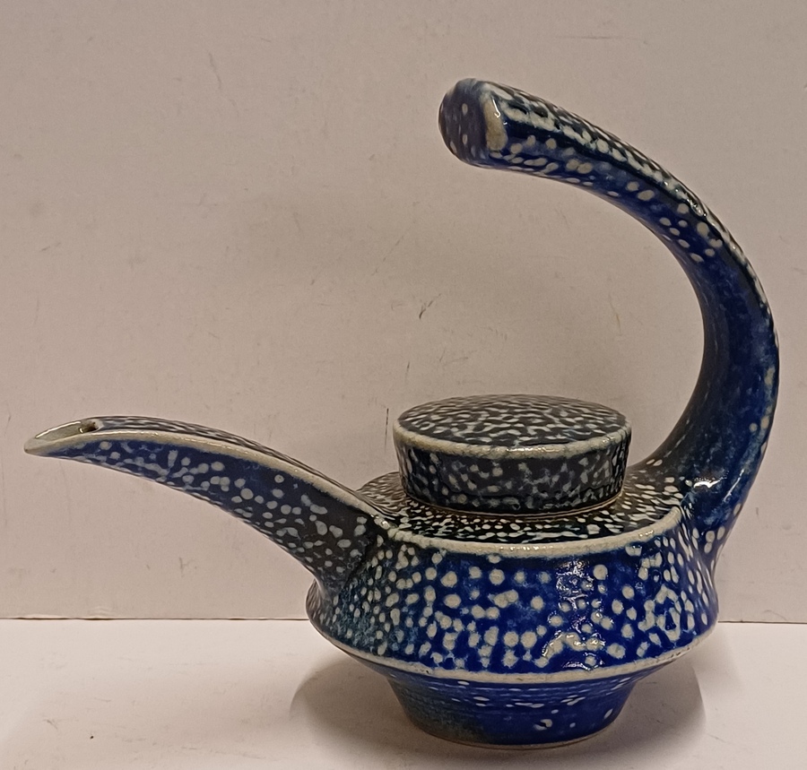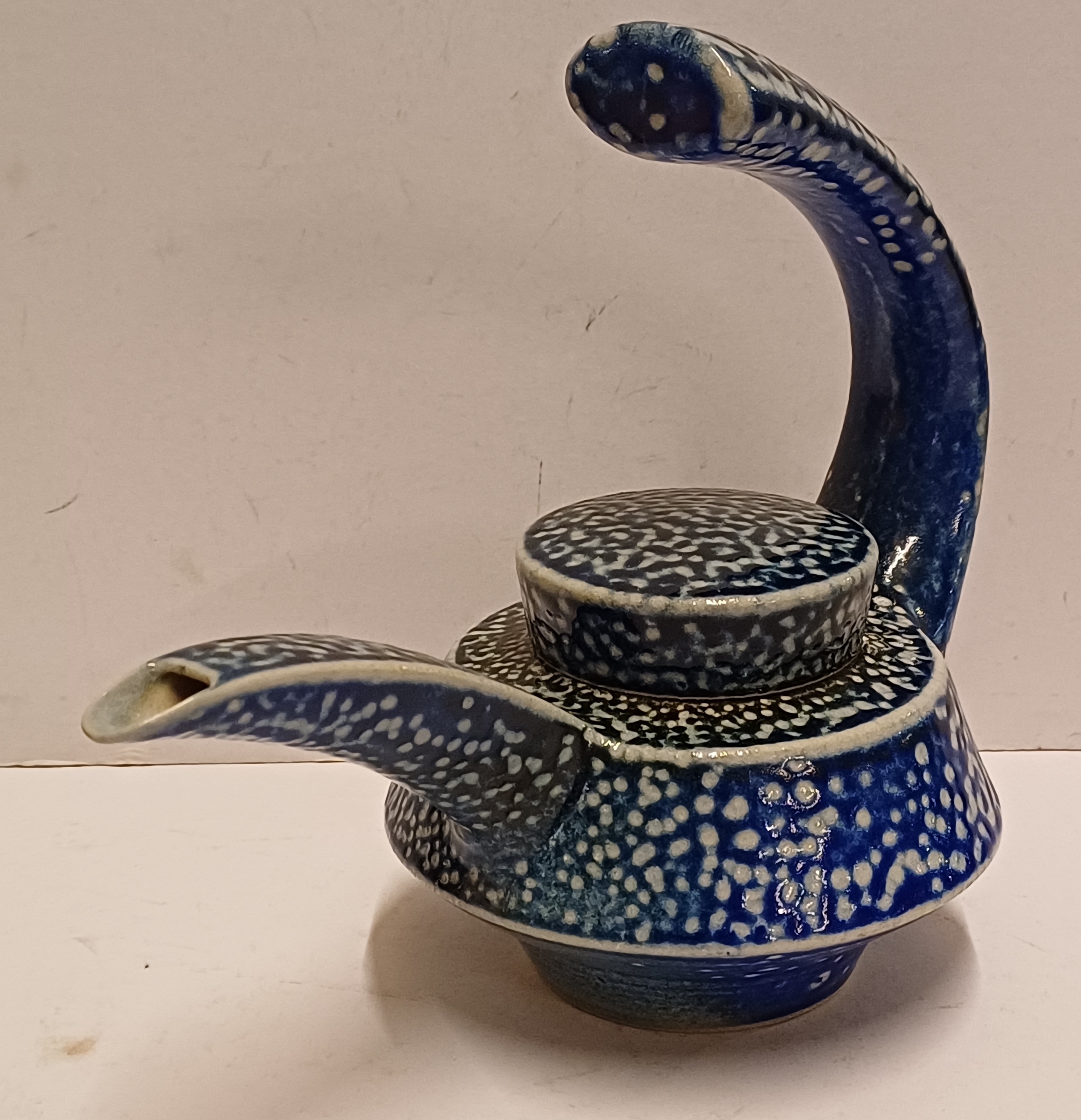 Steengoed theepot met hoge handgreep en blauwe zoutglazuur. Aangekocht door de vorige eigenaar tijdens de expositie "Songs in salt" in het Princessehof te Leeuwarden. Onderzijde gesigneerd