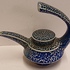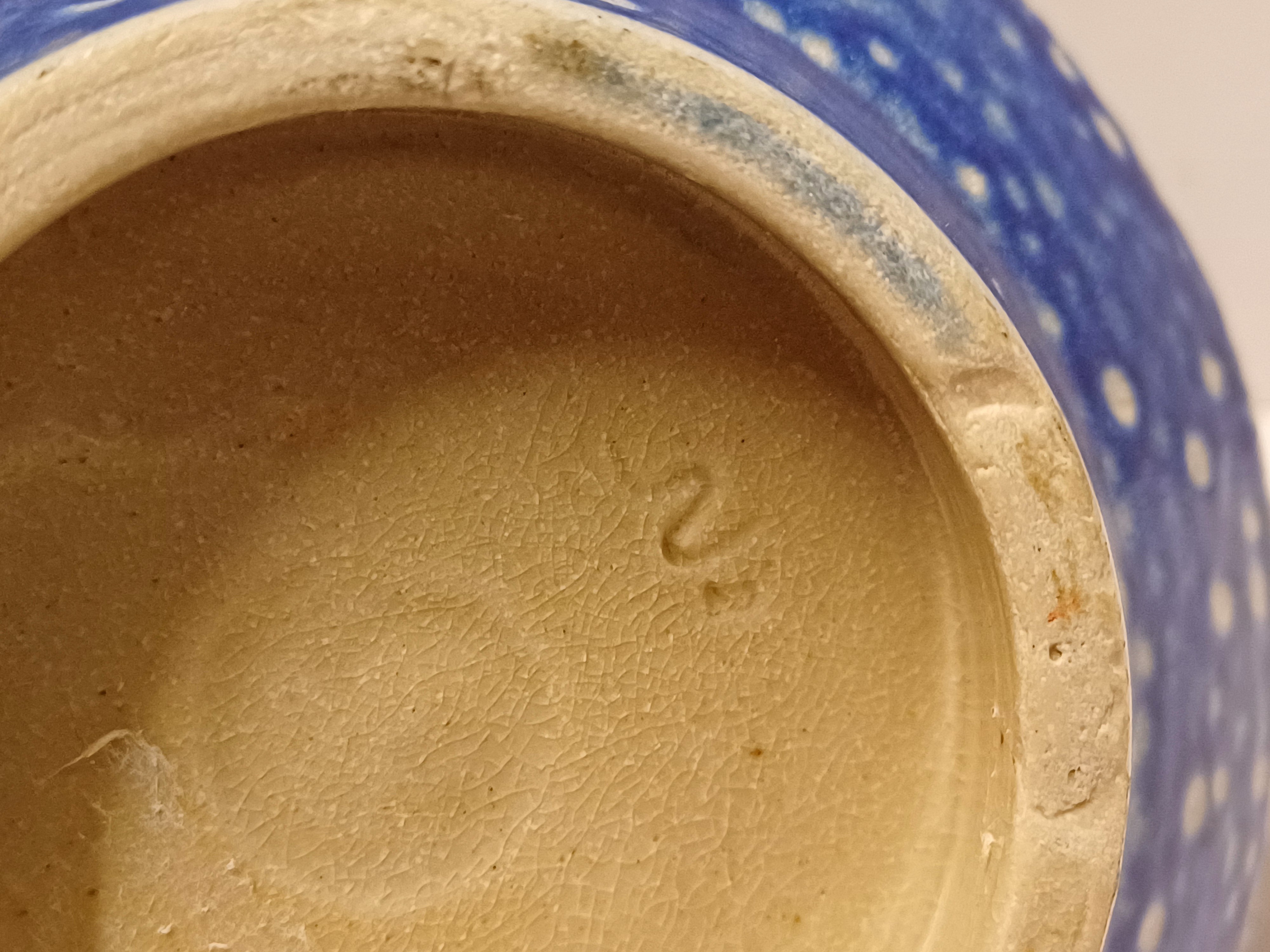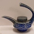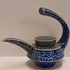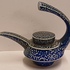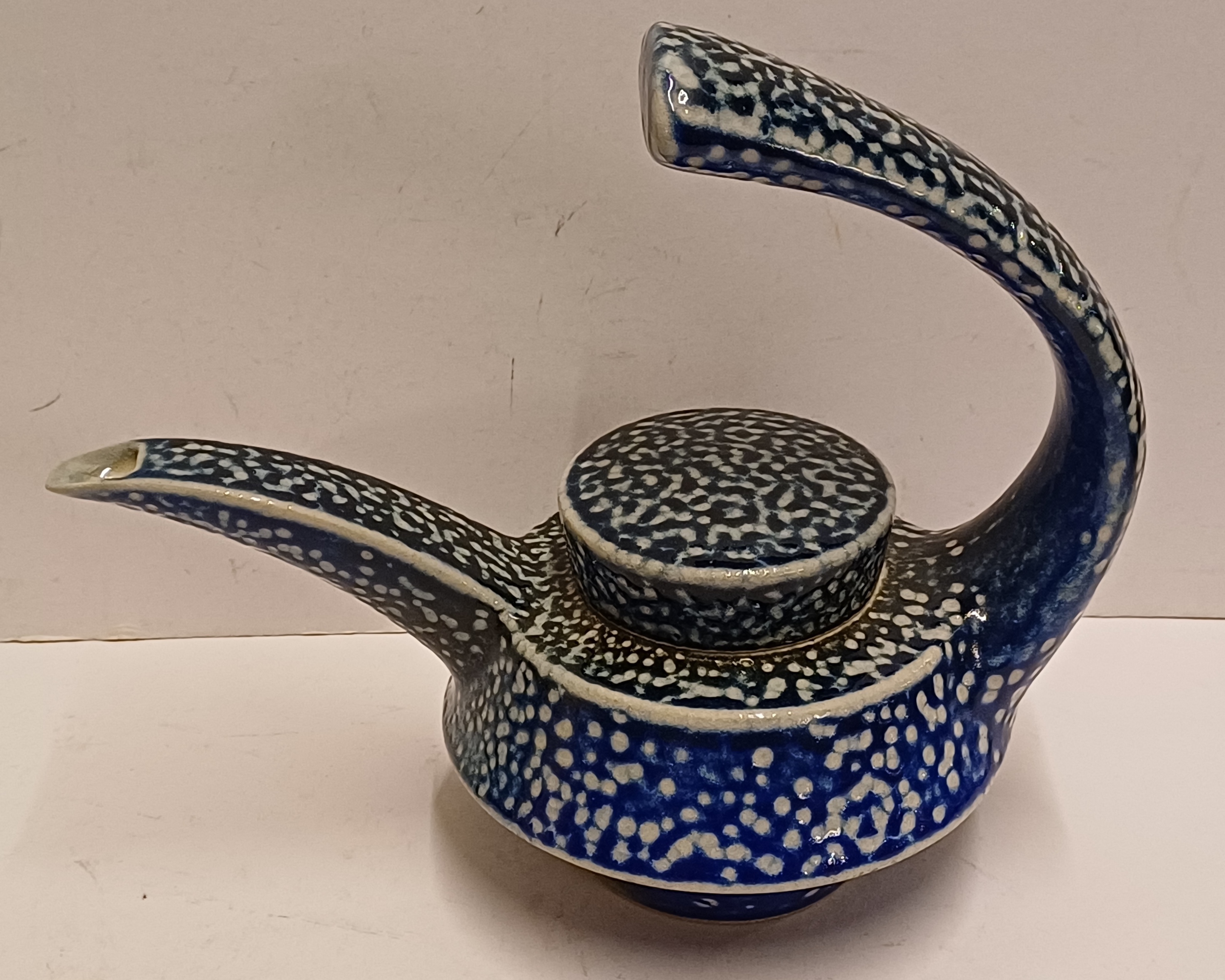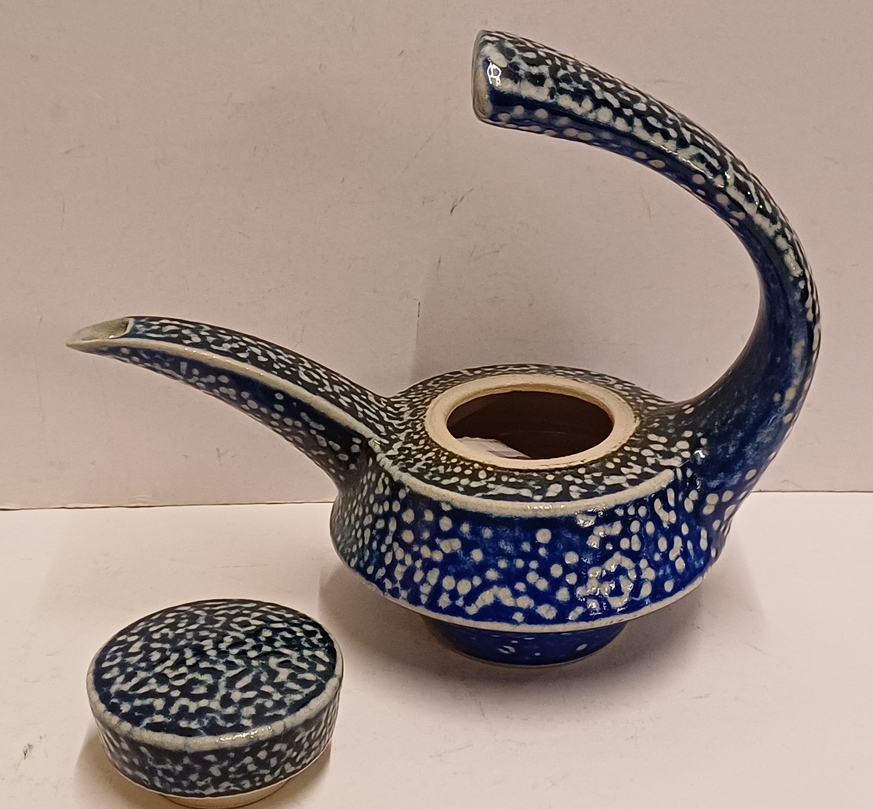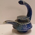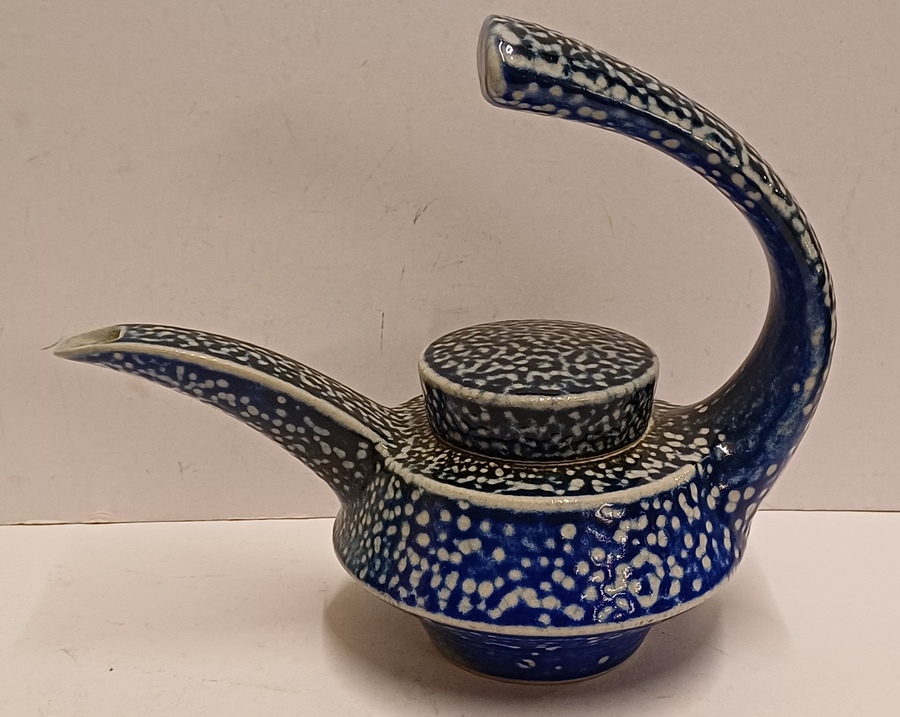 Steengoed theepot met hoge handgreep en blauwe zoutglazuur. Aangekocht door de vorige eigenaar tijdens de expositie "Songs in salt" in het Princessehof te Leeuwarden. Onderzijde gesigneerd