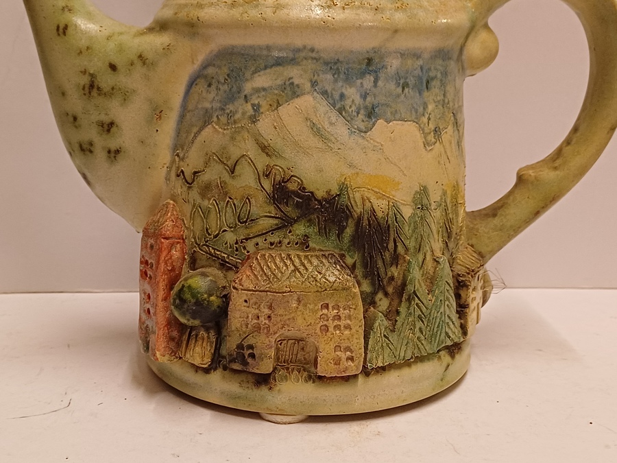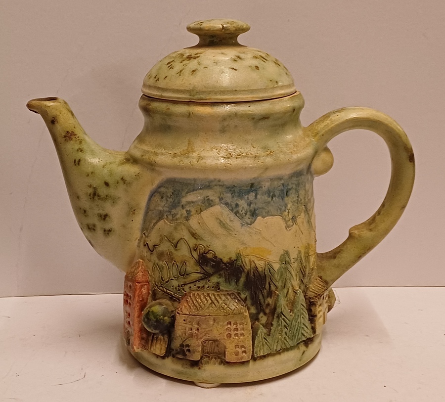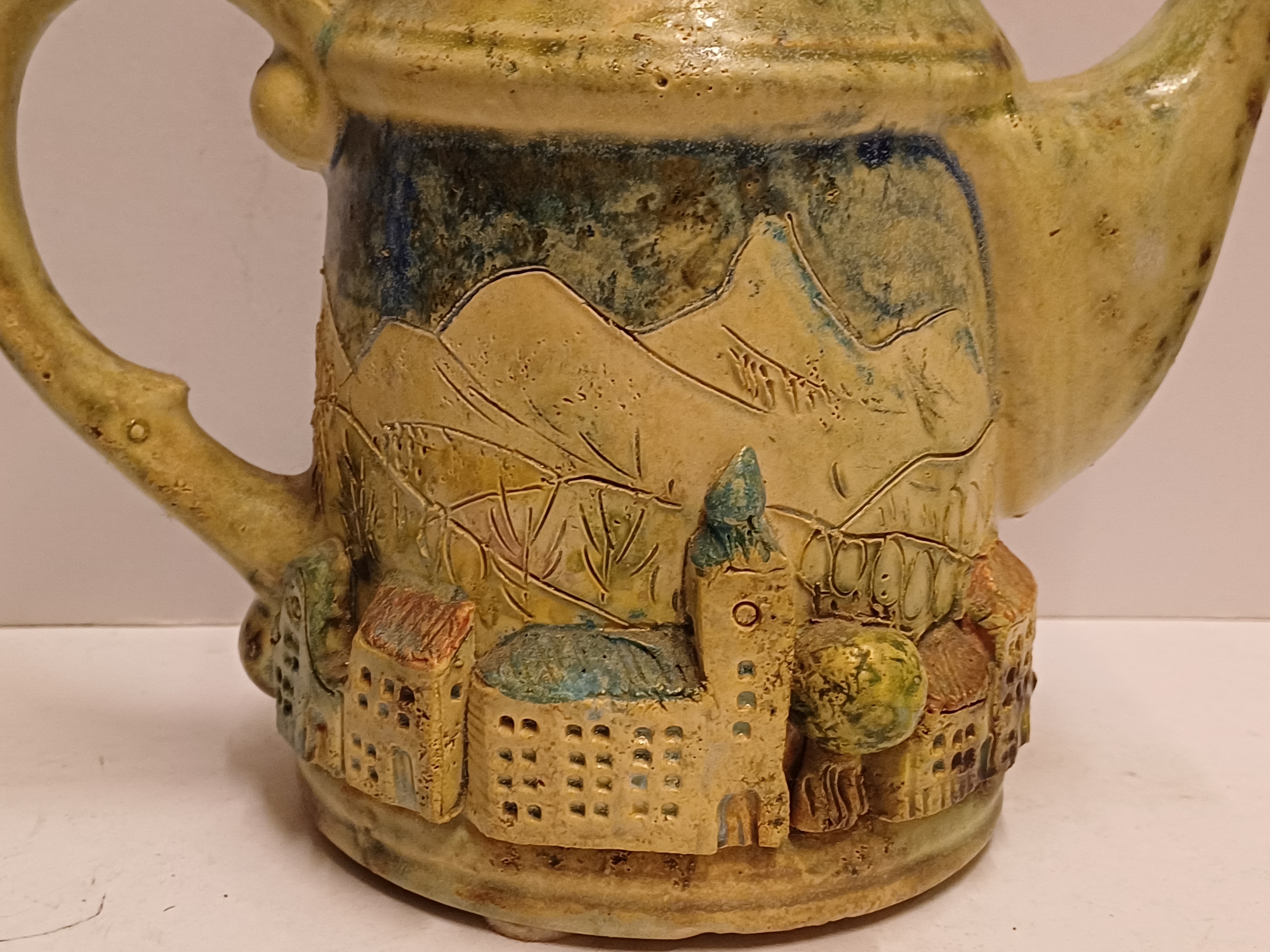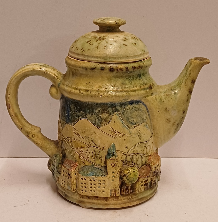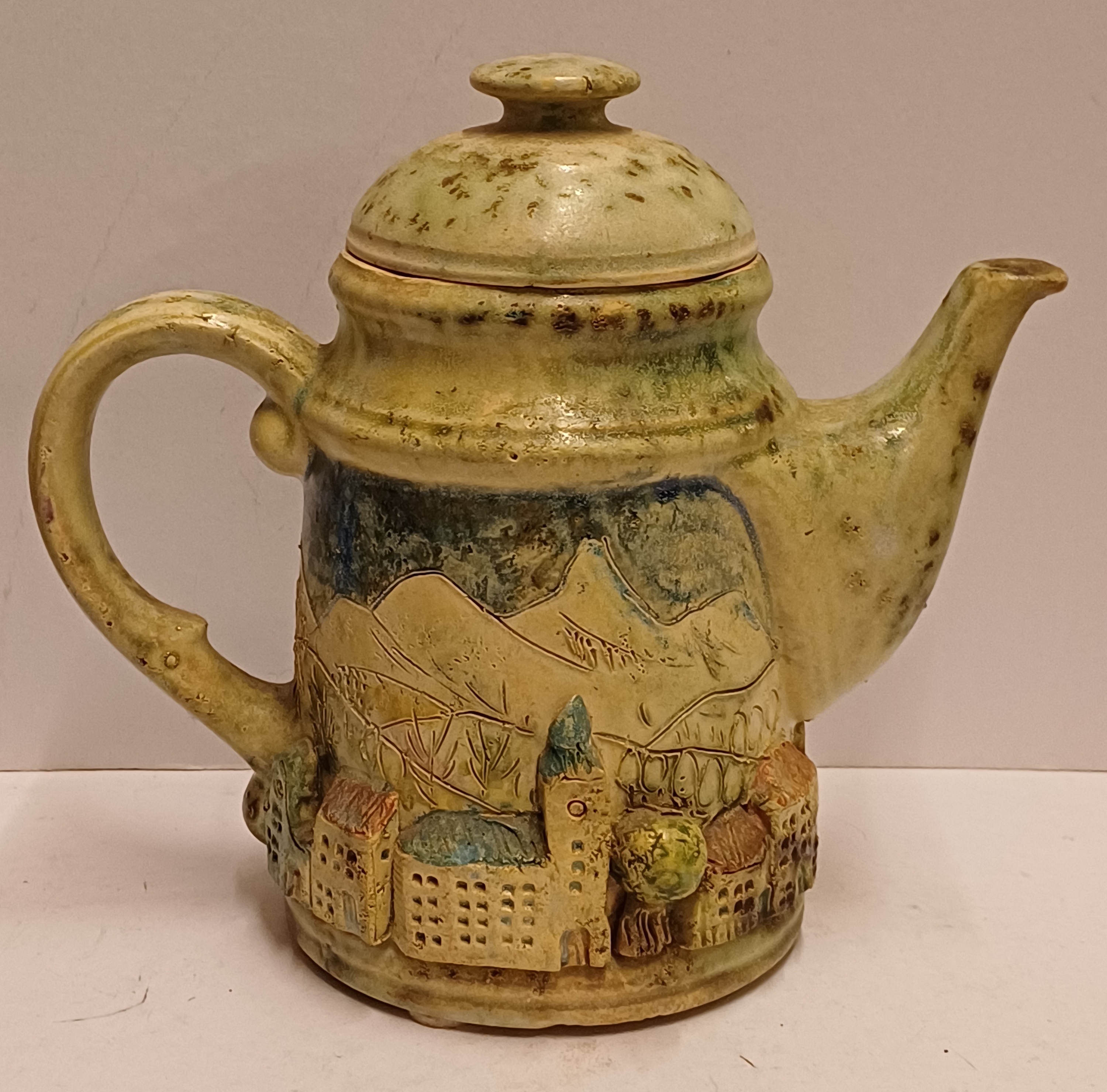 Aardewerken theepot met op de buik rondom een dorpsgezicht in relief, met licht groene glazuur. Onderzijde voluit gesigneerd