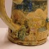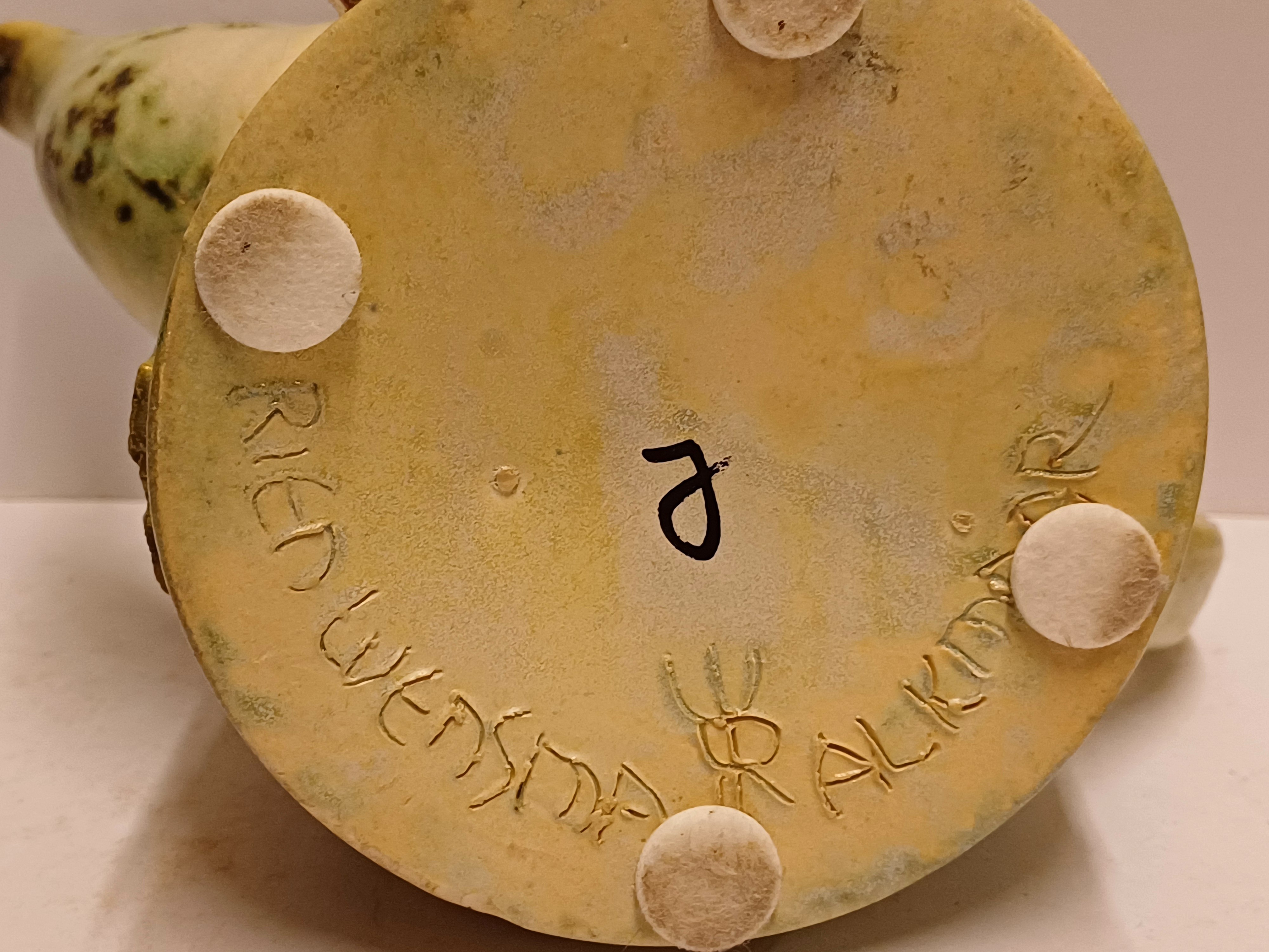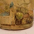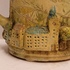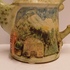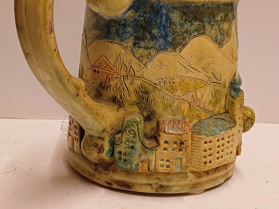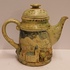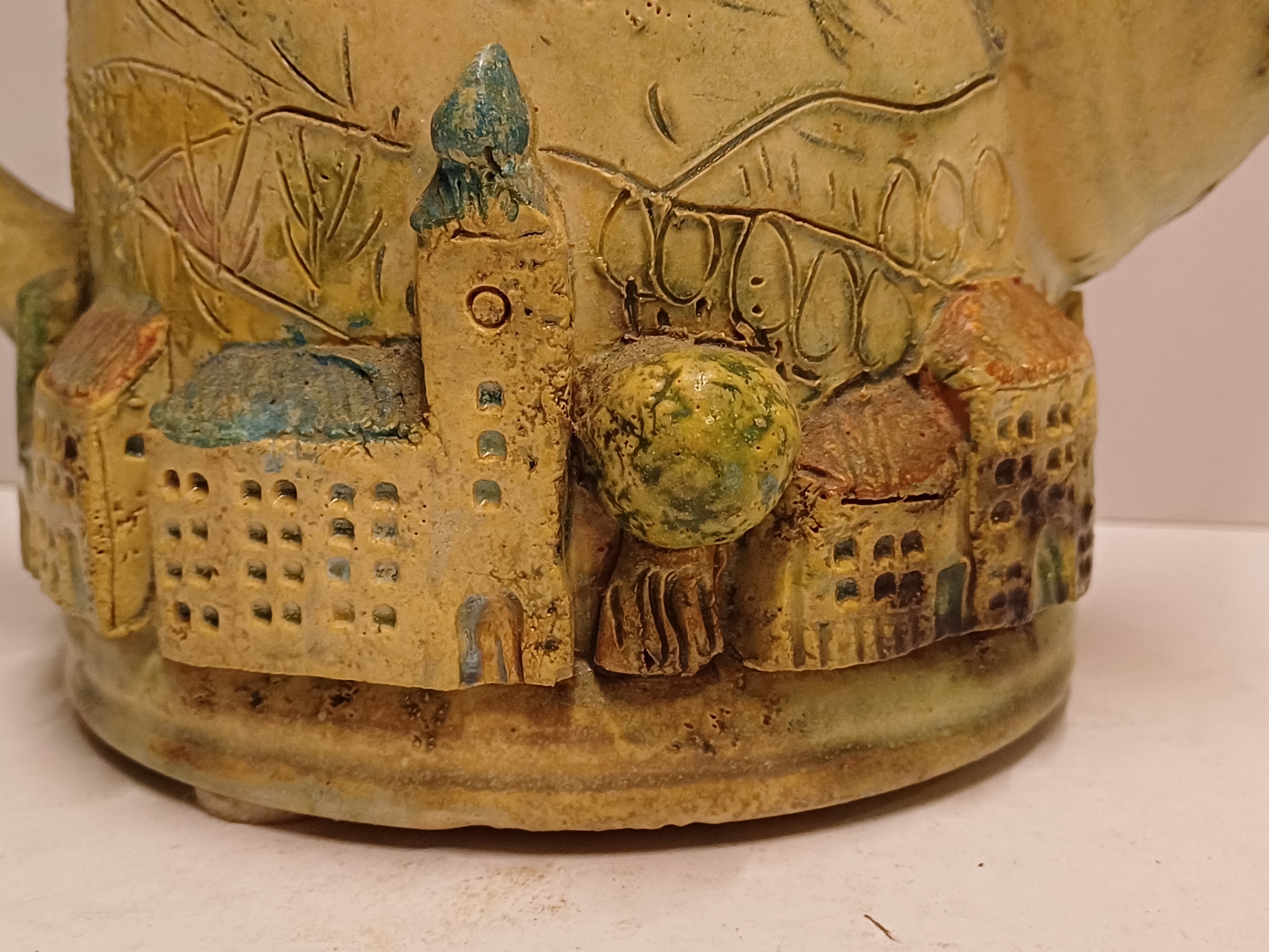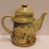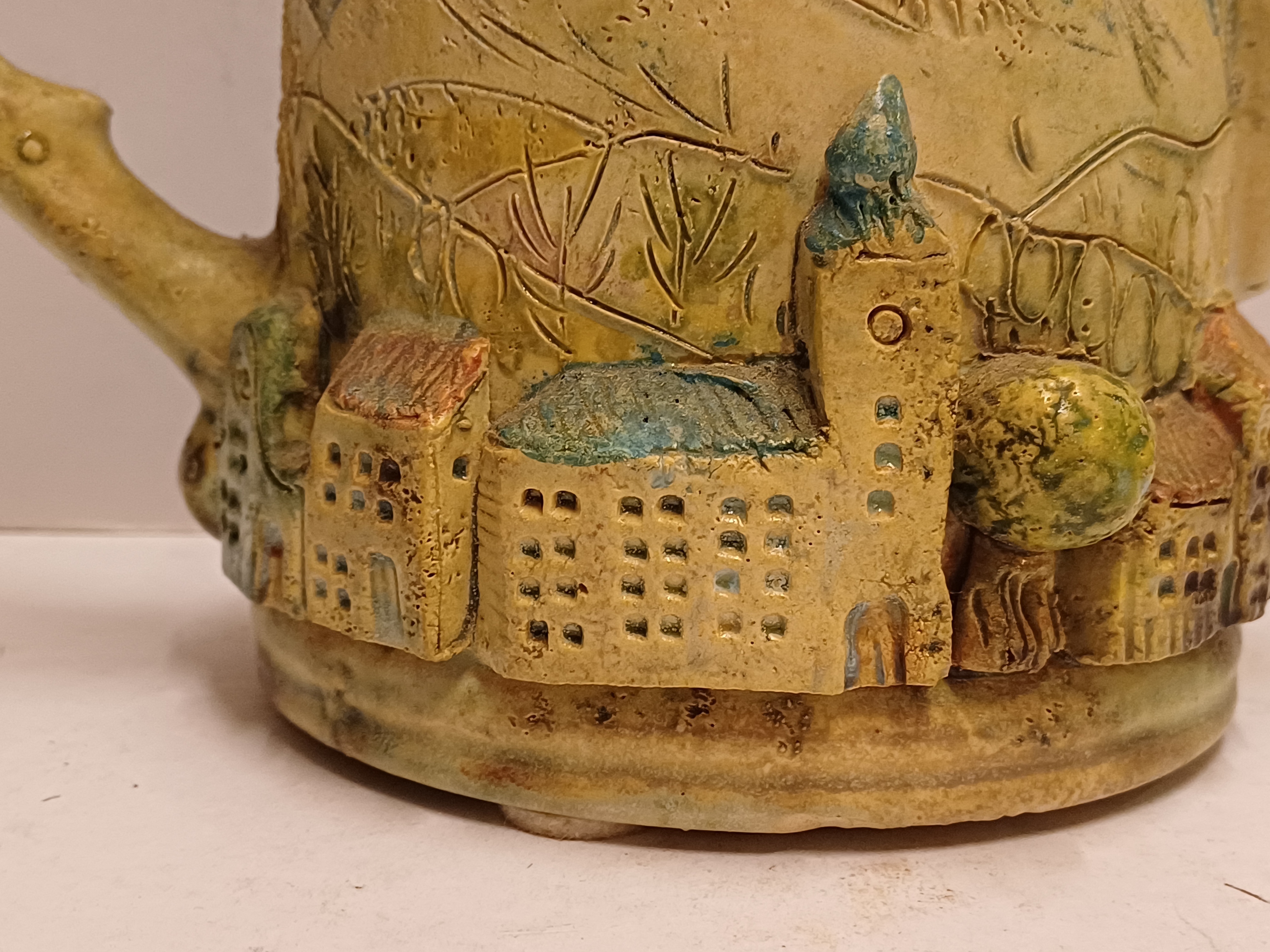 Aardewerken theepot met op de buik rondom een dorpsgezicht in relief, met licht groene glazuur. Onderzijde voluit gesigneerd