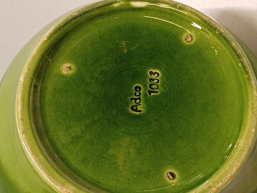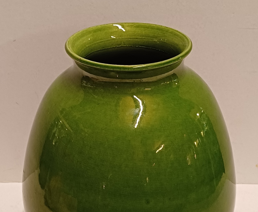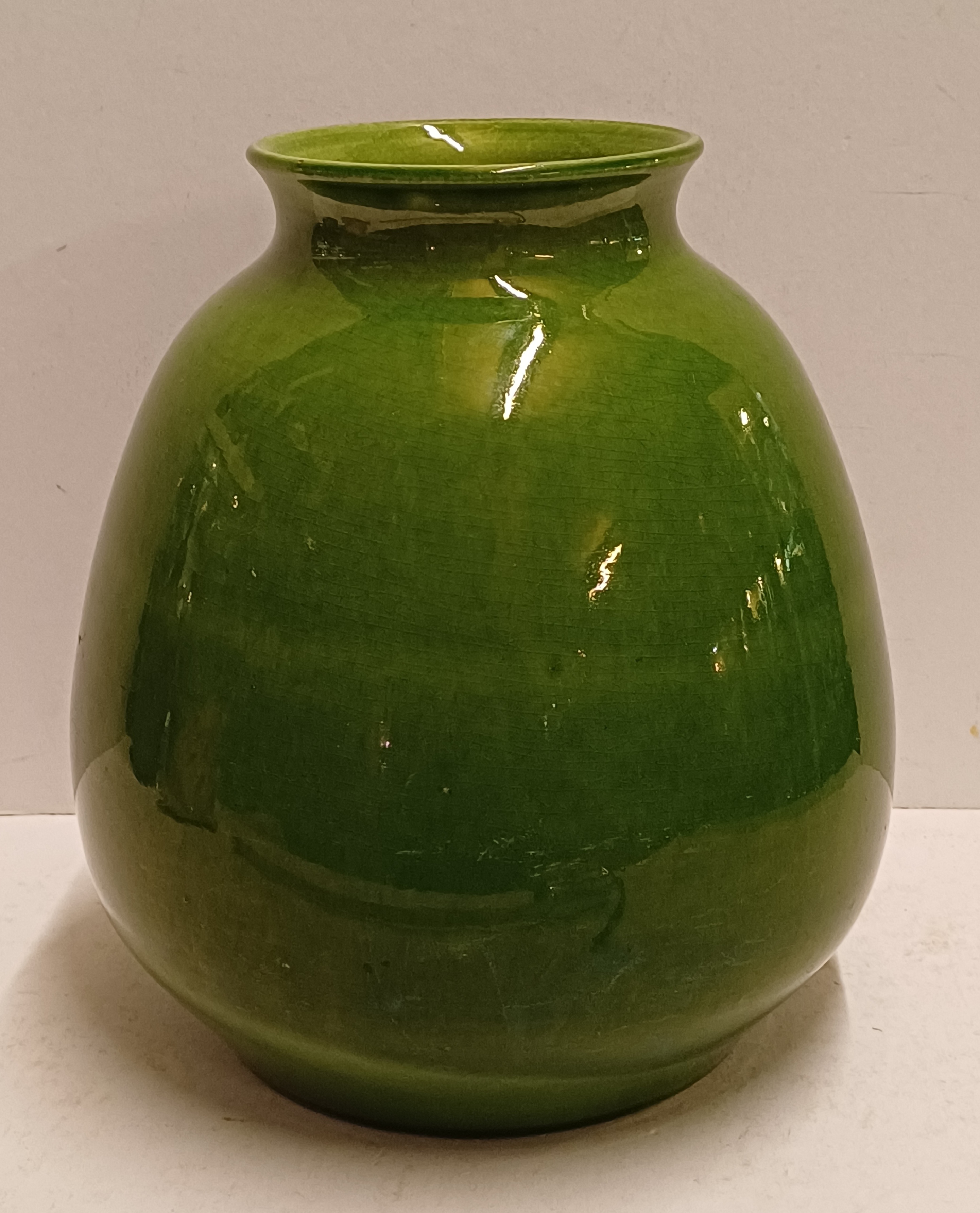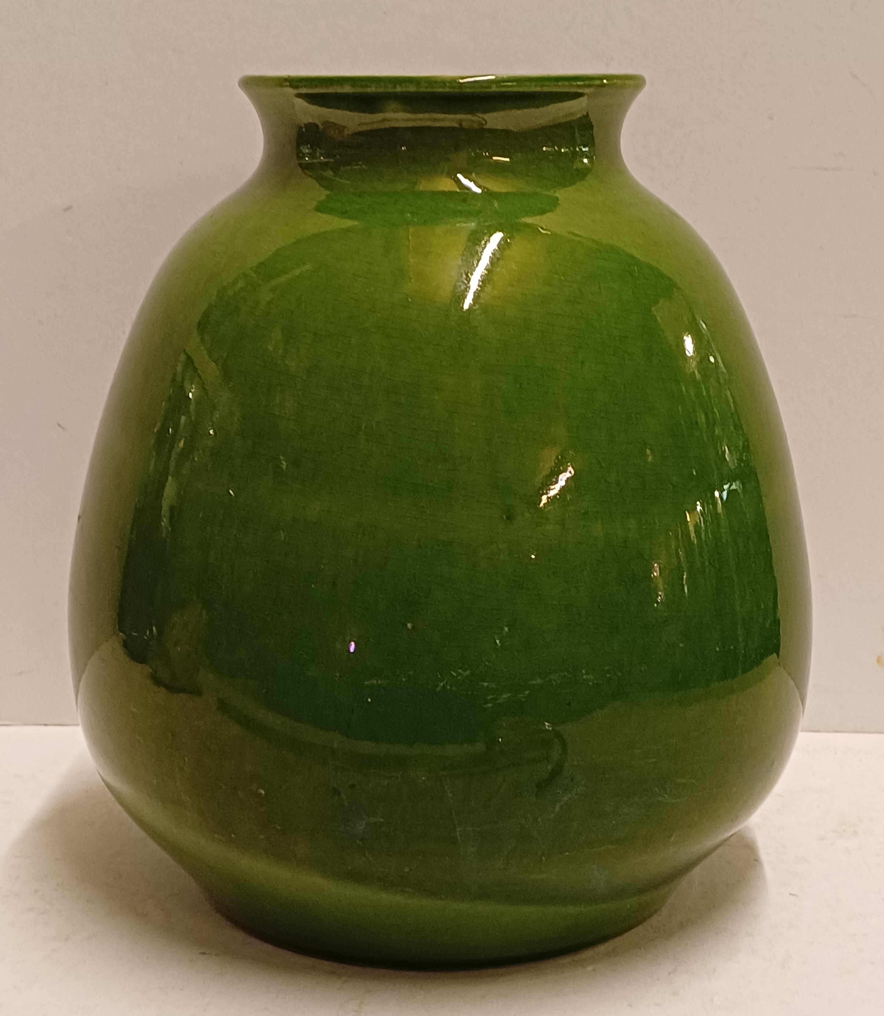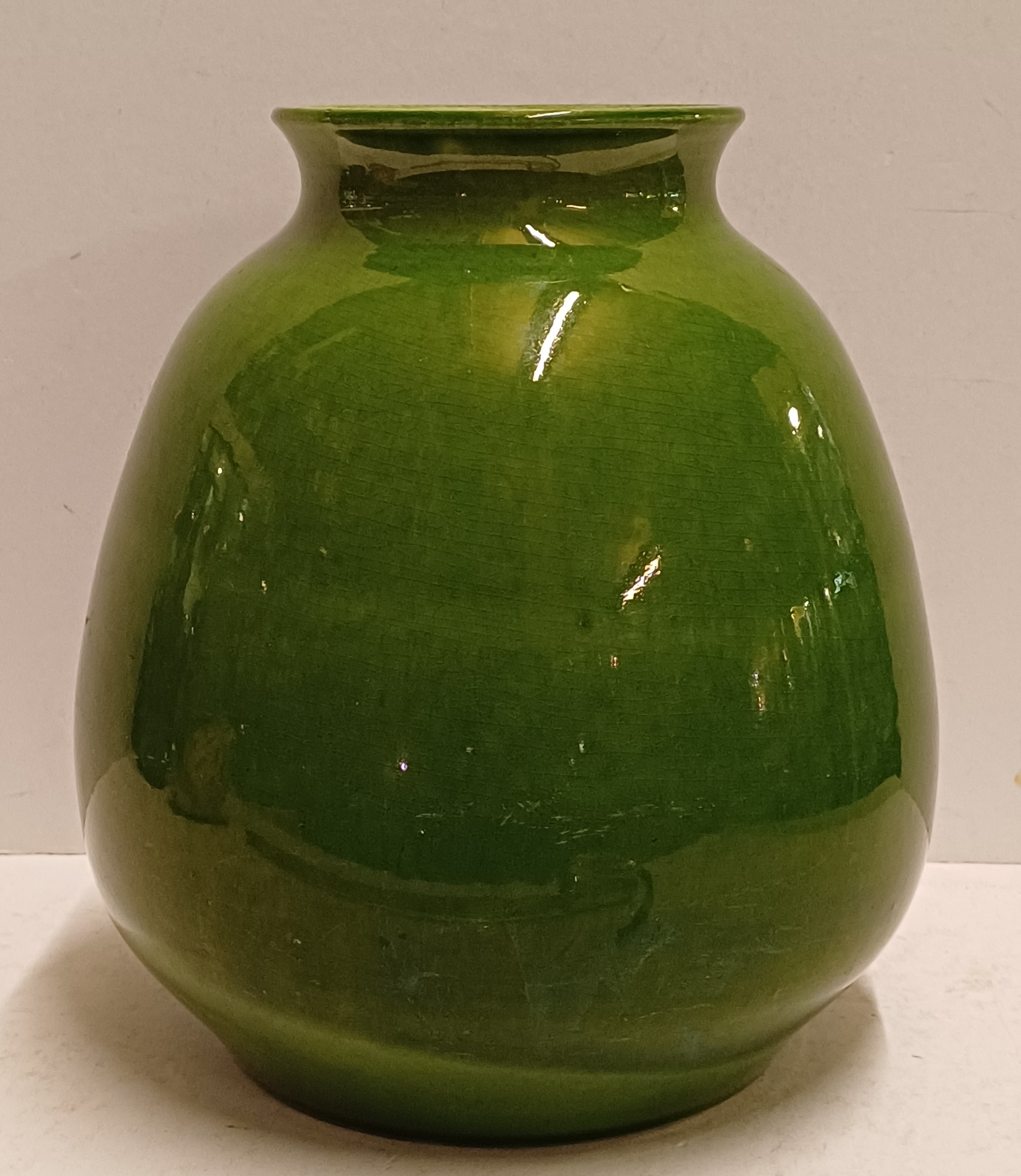 Aardewrrken vaas met boerengroene glazuur. Onderzijde met fabrieksmerk en modelnummer 1033.