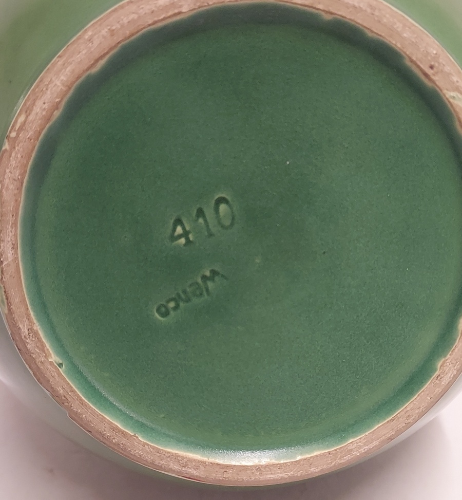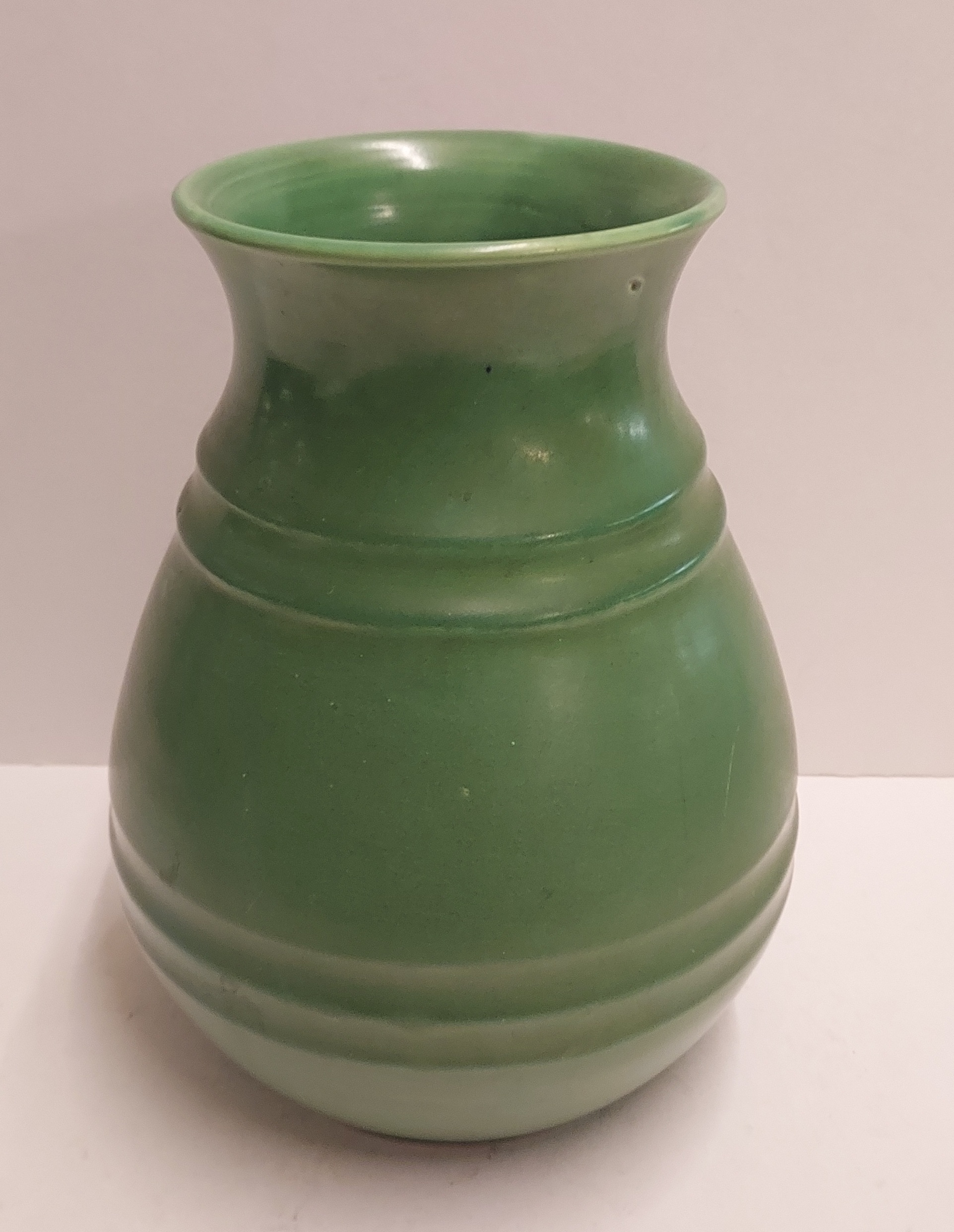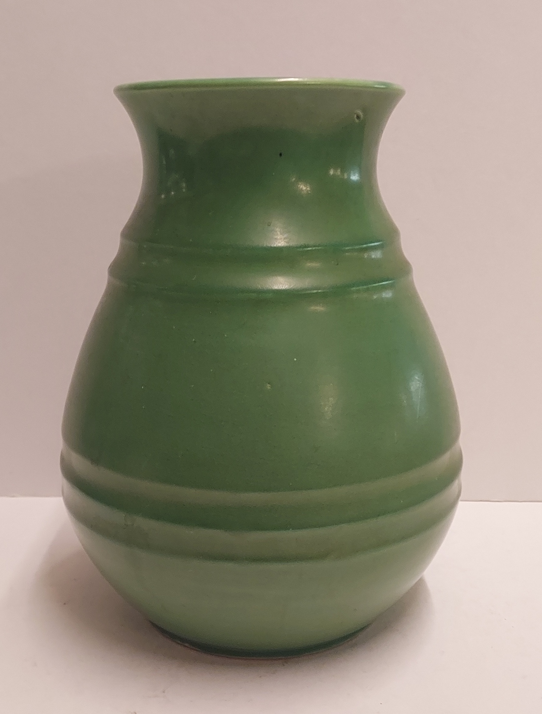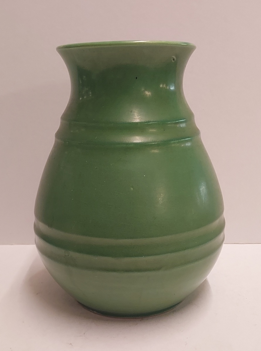 Groen geglazuurde vaas met dubbele insnoering. Onderzijde met fsabrieksmerk.