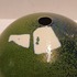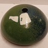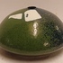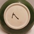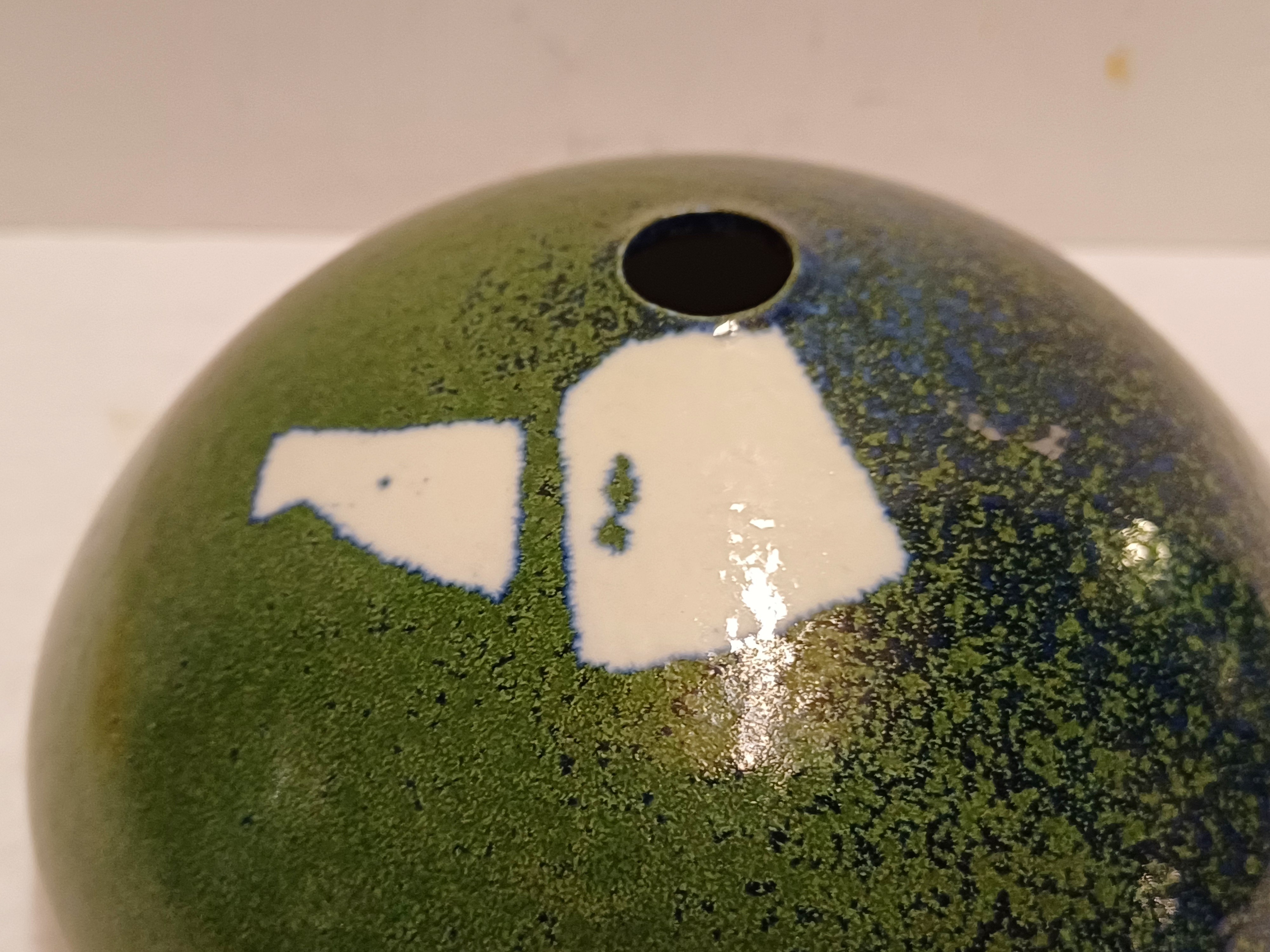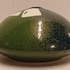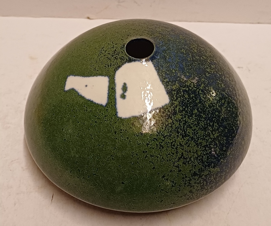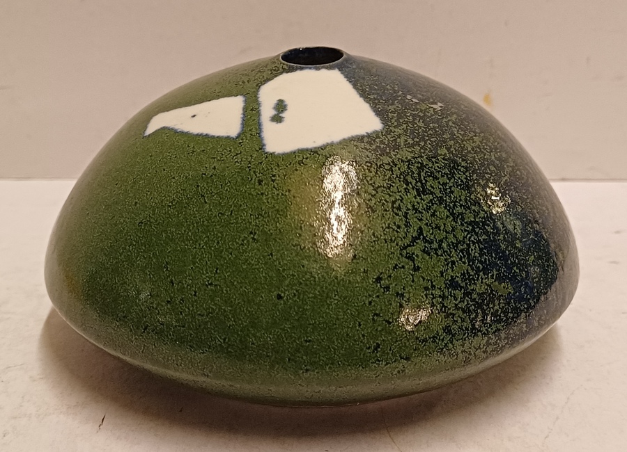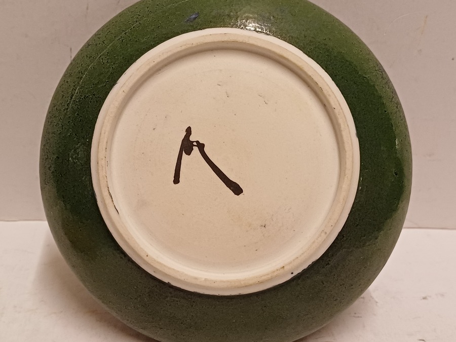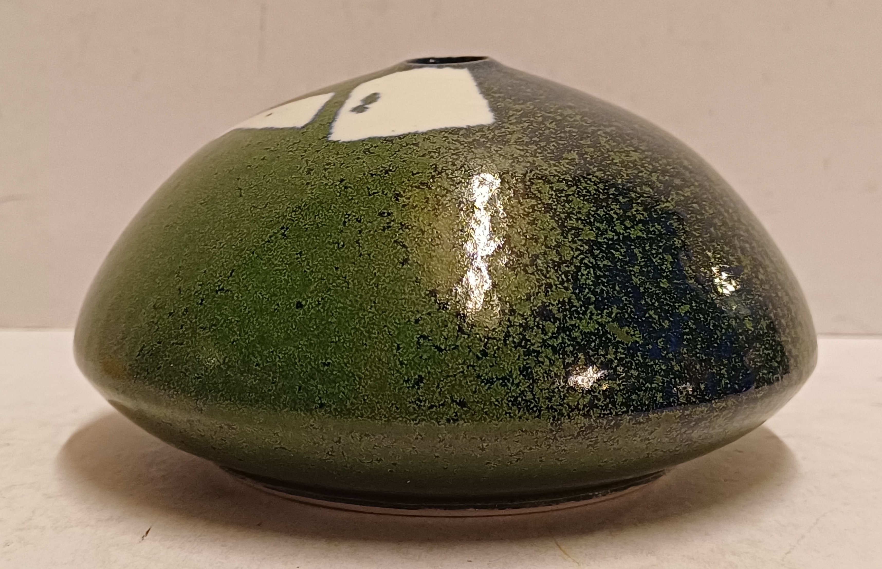 Steengoed platte vaas met groene glazuur en 2 witte vlakken. Onderzijde met signatuur.