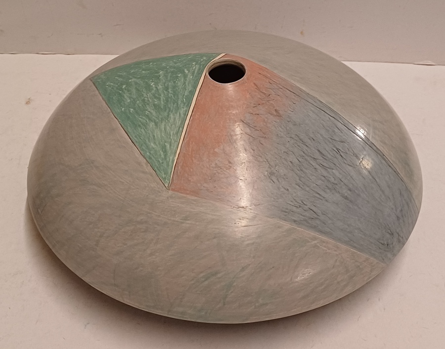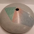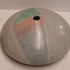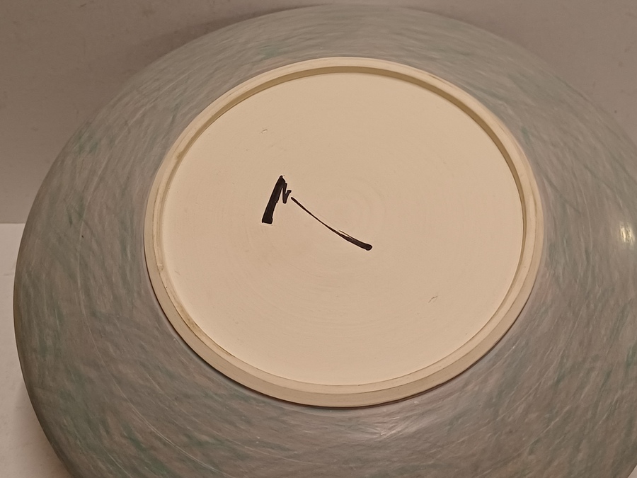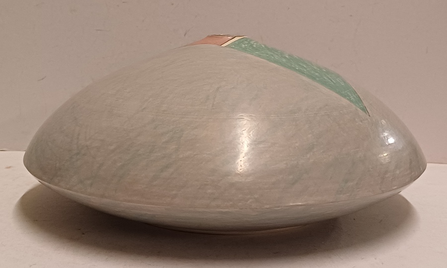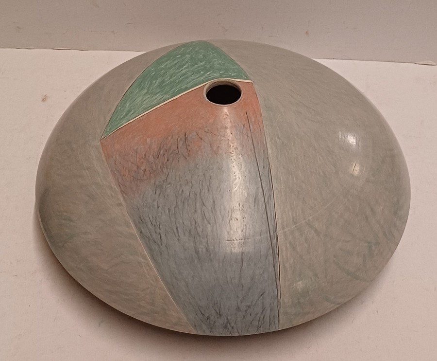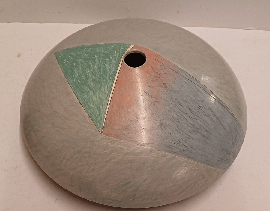Steengoed platte vaas "oog" met gekleurde vlakverdeling. Onderzijde met signatuur.