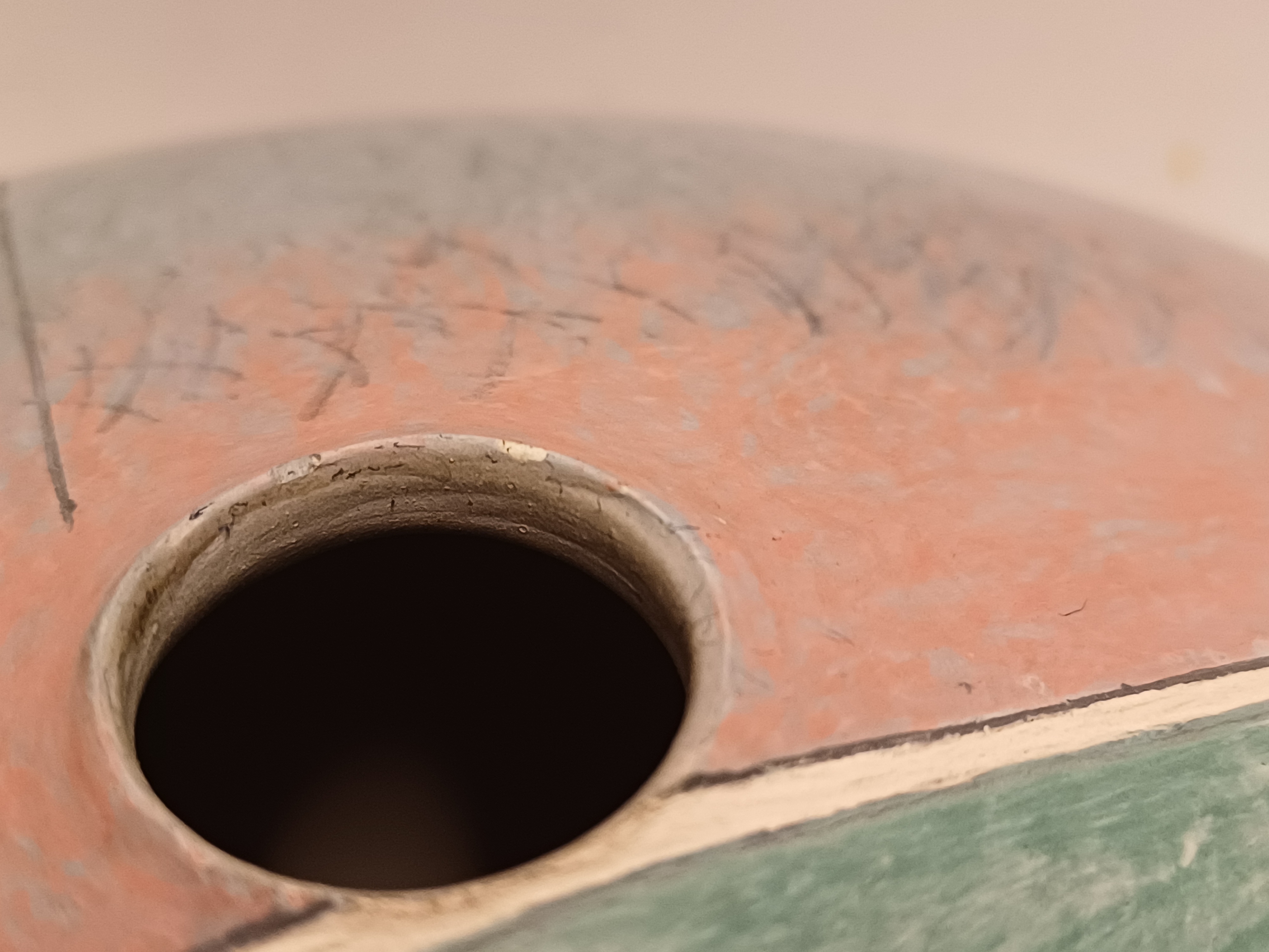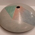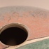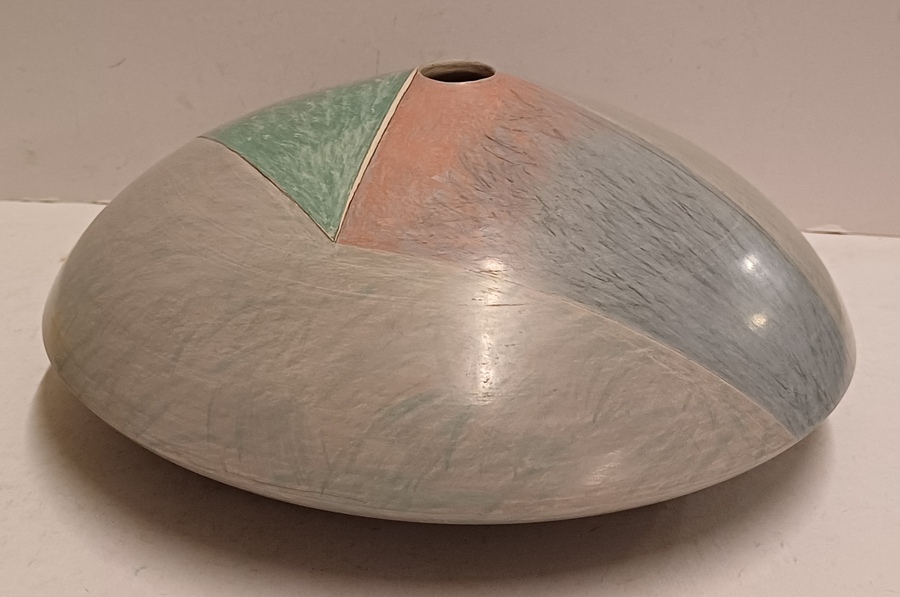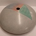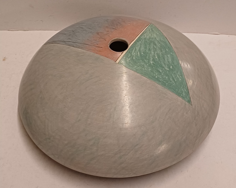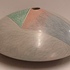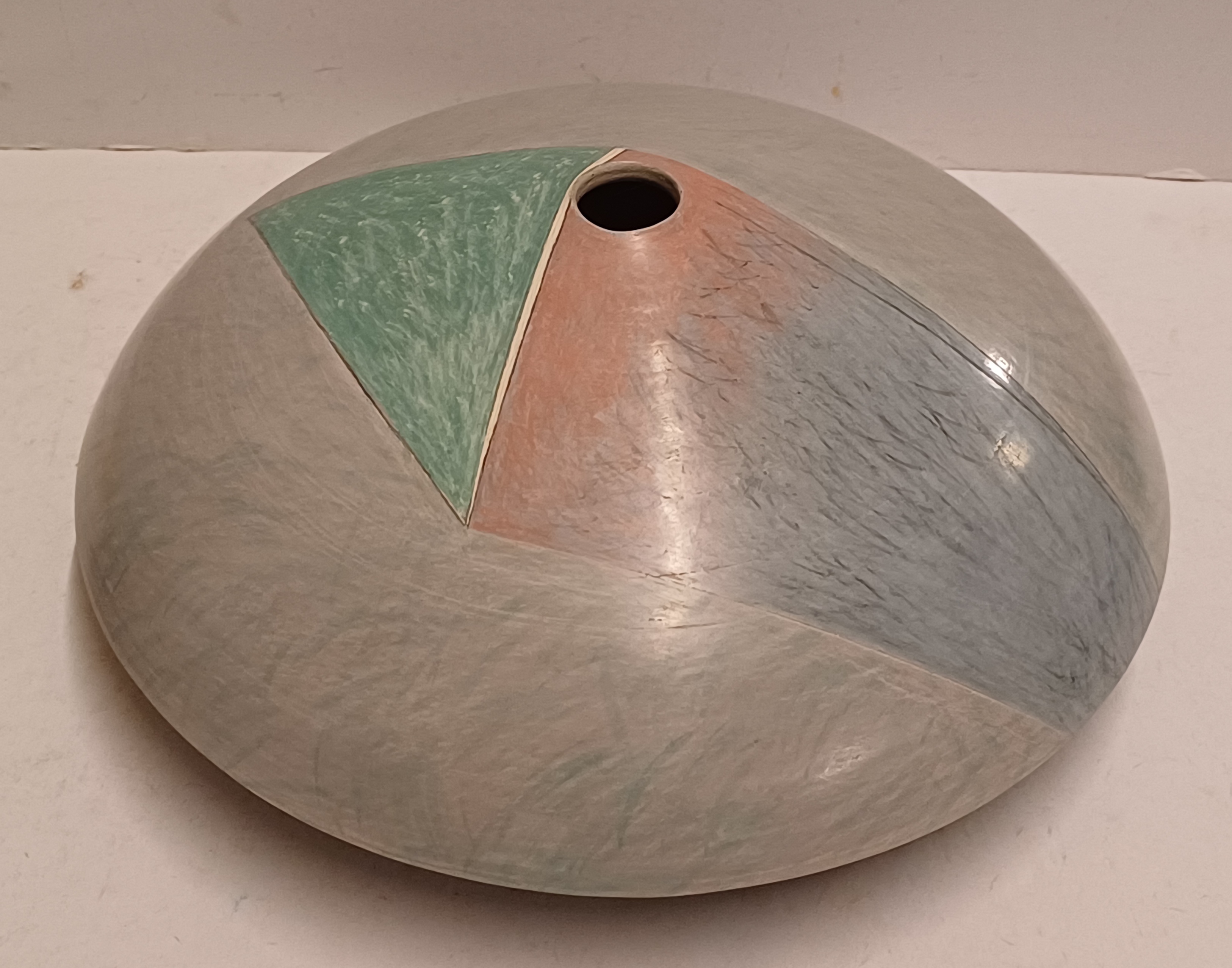 Steengoed platte vaas "oog" met gekleurde vlakverdeling. Onderzijde met signatuur.