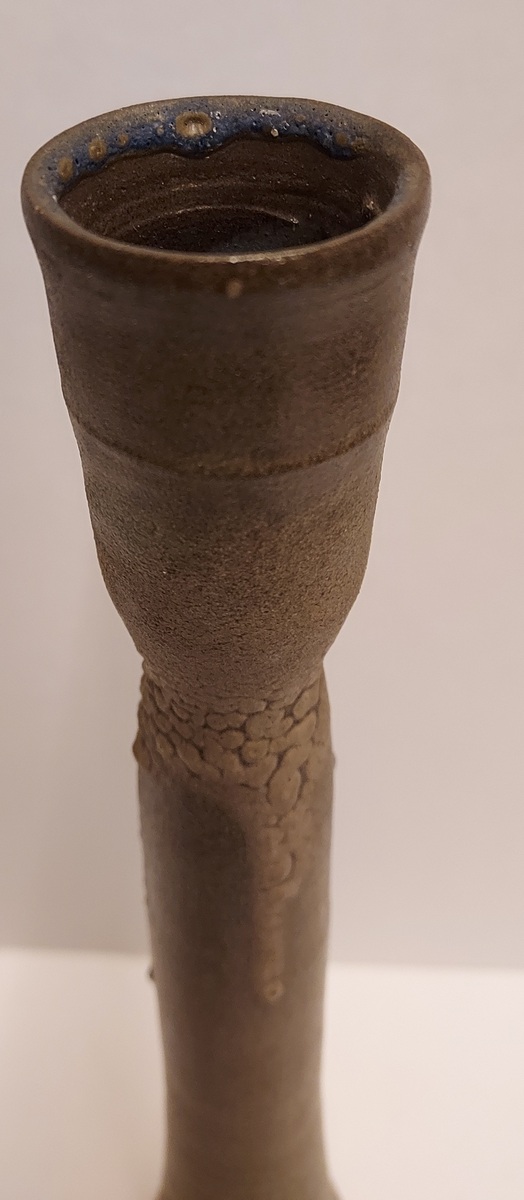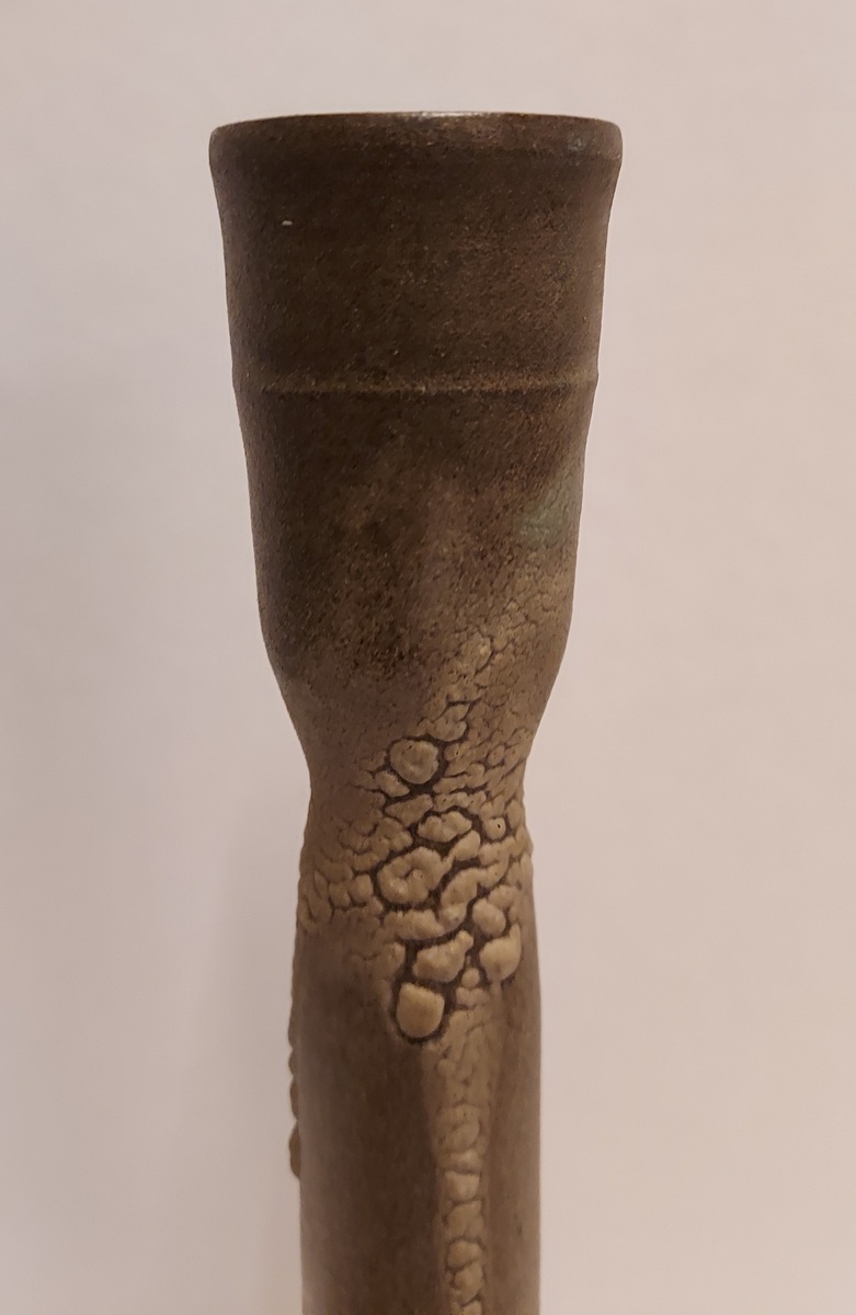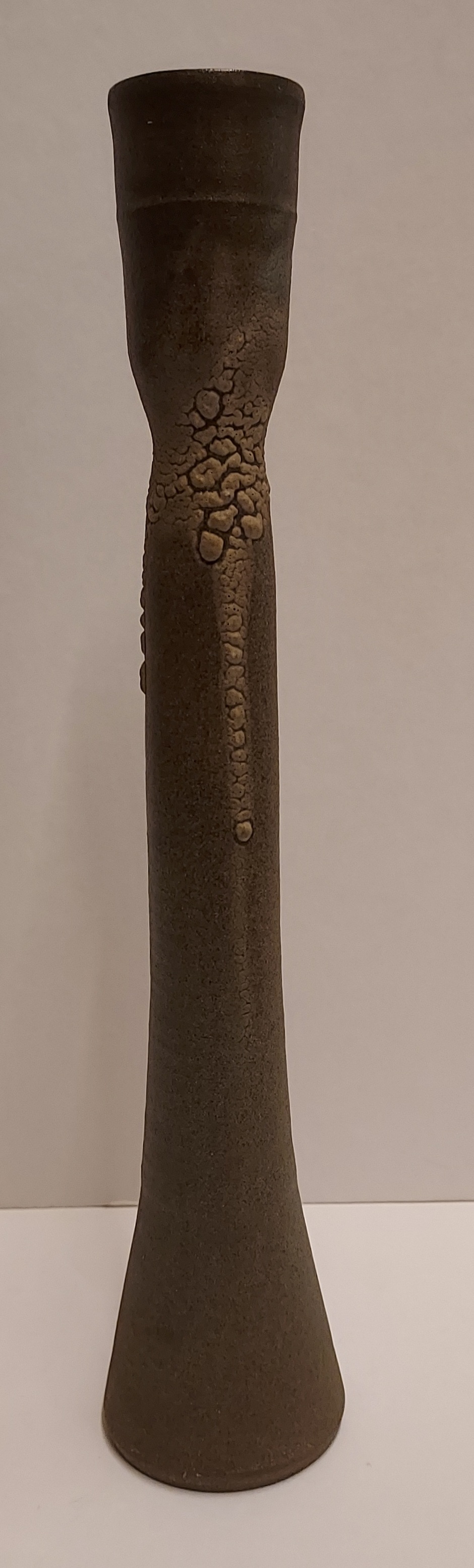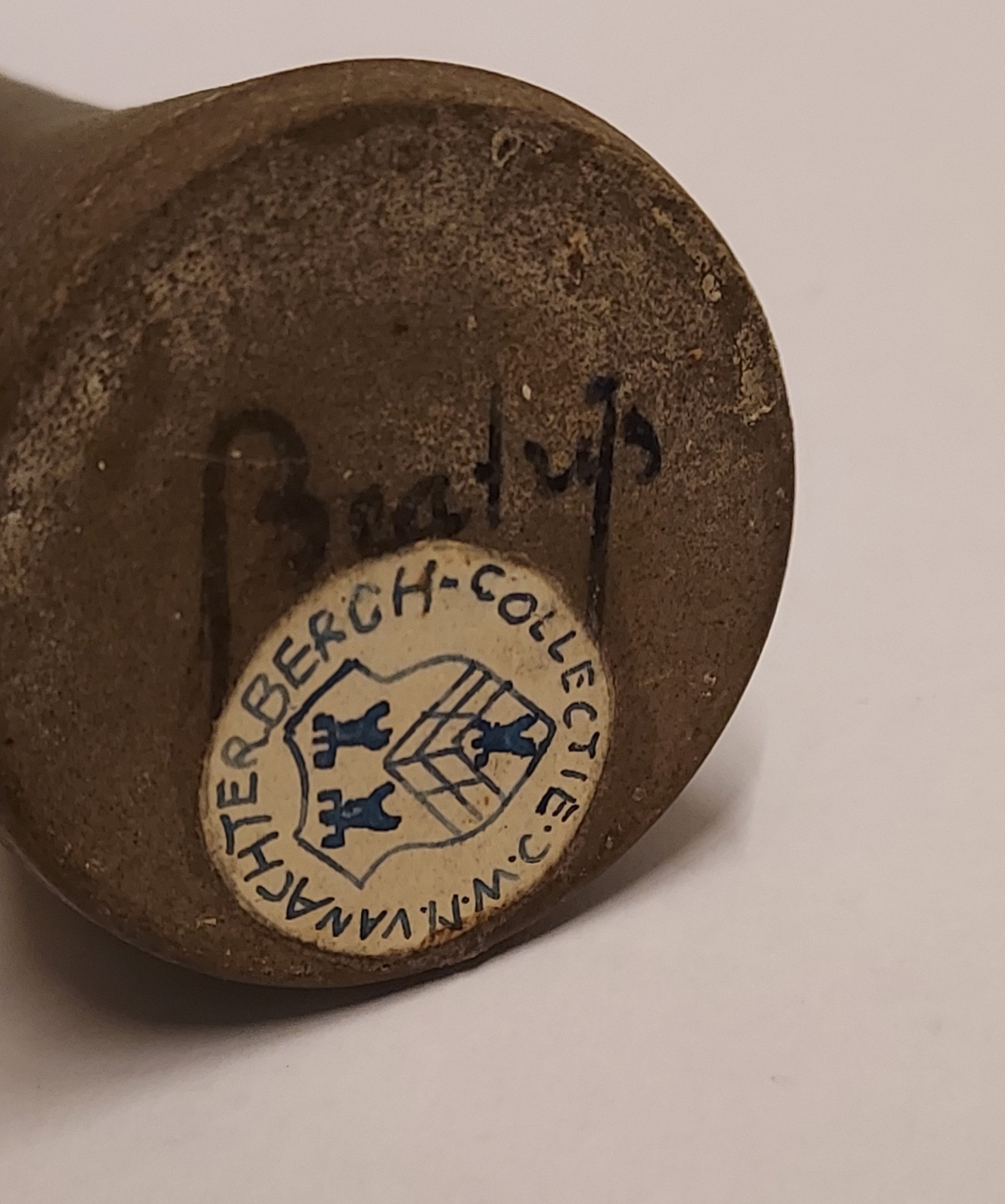 Langgerekte vaas met bruinige glazuur. Onderzijde gesigneerd Beatrijs .