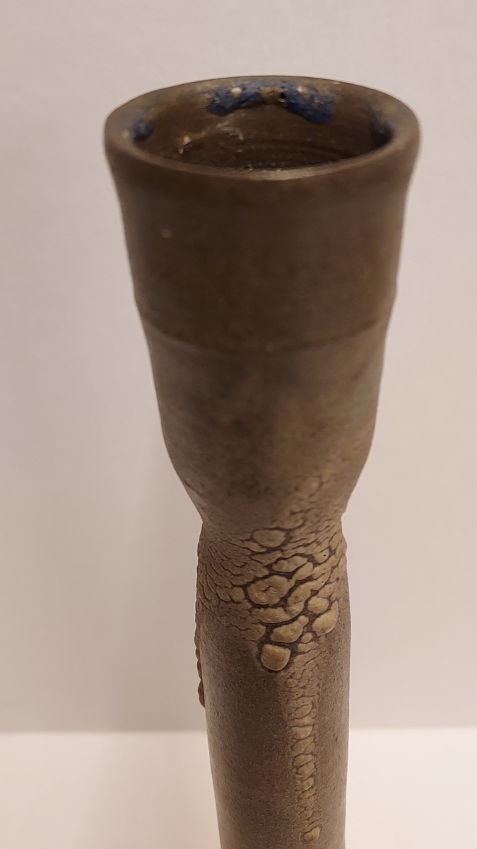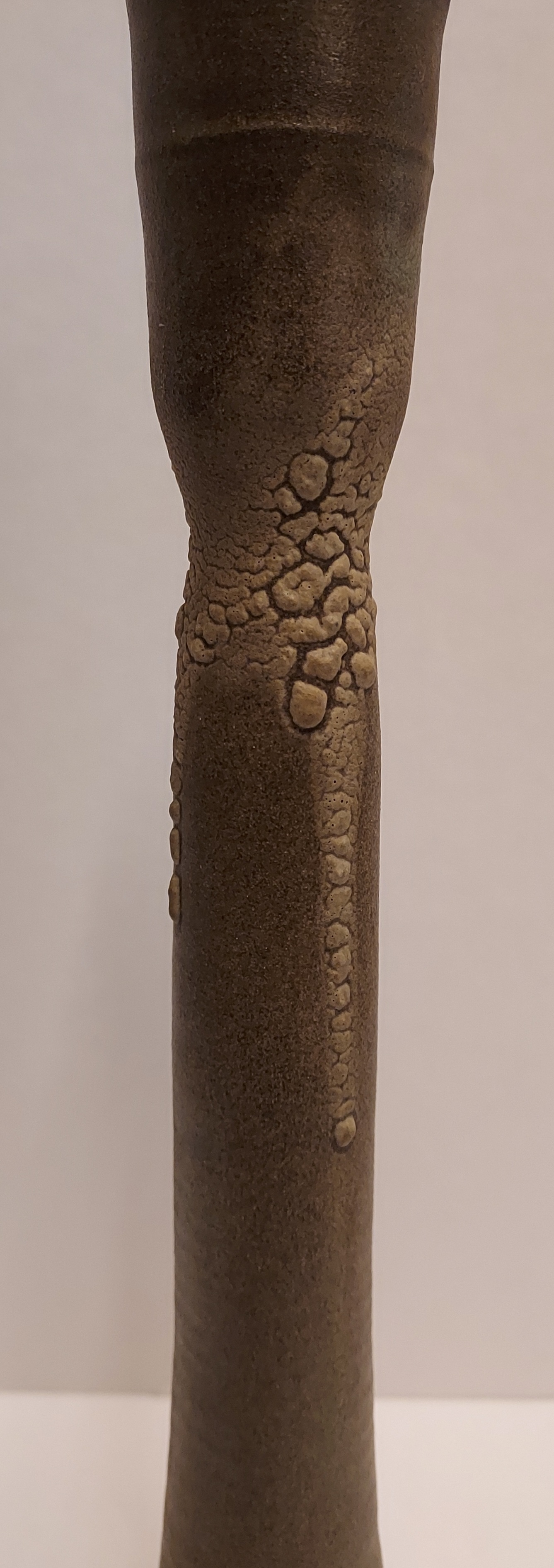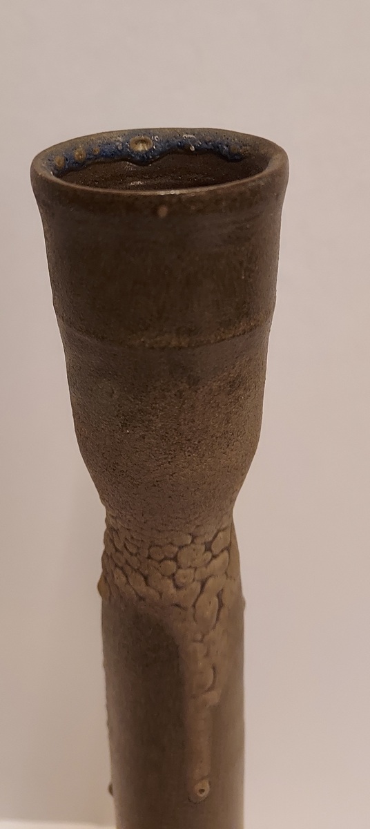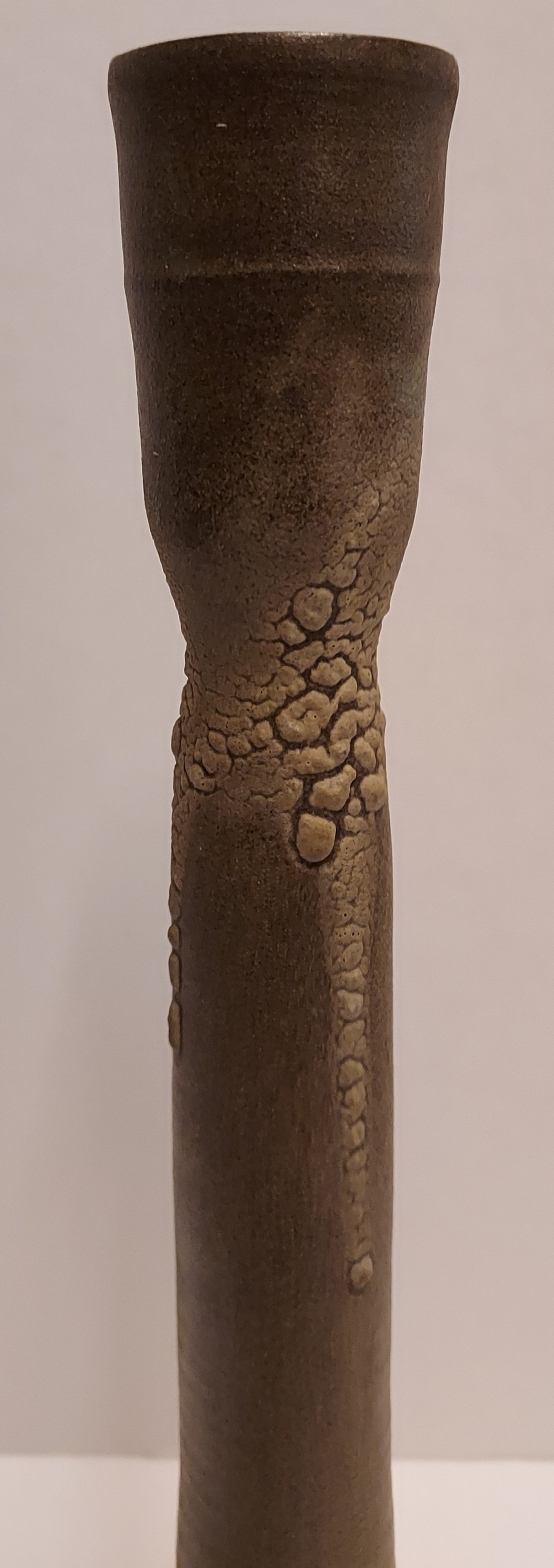 Langgerekte vaas met bruinige glazuur. Onderzijde gesigneerd Beatrijs .