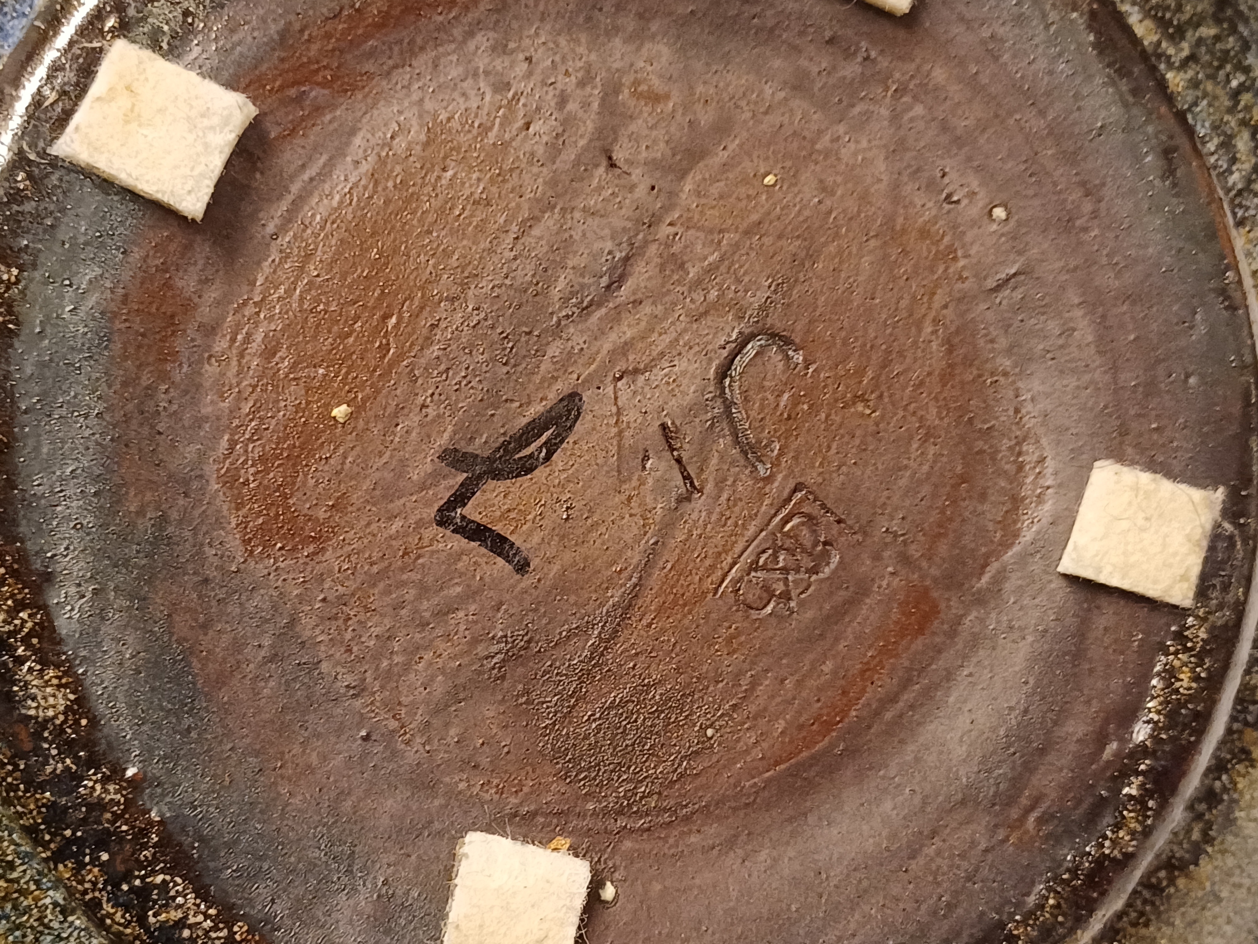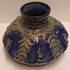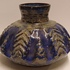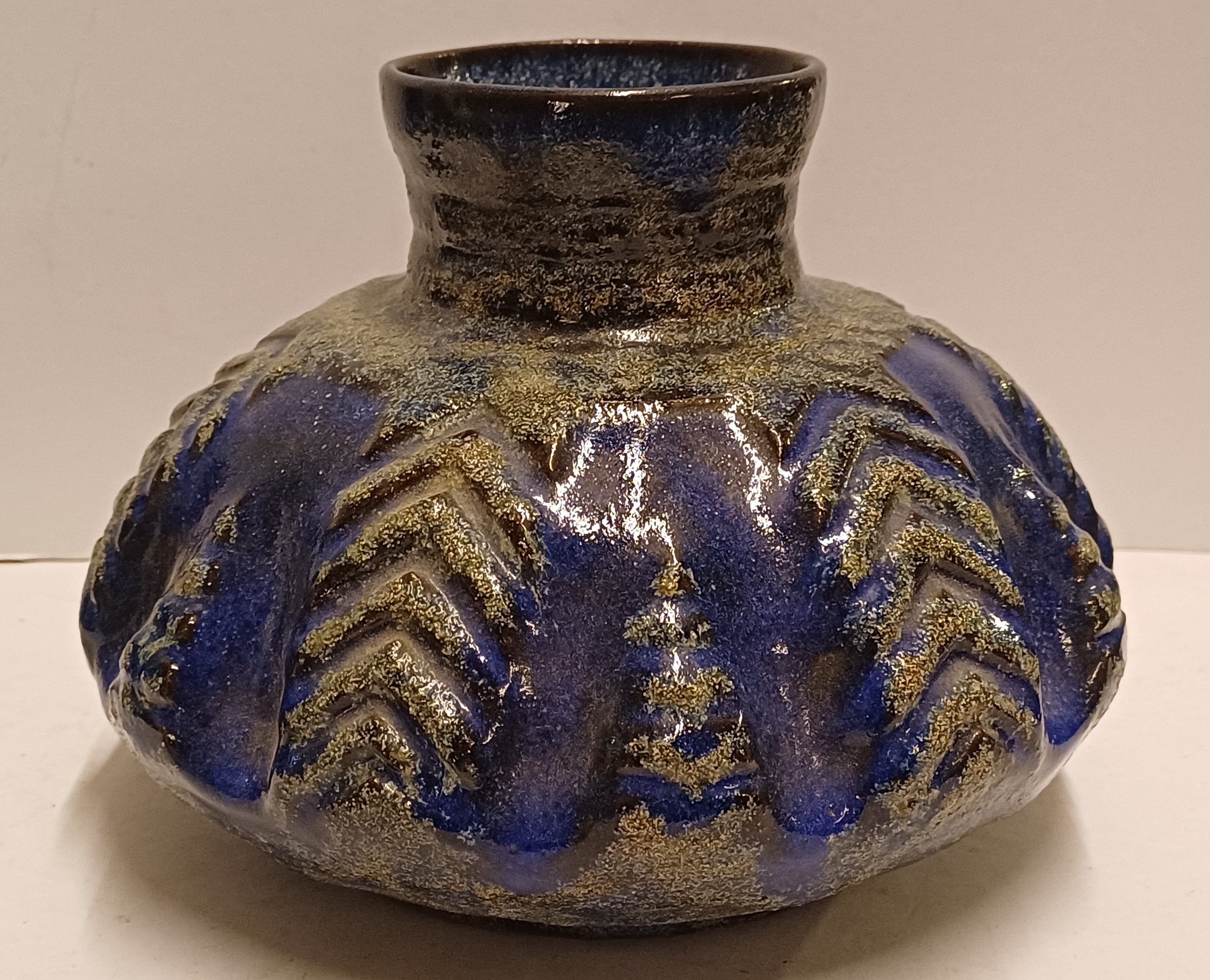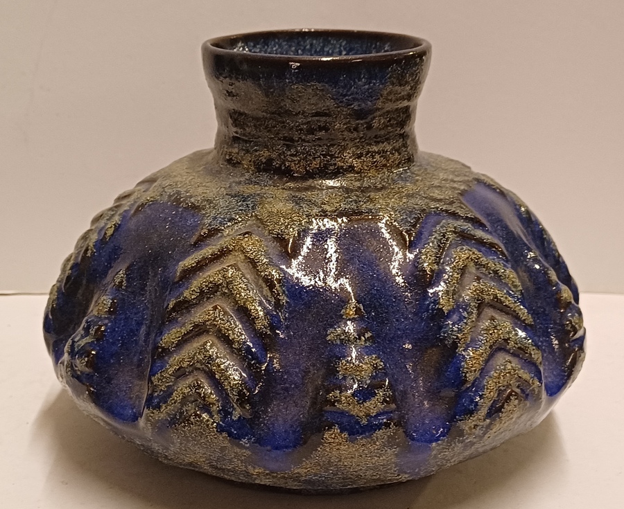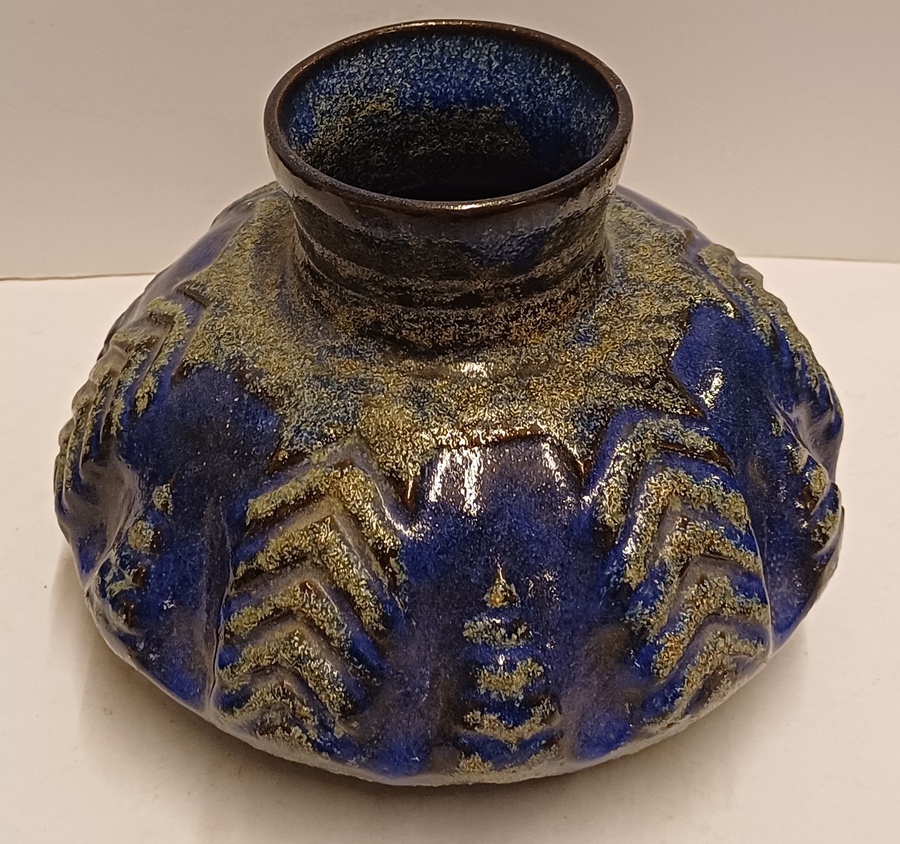 Aardewerken vaas met relief decor op de buik met donkerblauwe glazuur. Onderzijde met fabrieksmerk.