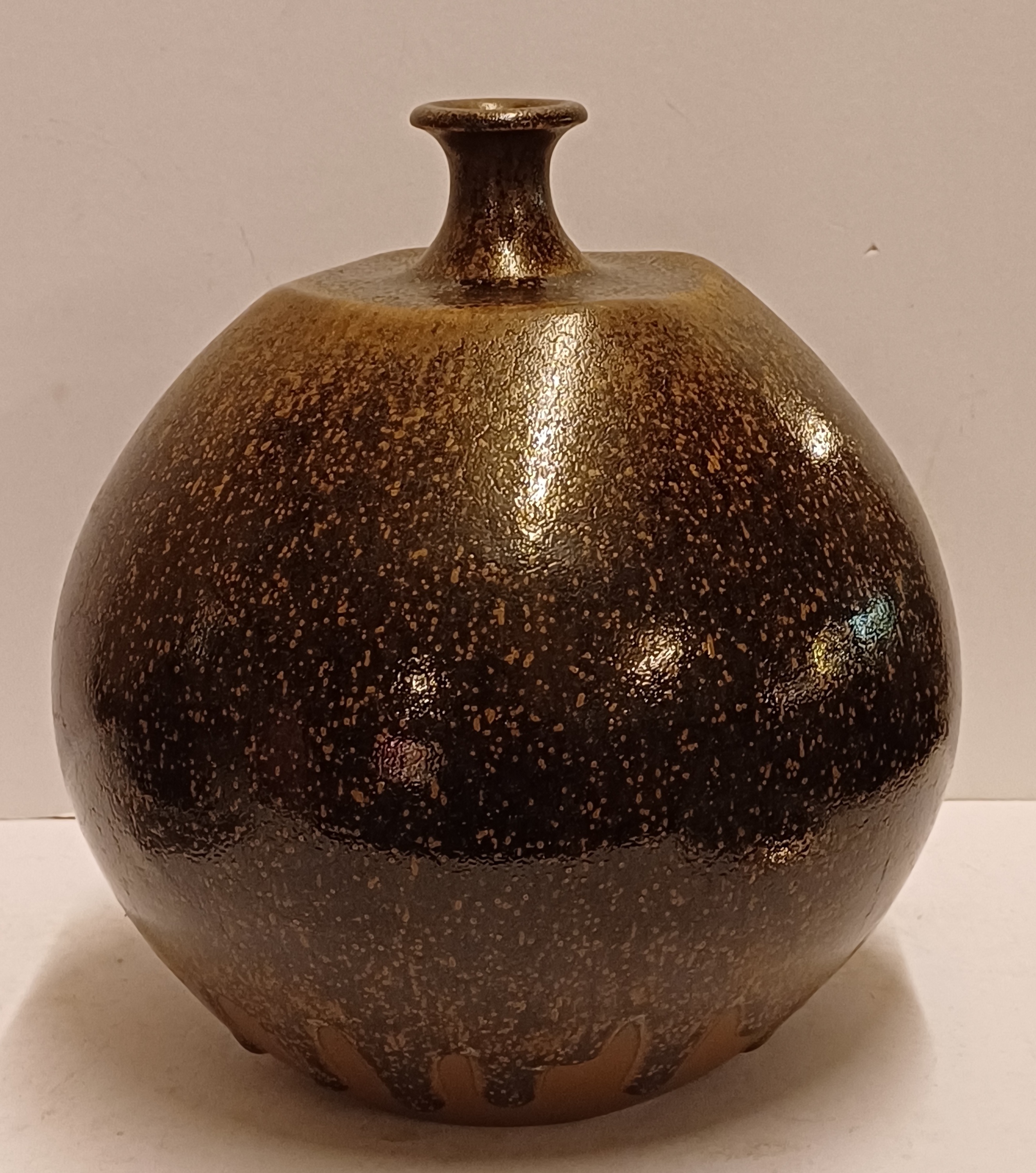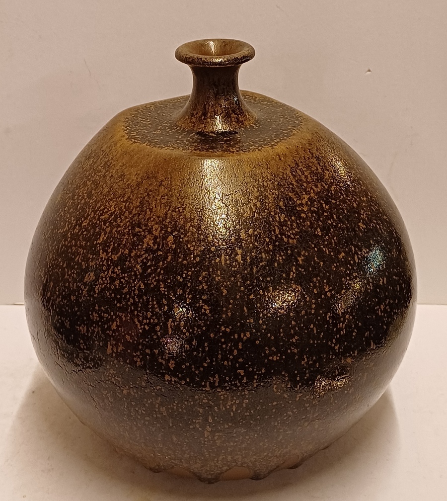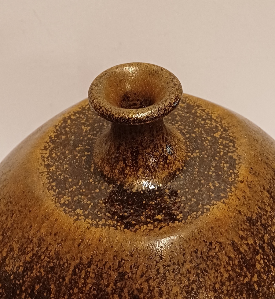 Grote bruin geglazuurde vaas met kleine mondopening. Onderzijde gesigneerd en gedateerd ´74