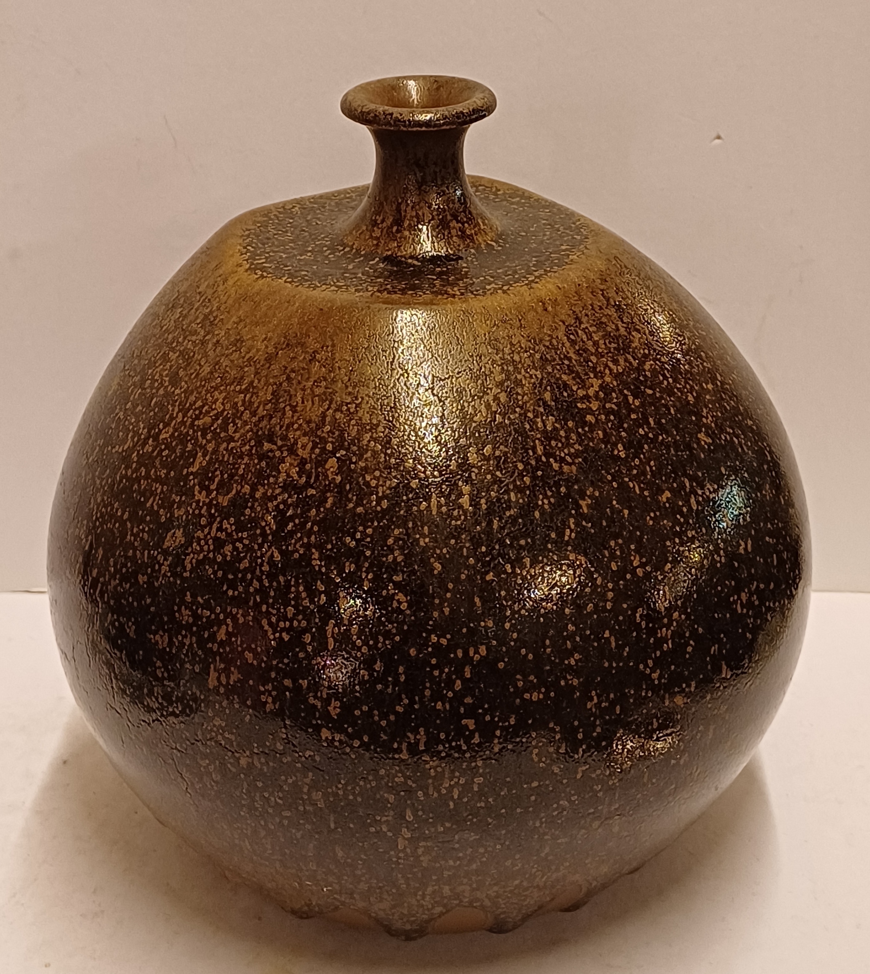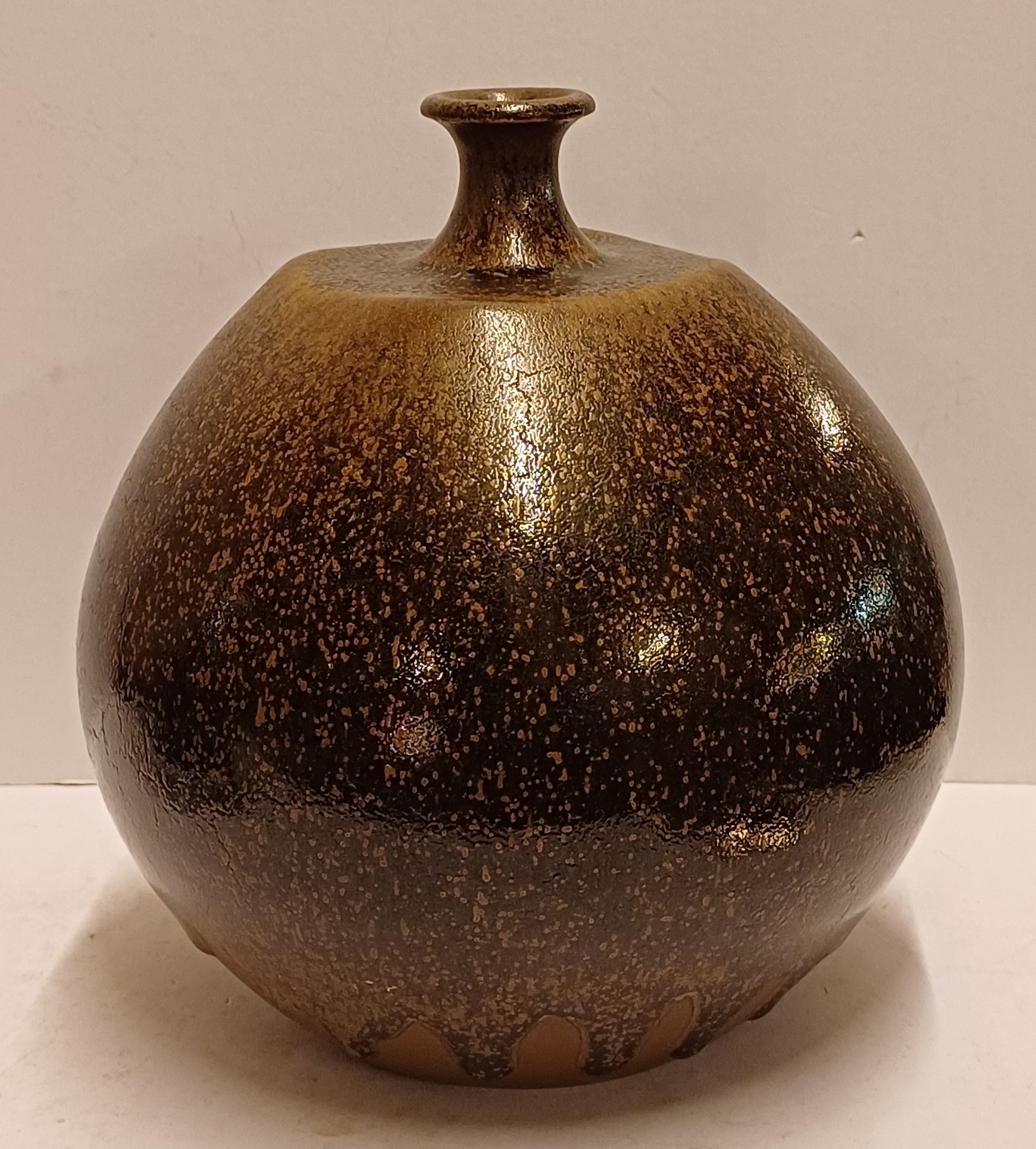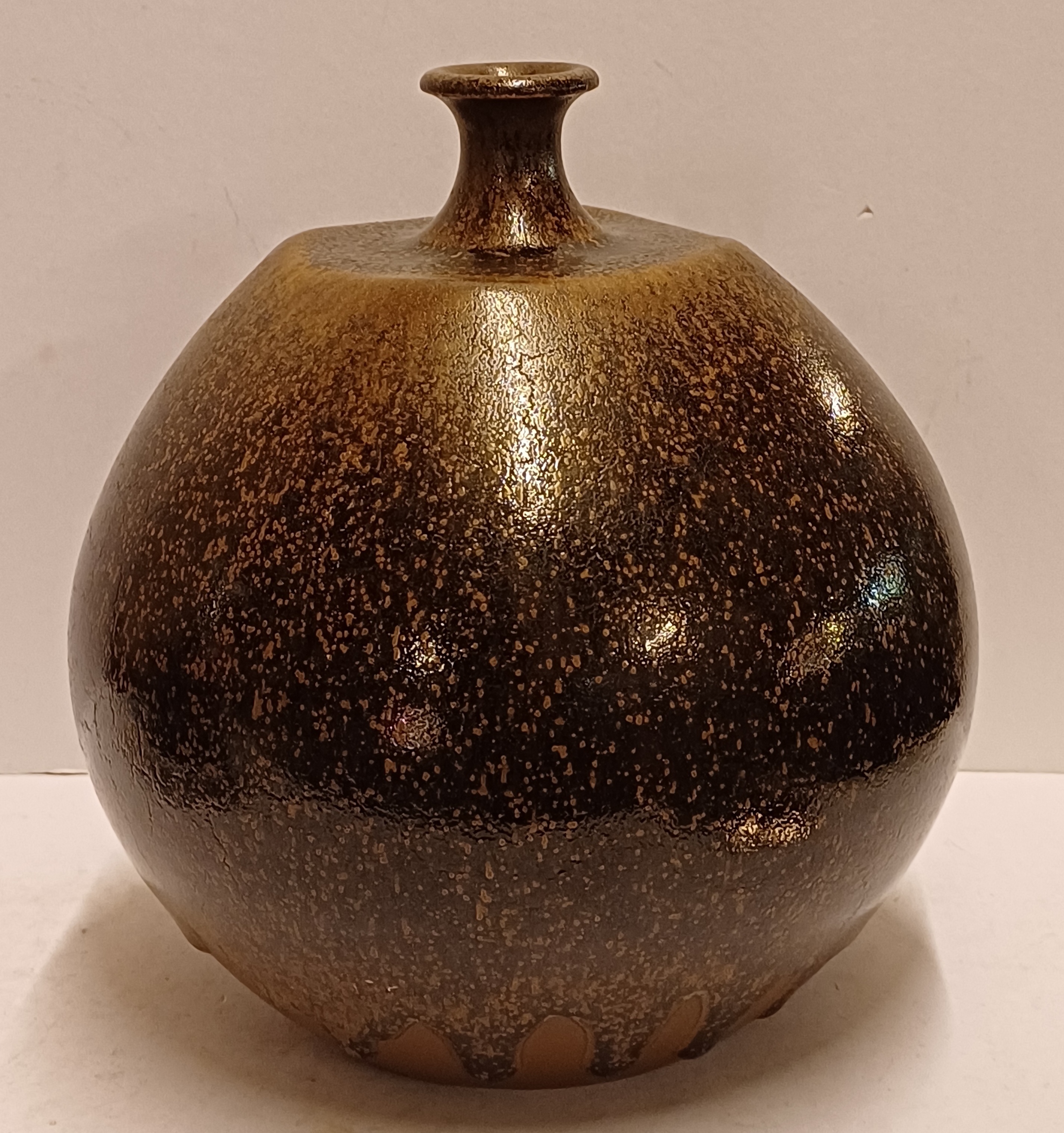Grote bruin geglazuurde vaas met kleine mondopening. Onderzijde gesigneerd en gedateerd ´74