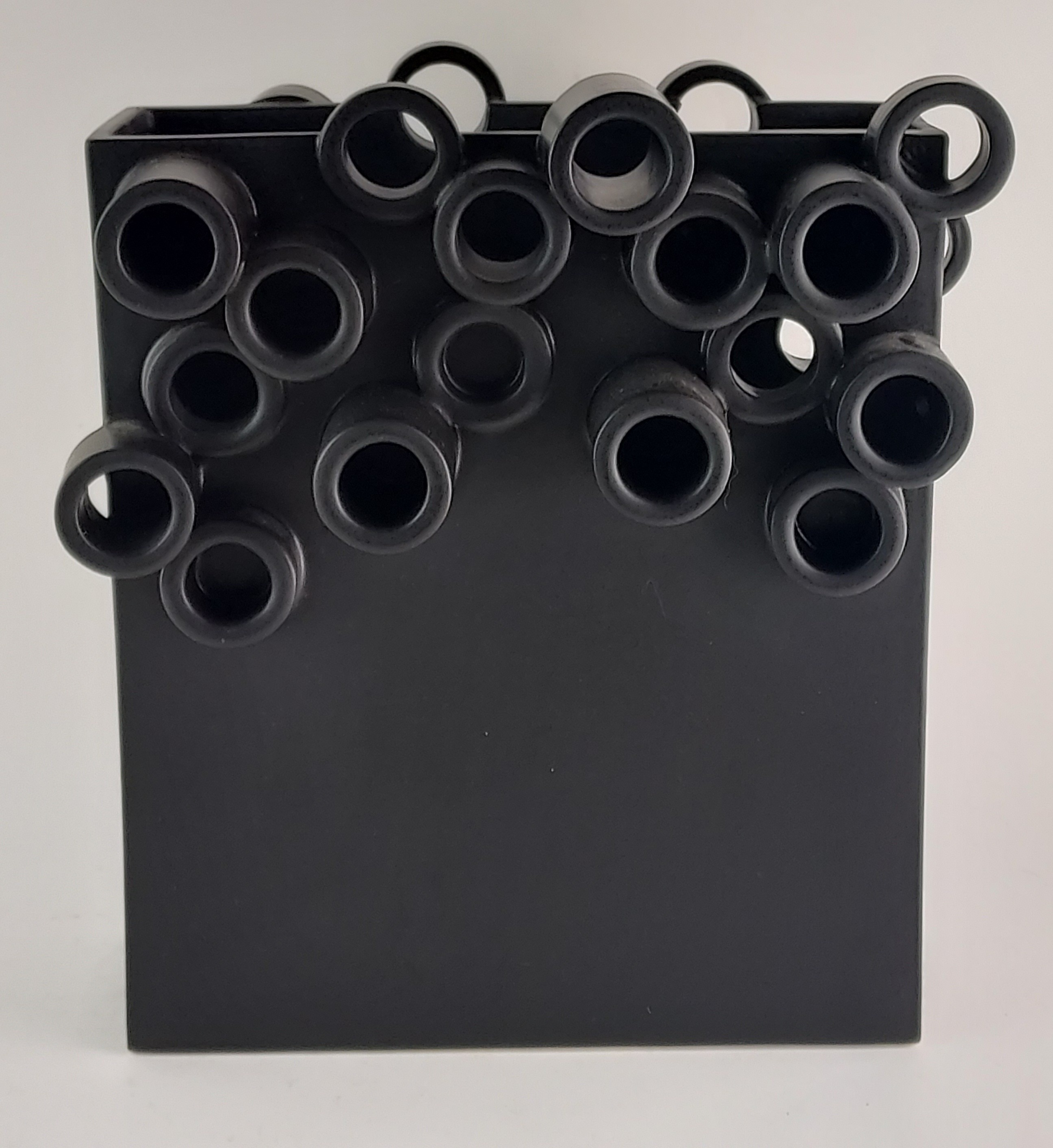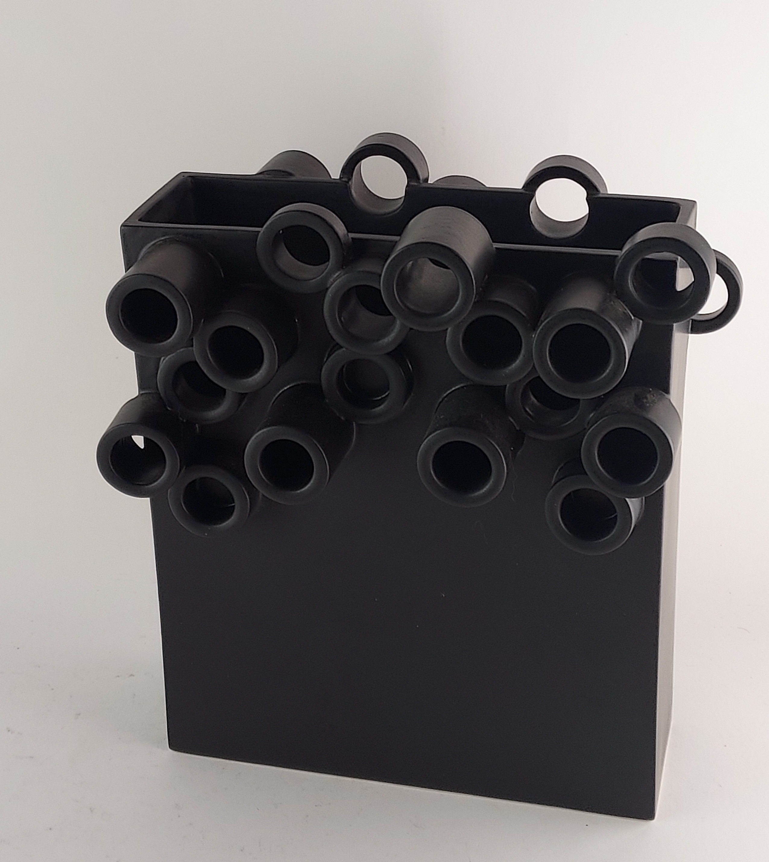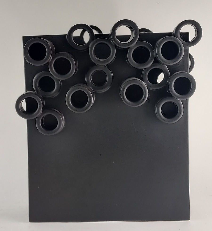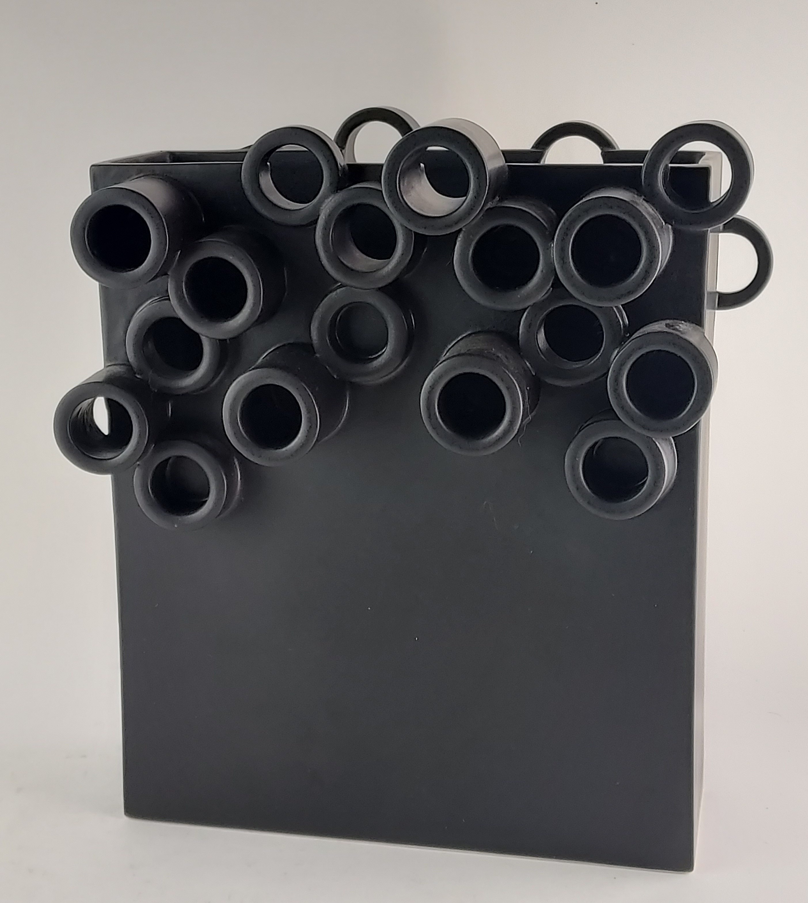 Zwart aardewerken vas opgebouwd uit platen en buizen aan de bovenzijde. Gesigneerd en gedateerd 2007.