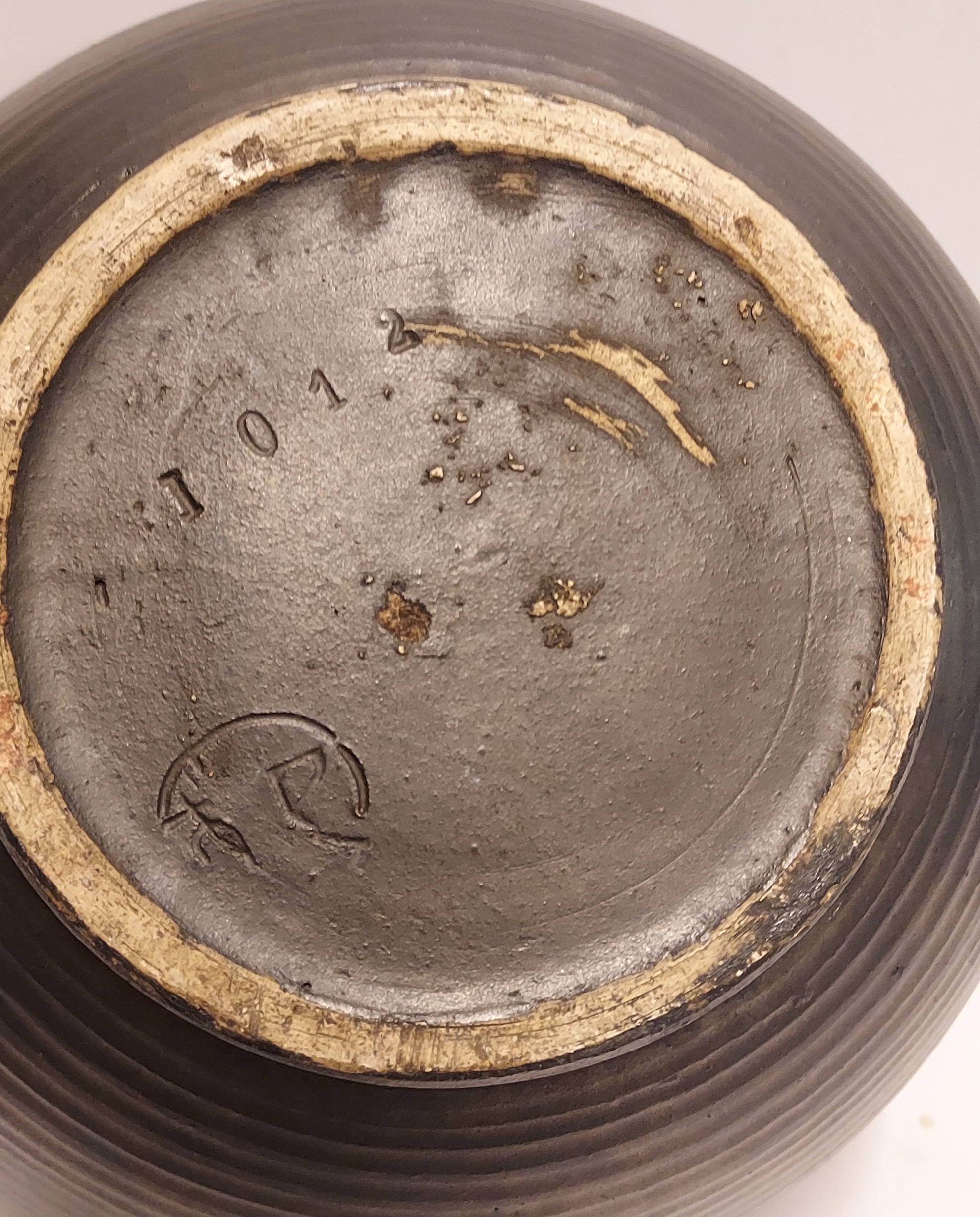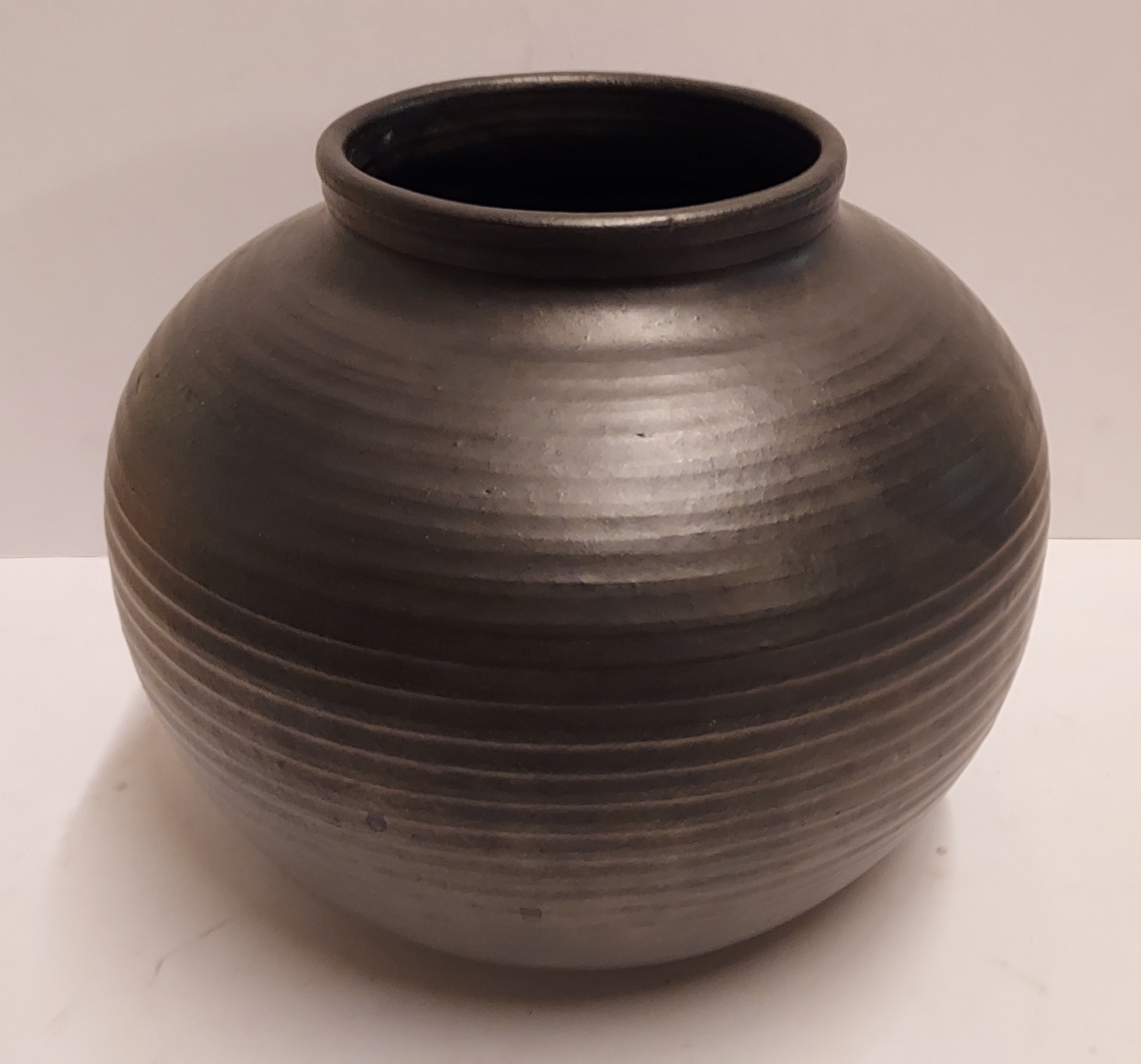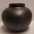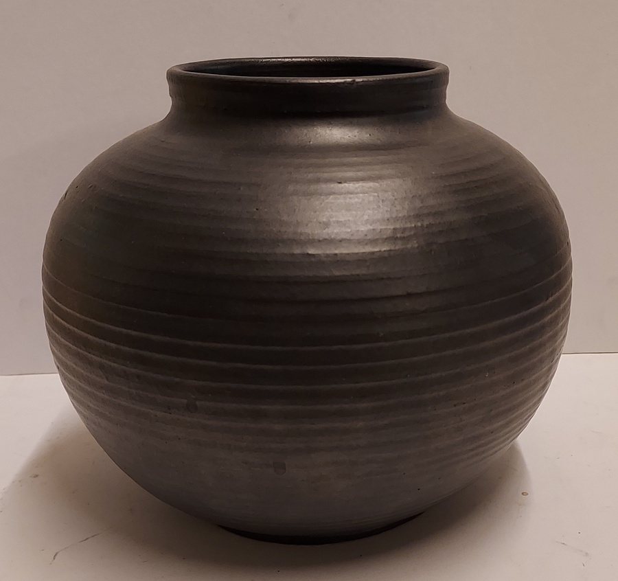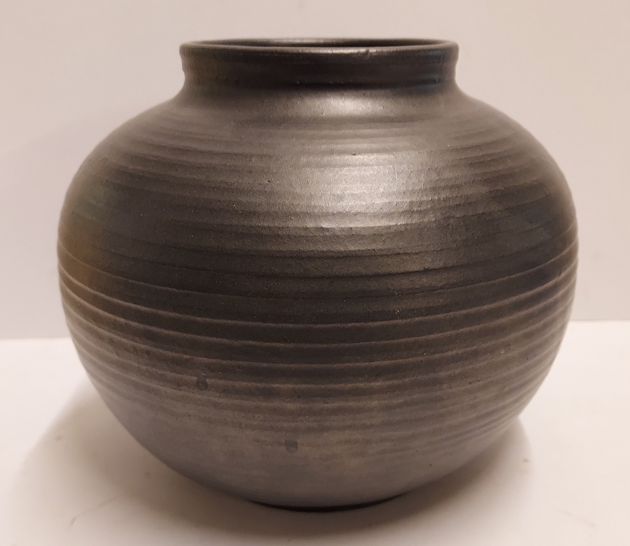 Bolle mat zwart geglazuurde vaas met ribbels. Onderzijde met fabrieksmerk en modelnummer 1012.