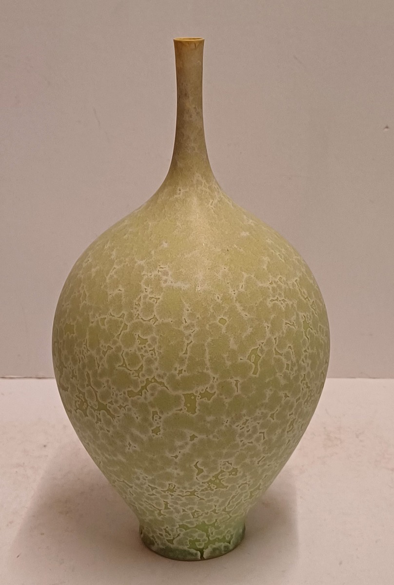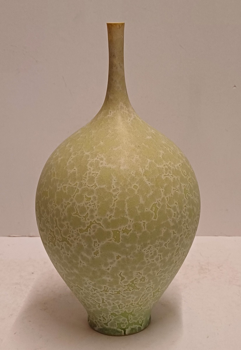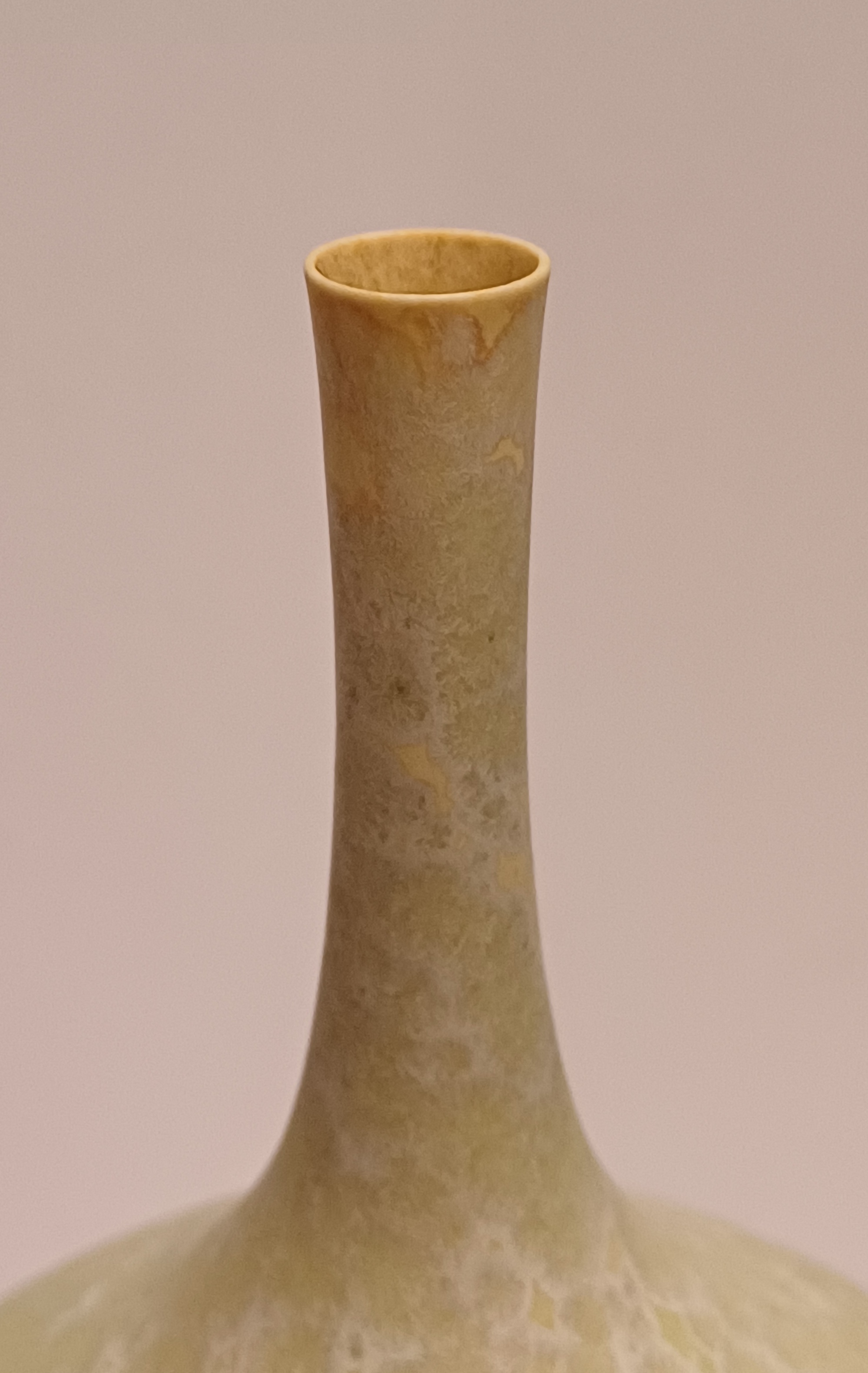 Porseleinen vaas met lange hals en matte kristalglazuur in groentinten. Onderzijde onduidelijk gesigneerd en sticker HS.