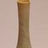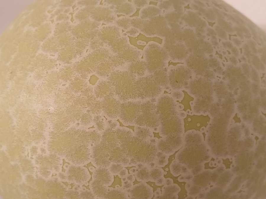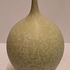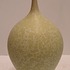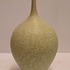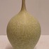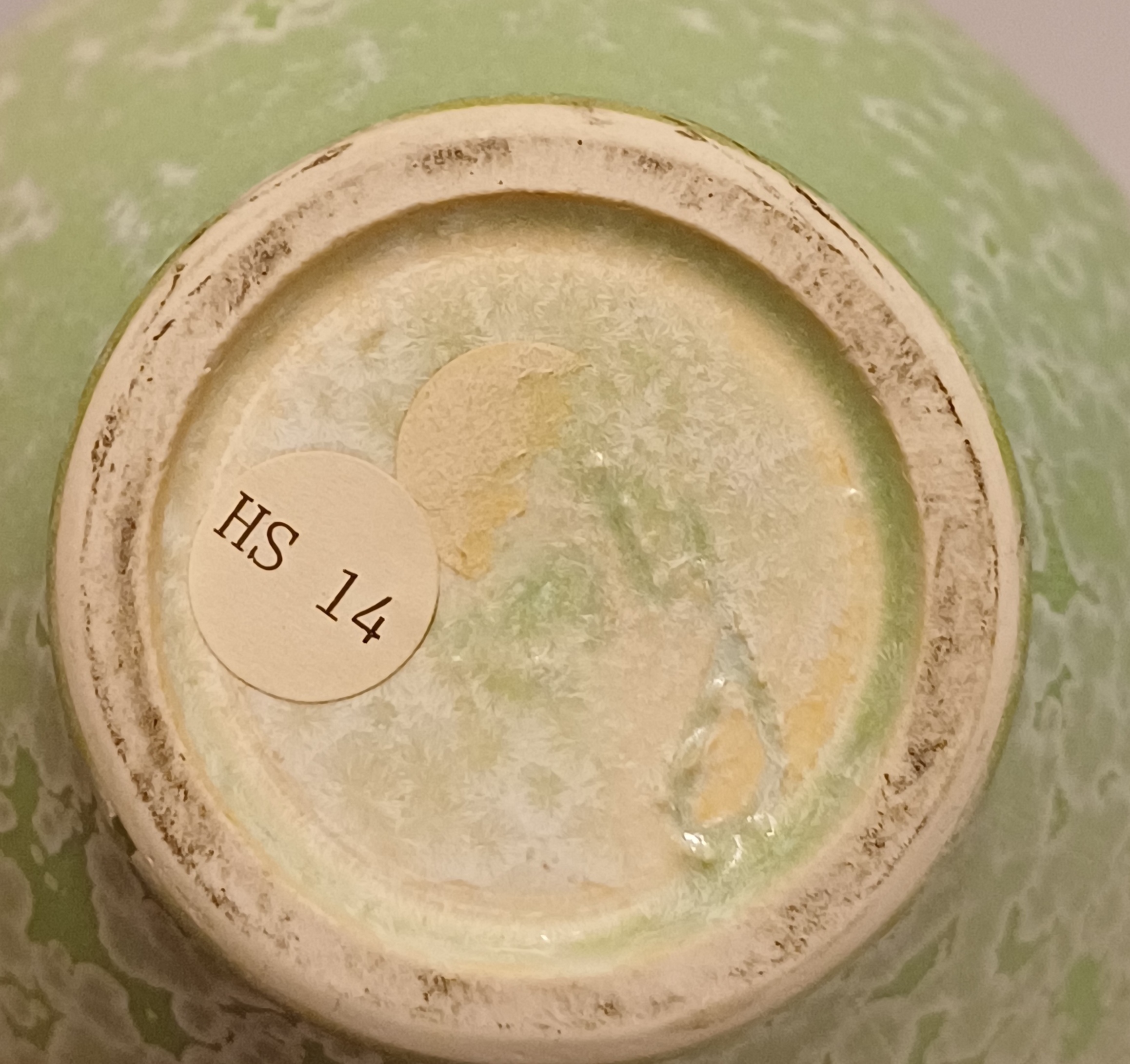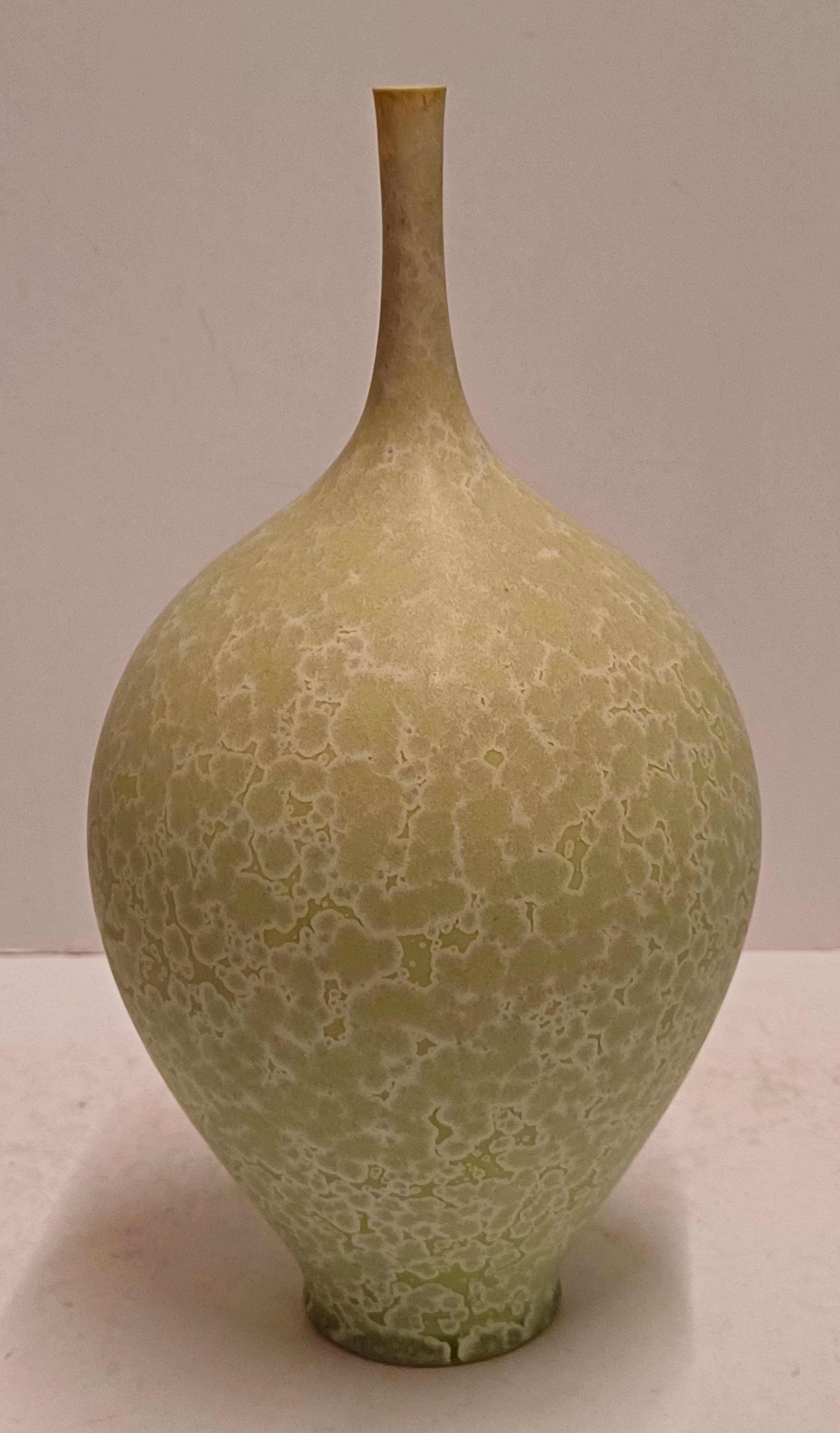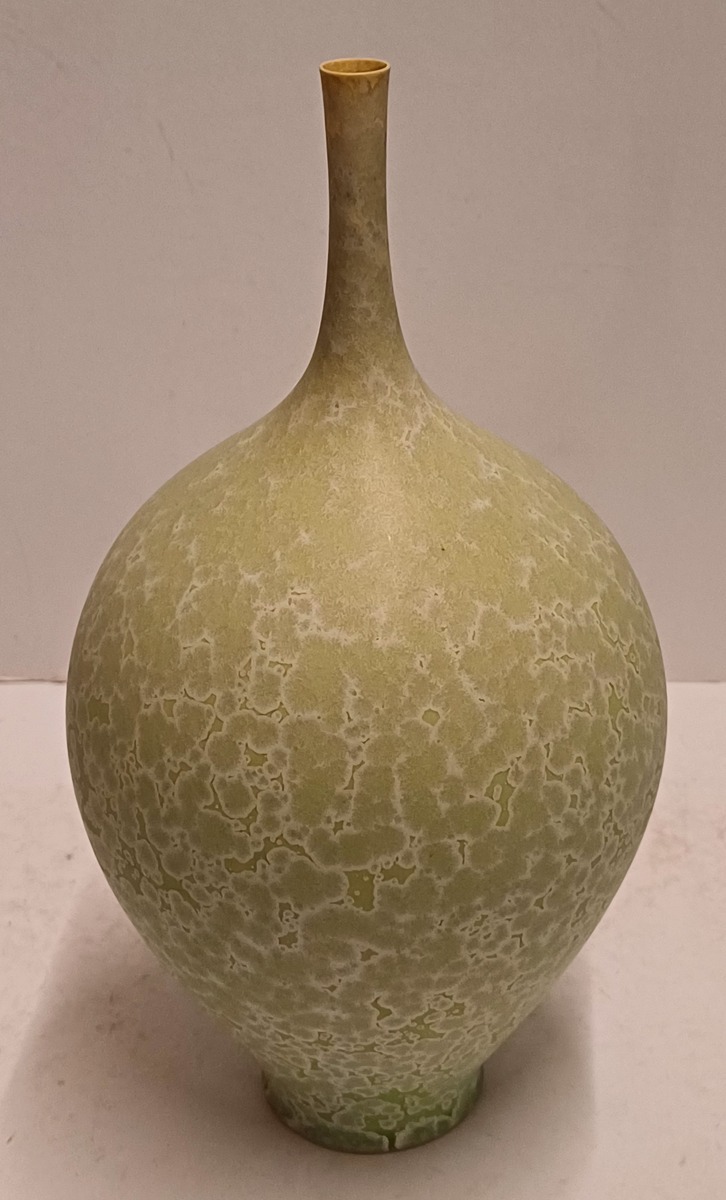 Porseleinen vaas met lange hals en matte kristalglazuur in groentinten. Onderzijde onduidelijk gesigneerd en sticker HS.