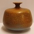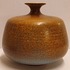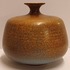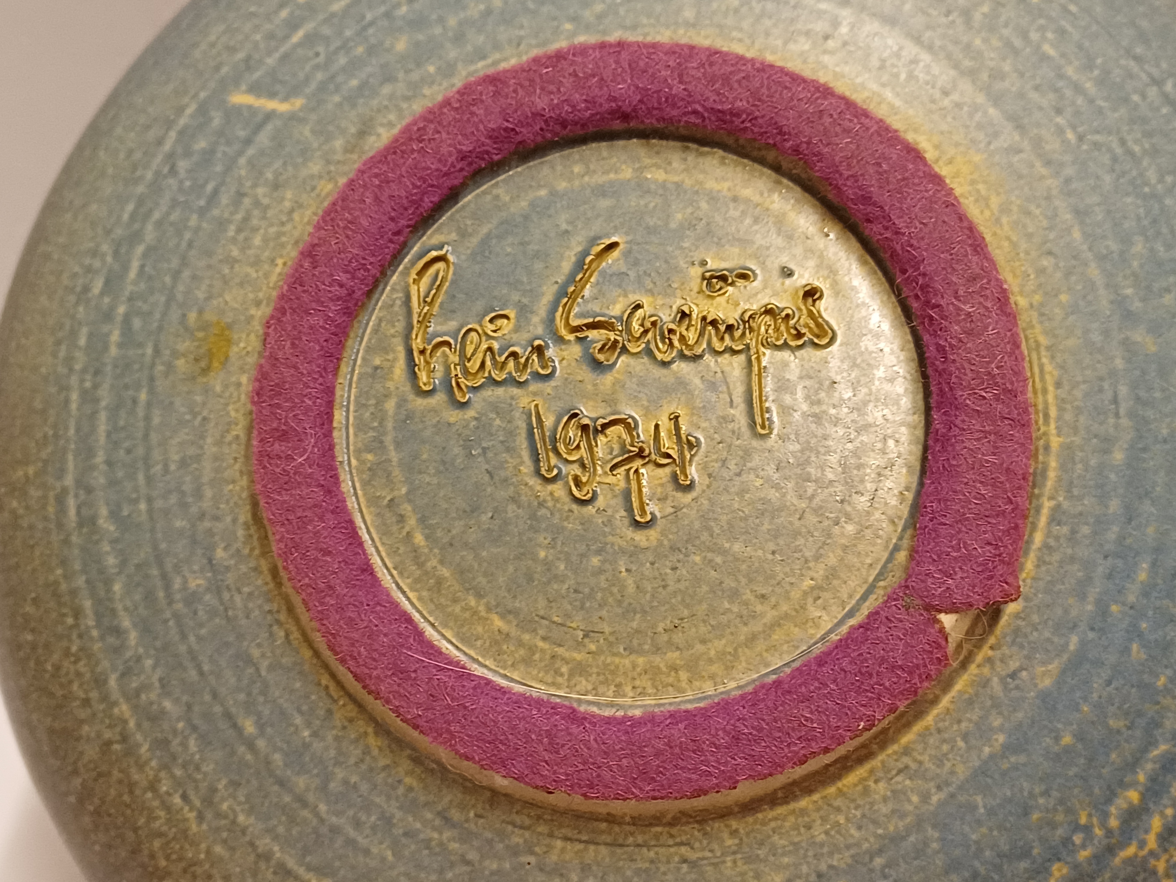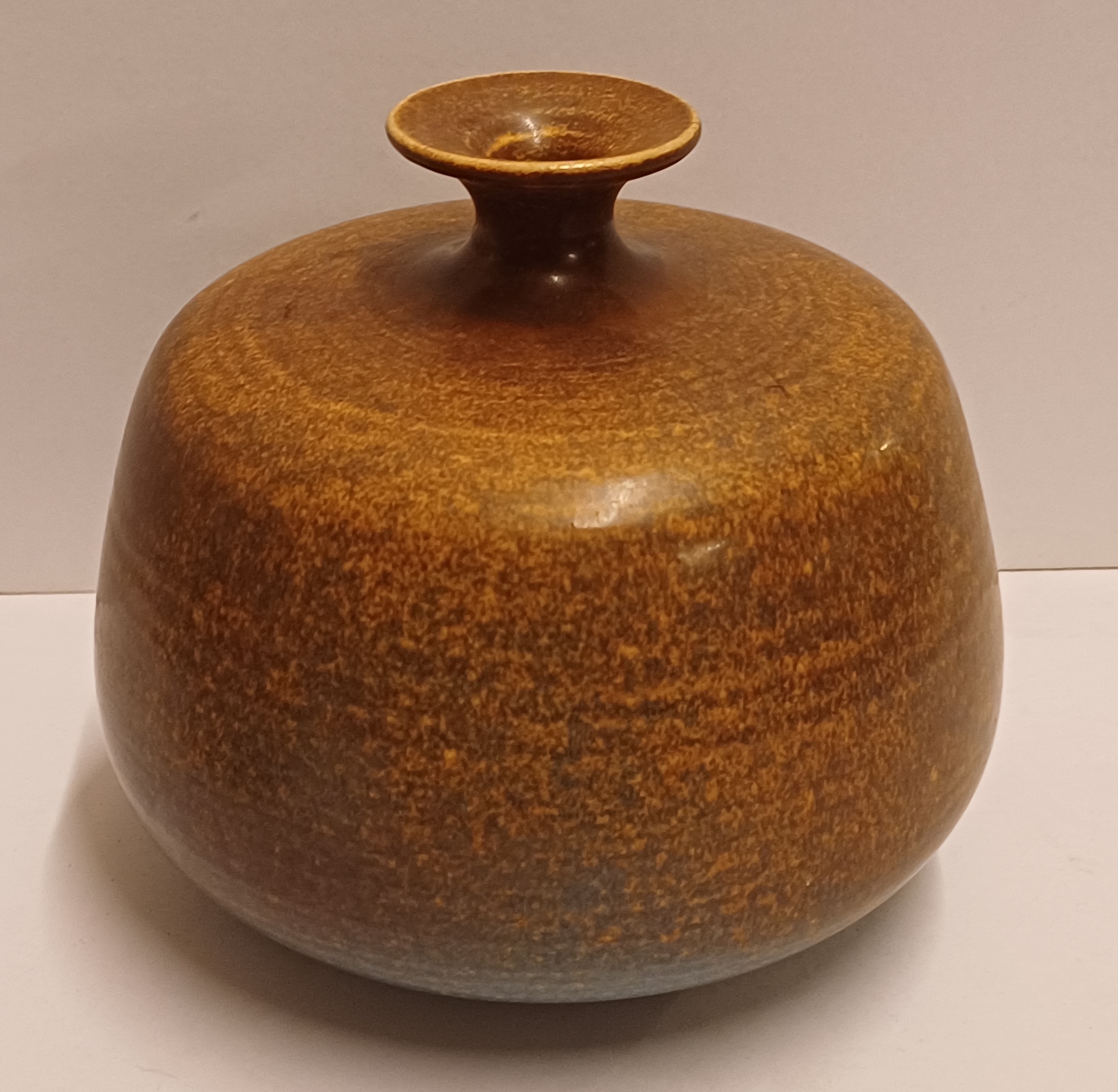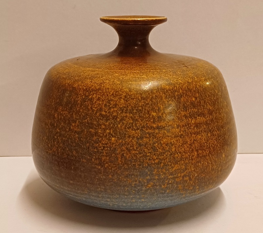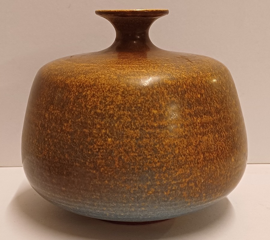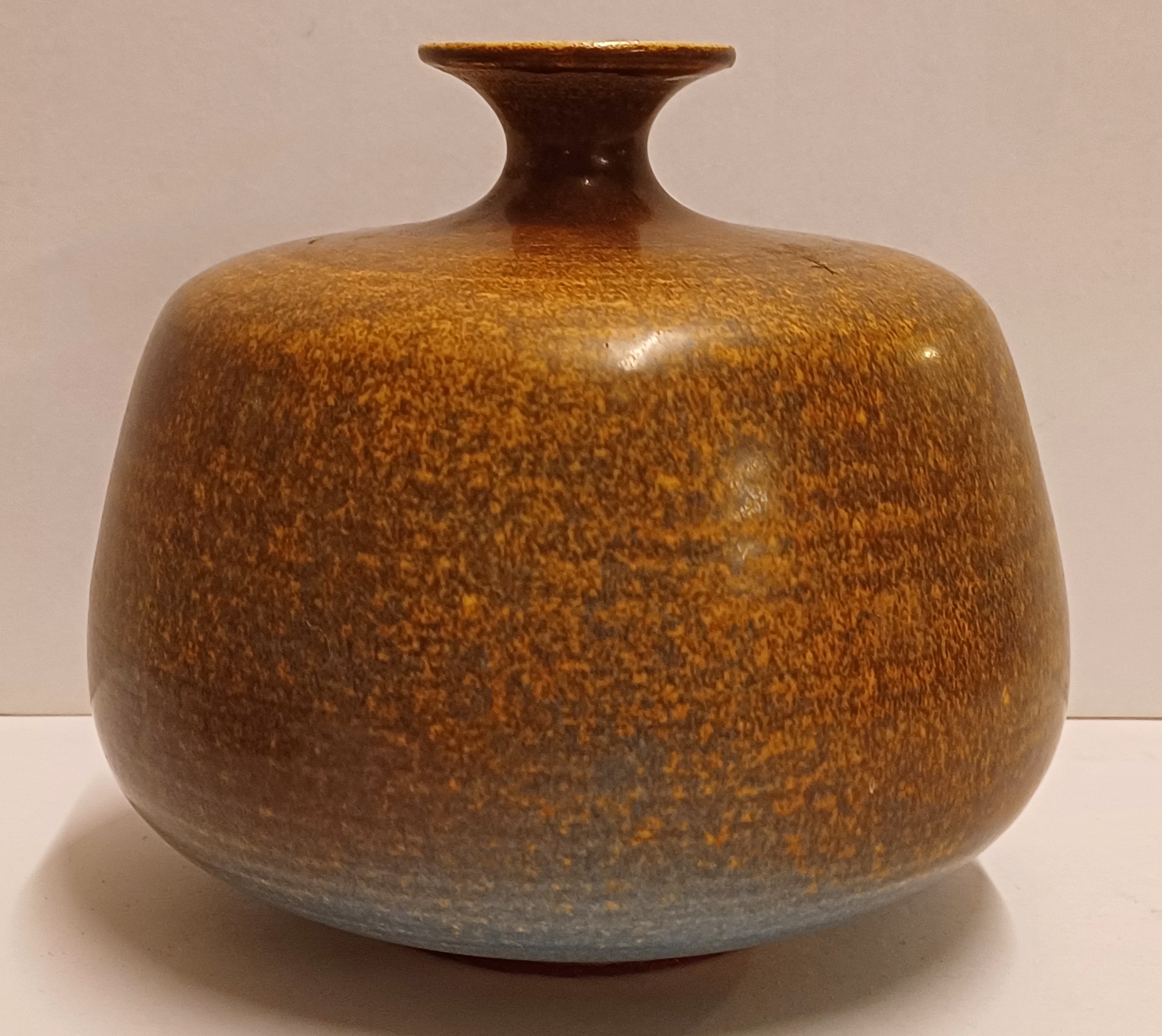 Vroege vaas met fijne bruin gespikkelde glazuur op blauw grijze ondergrond. Onderzijde gesigneerd en gedateerd 1974.