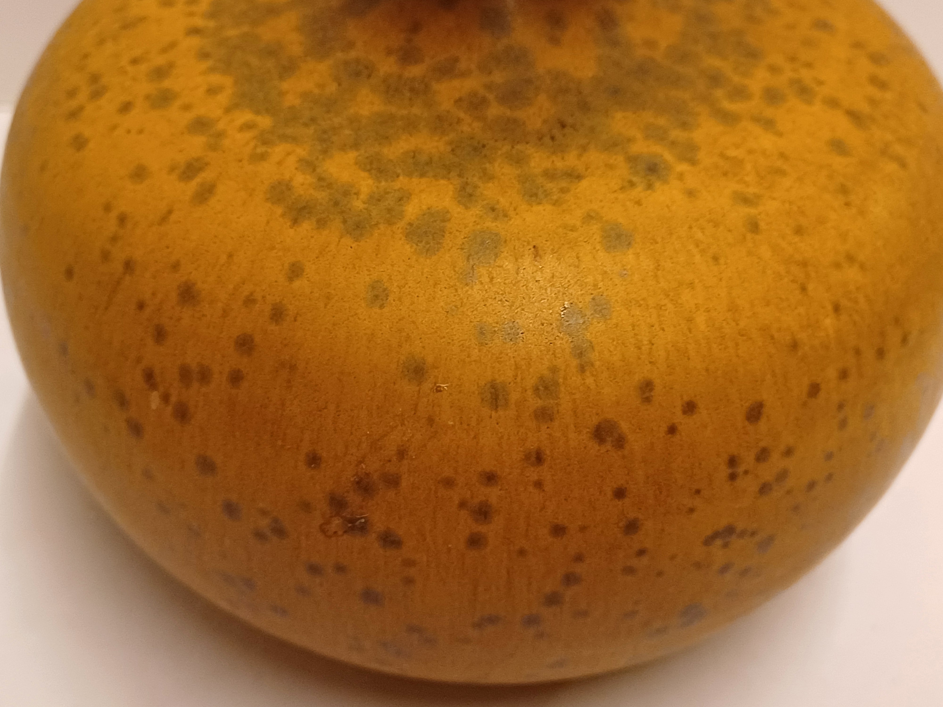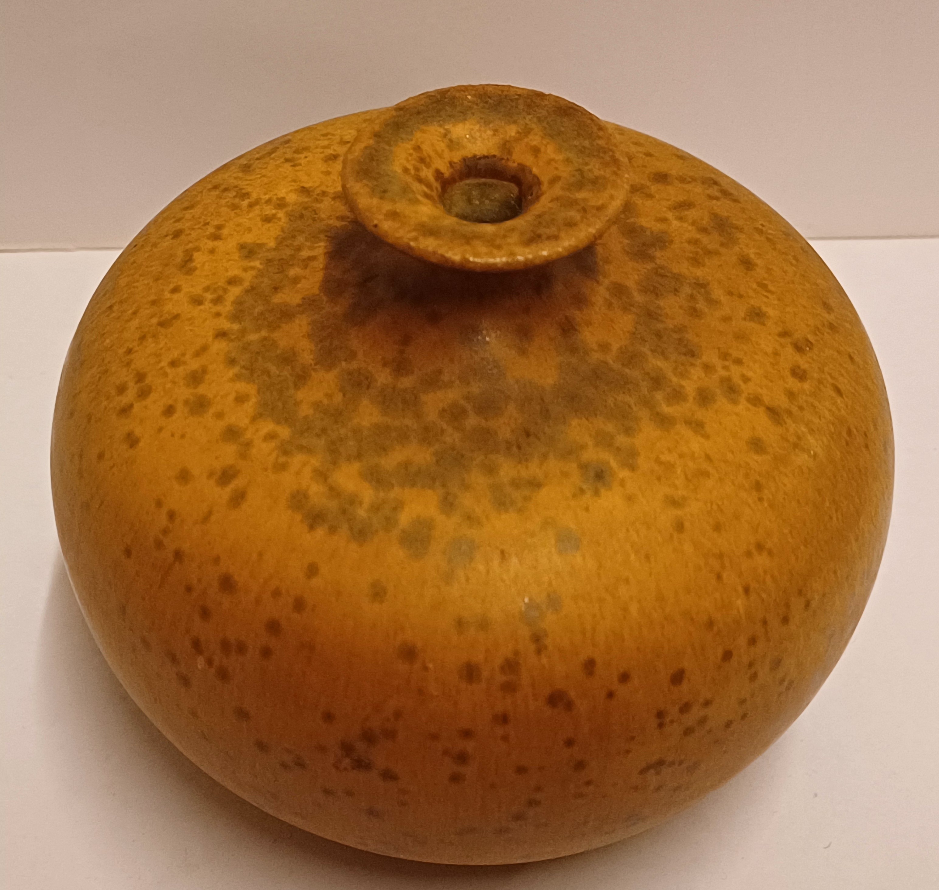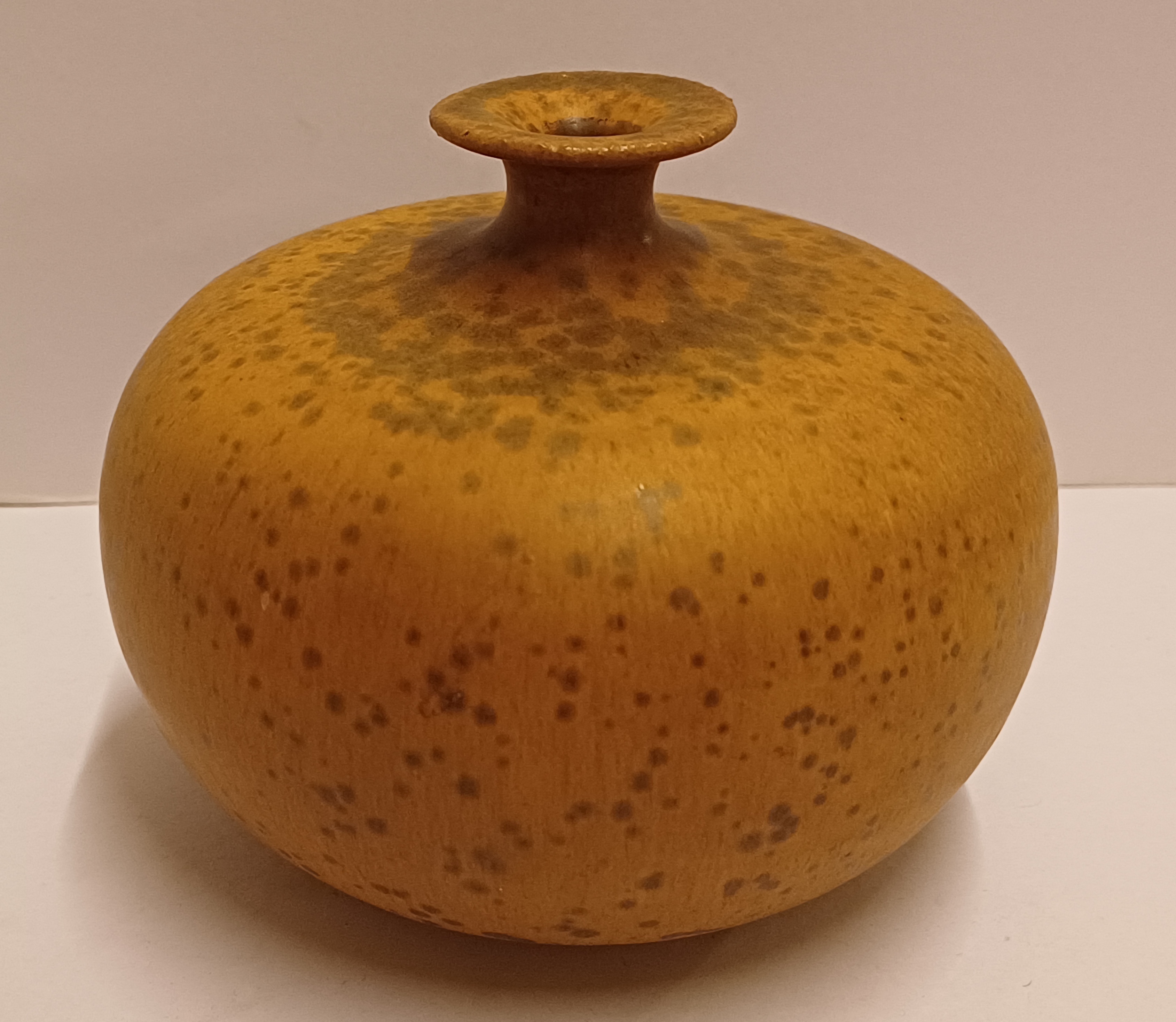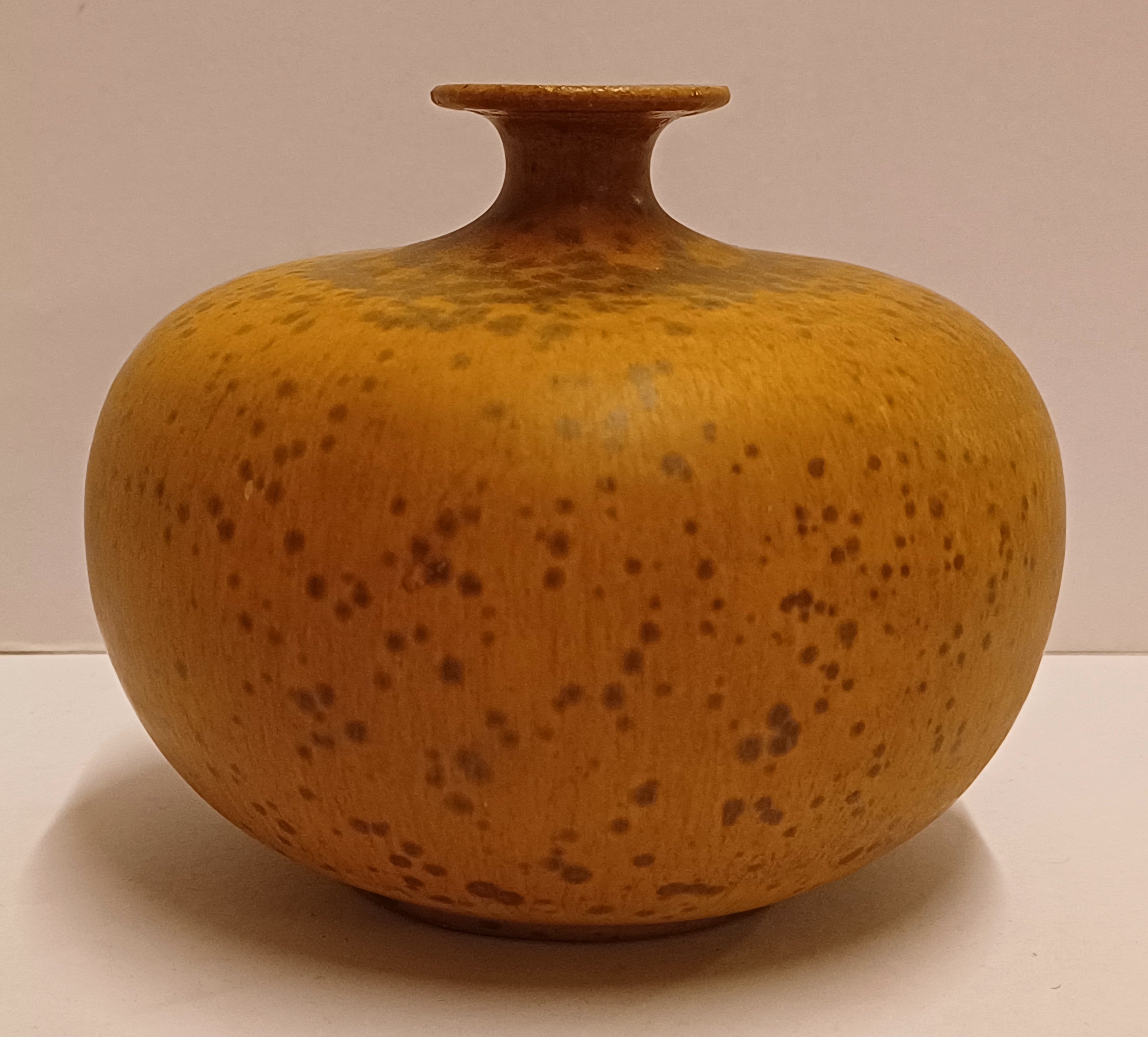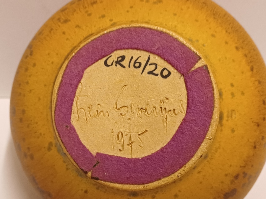 Bol vaasje met typerend halsje en lichte bruine kristal glazuur. Onderzijde gesigneerd en gedateerd 1975.