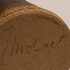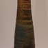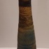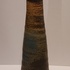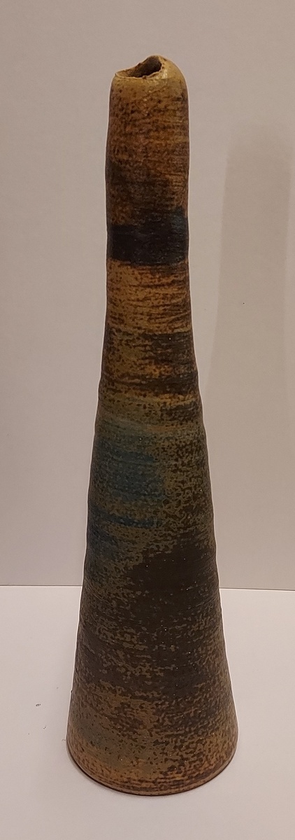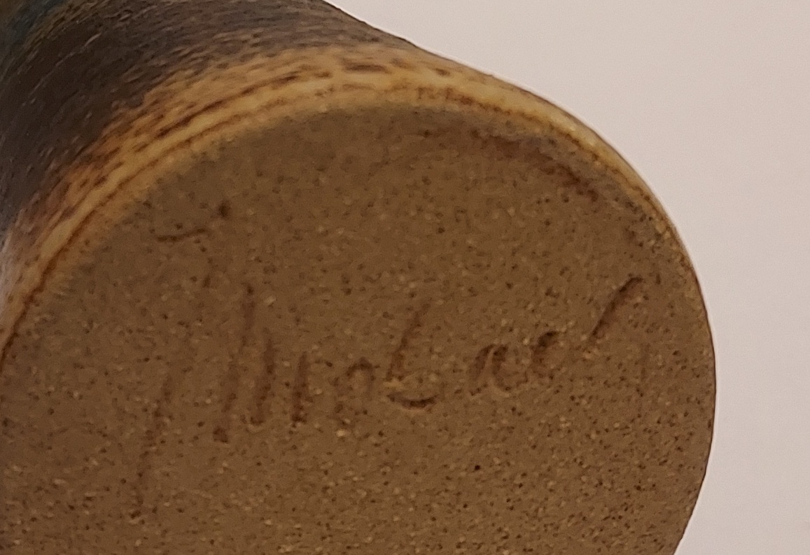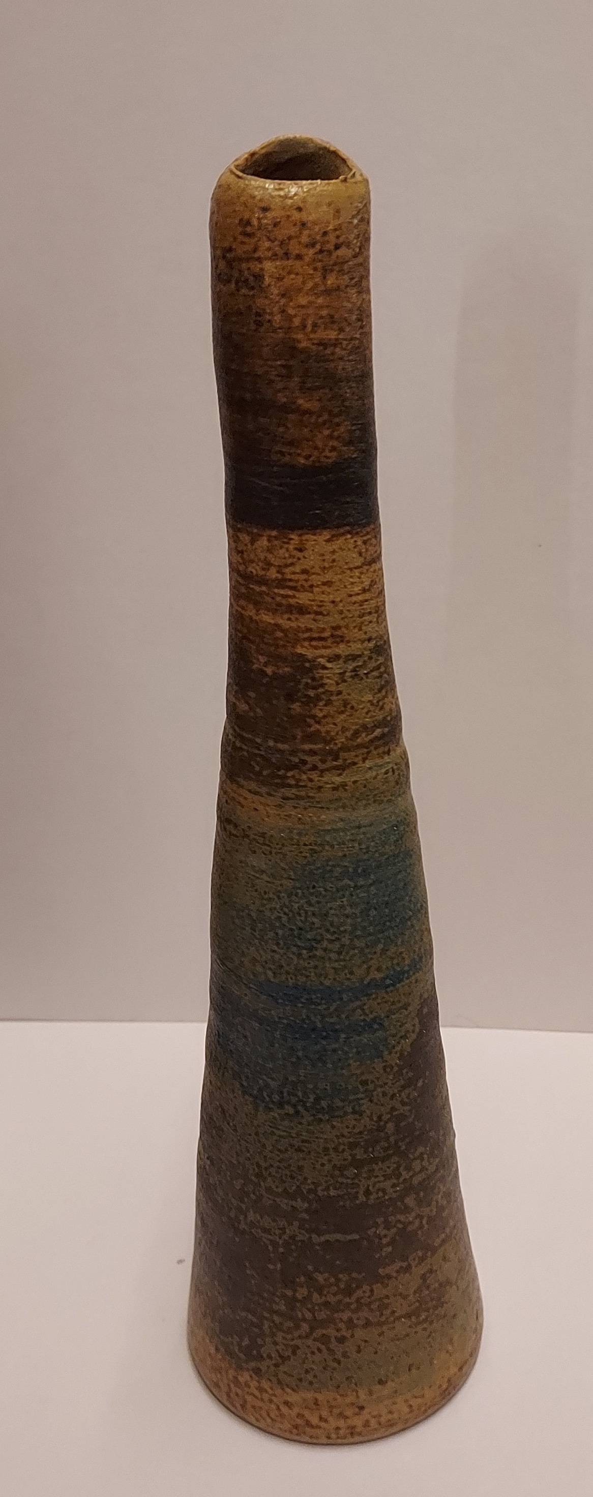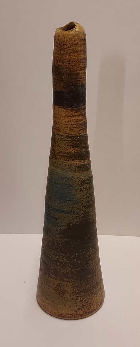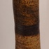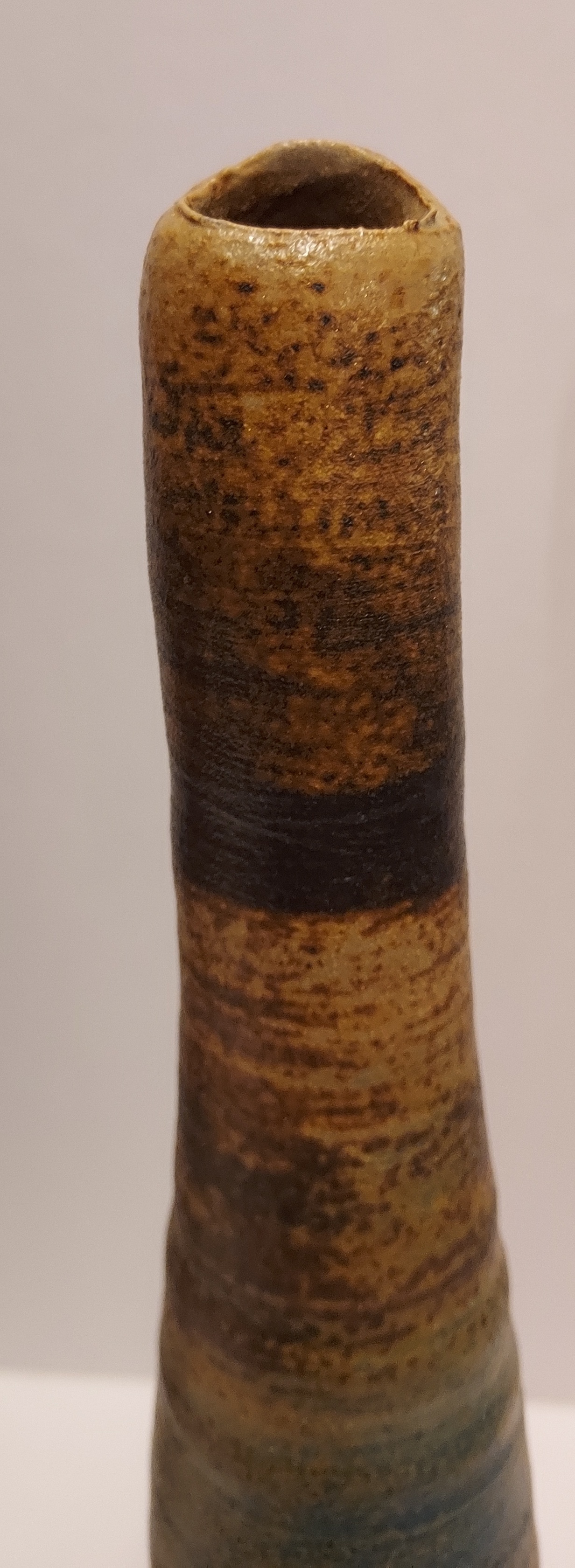 Langgerekte vaas met bruinige glazuur en kleine mondopening. Onderzijde gesigneerd
