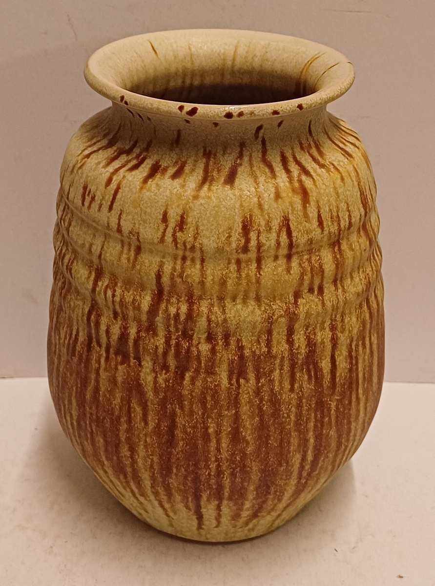 Aardewerken vaas met grijs bruine glazuur. Onderzijde met fabrieksmerk.