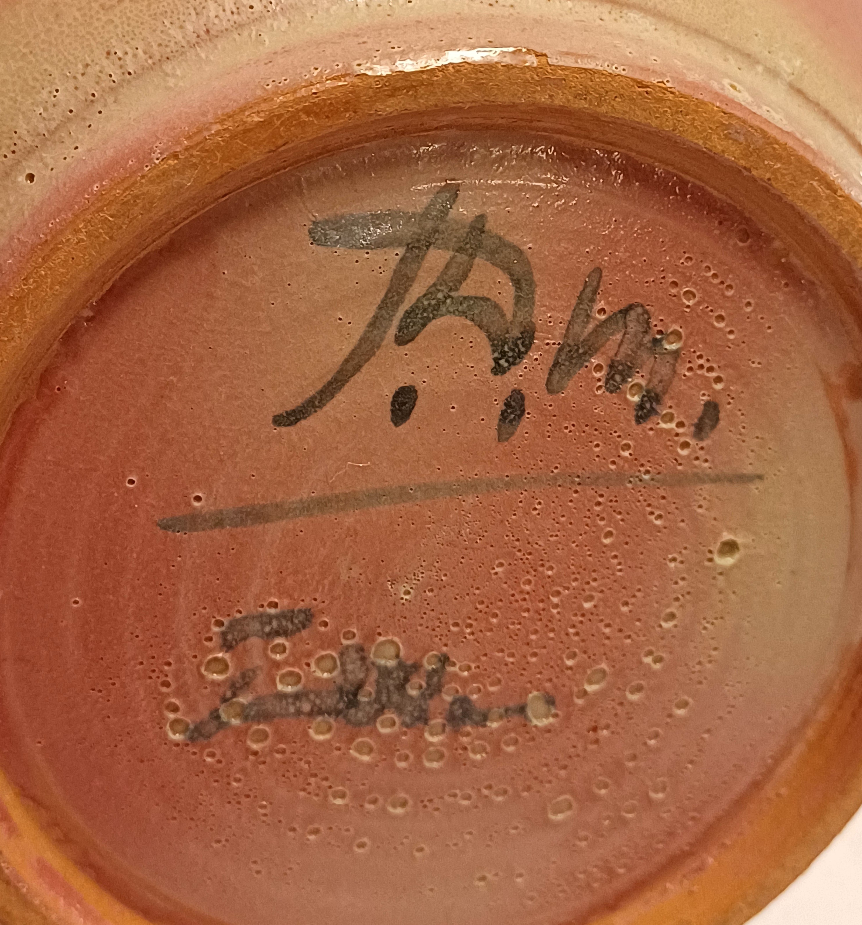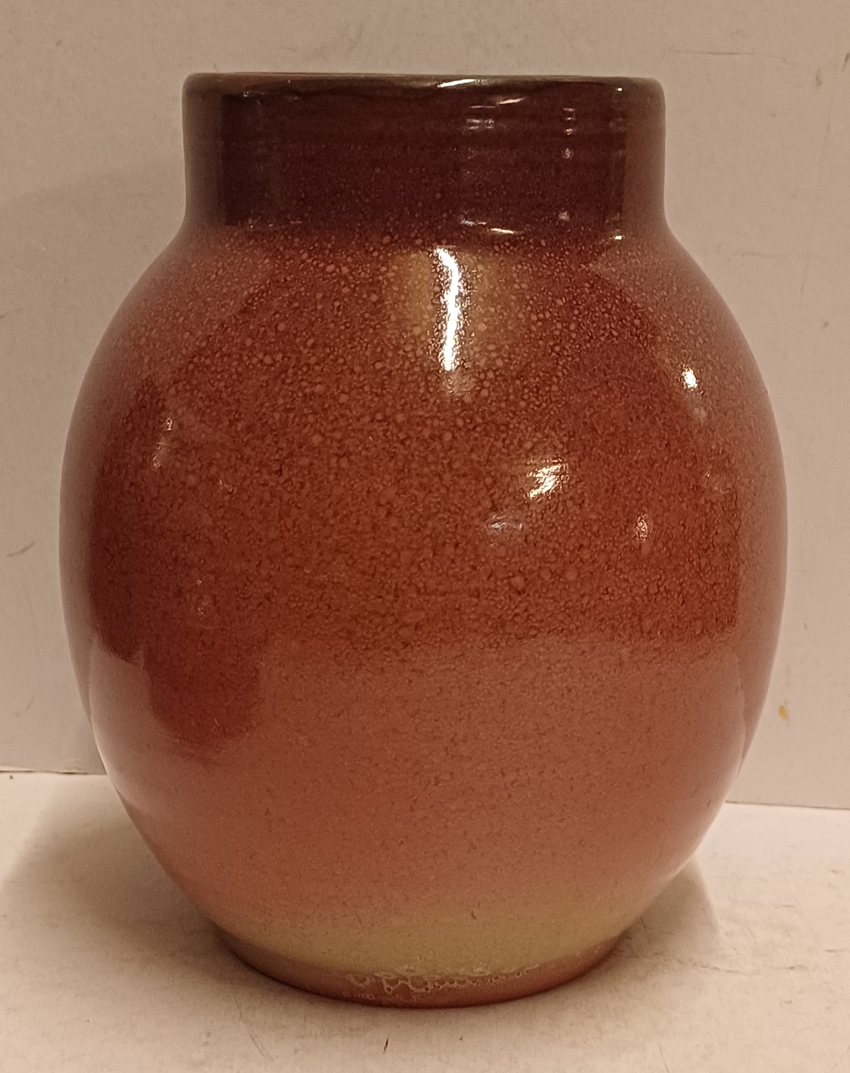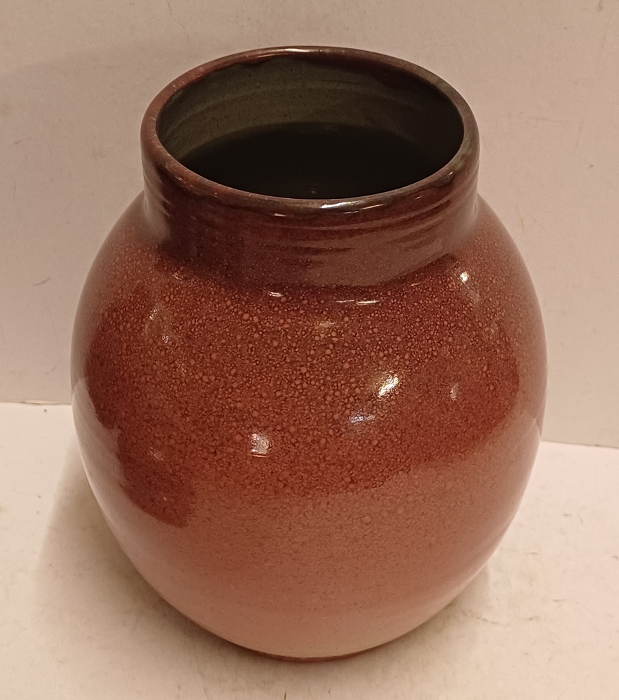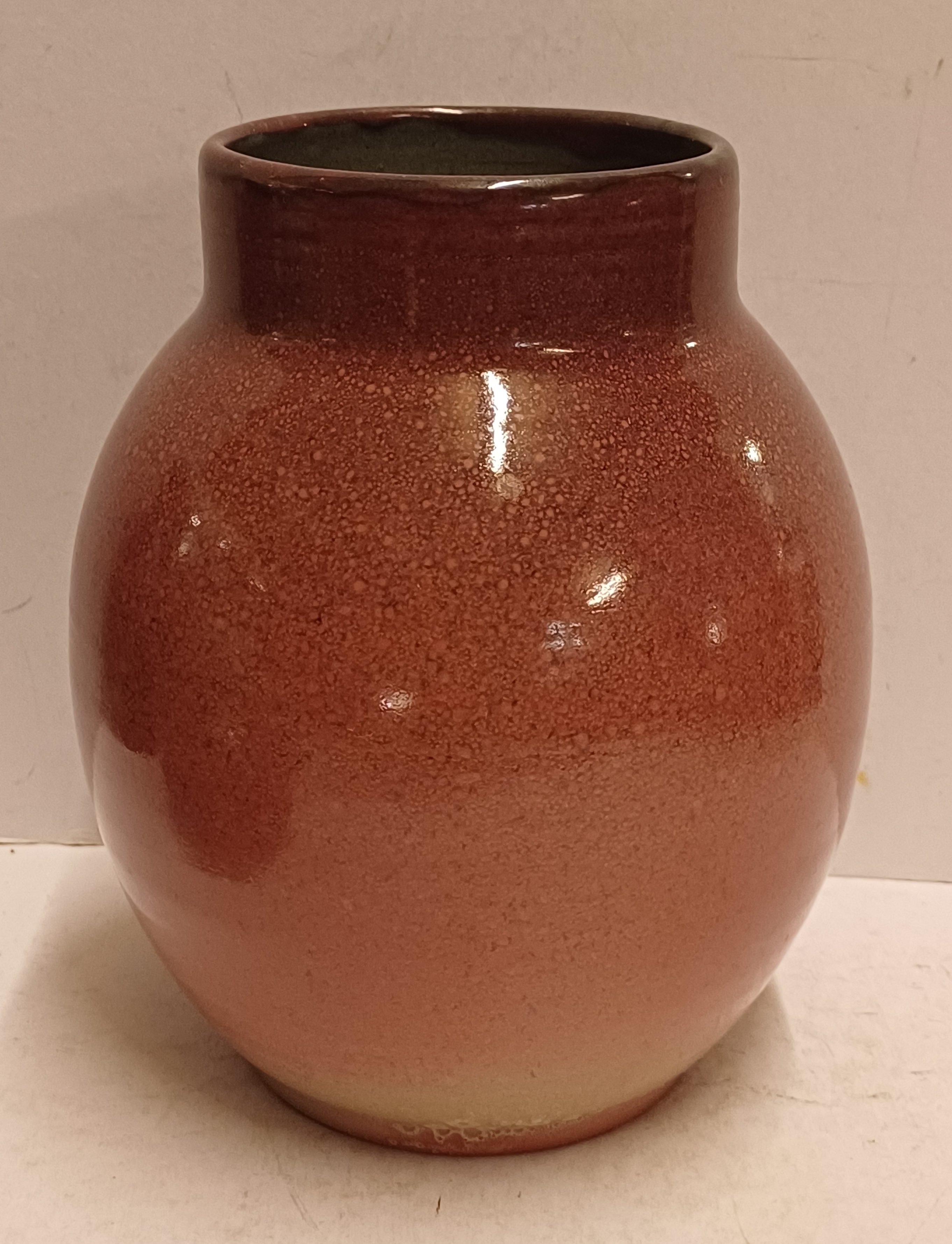 Aardewerken bolle vaas paars rode glazuur. Onderzijde met signatuur. Uitvoering eigen studio Apeldoorn ca 1920.