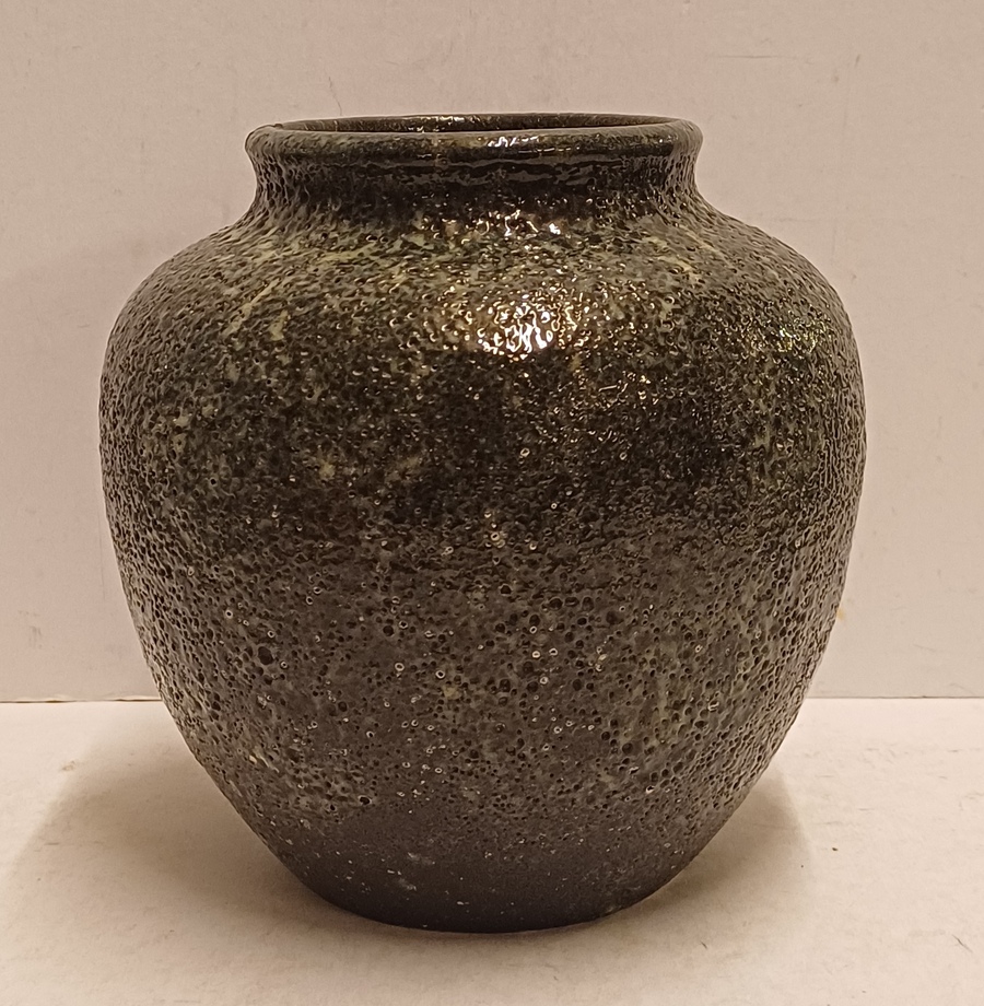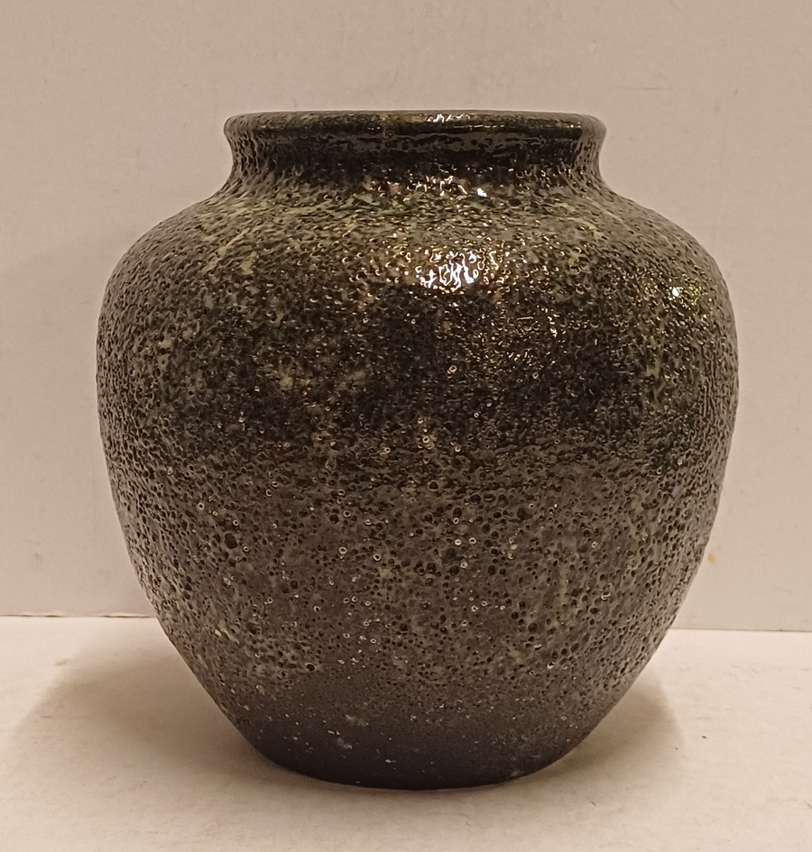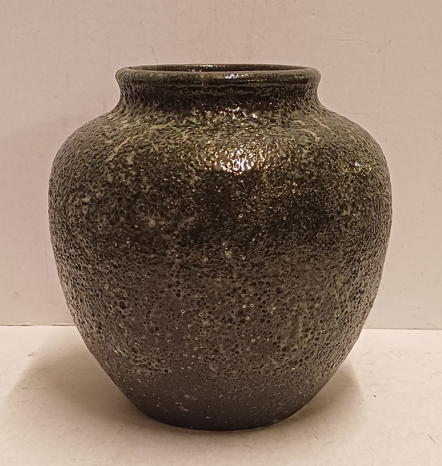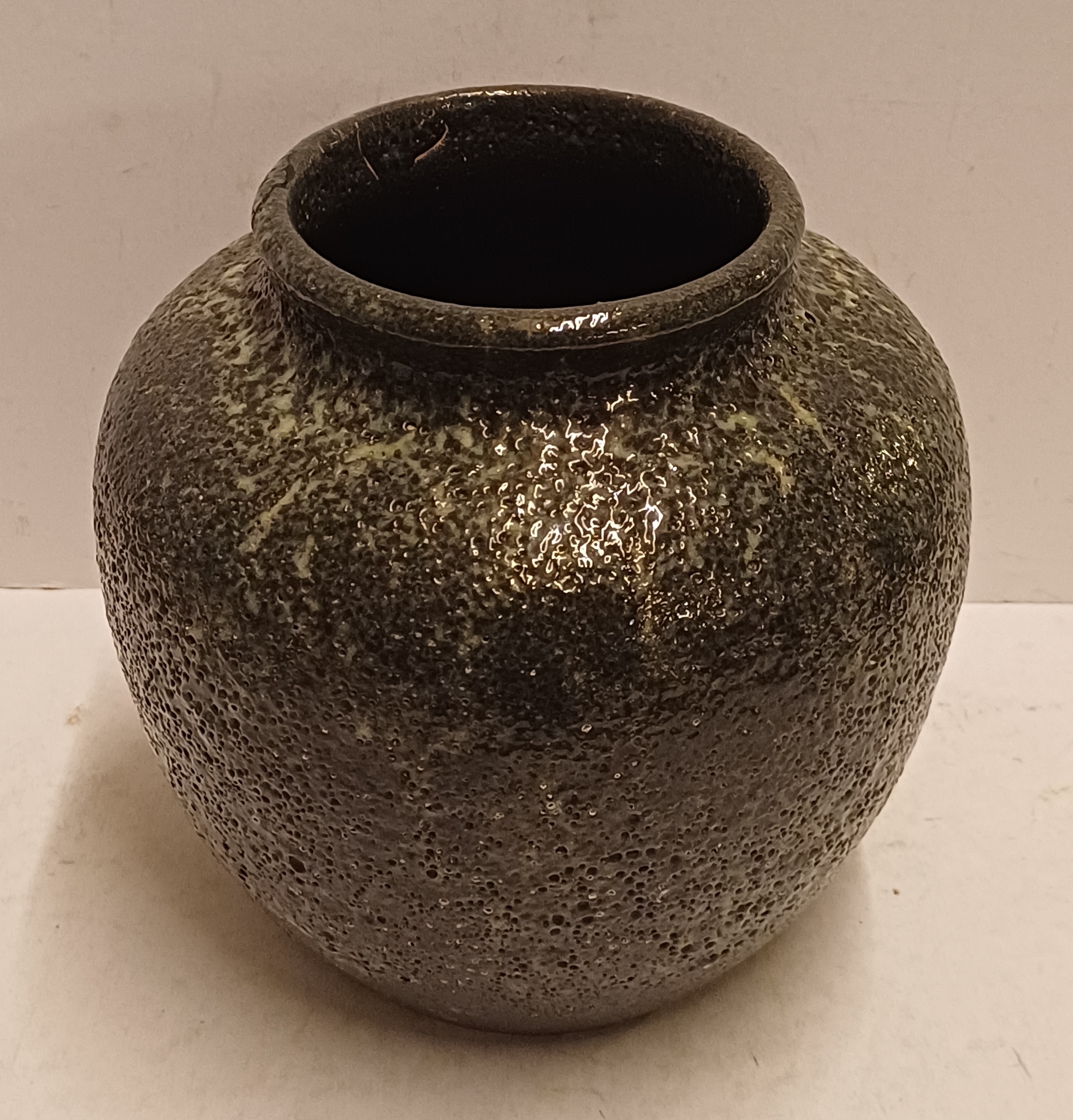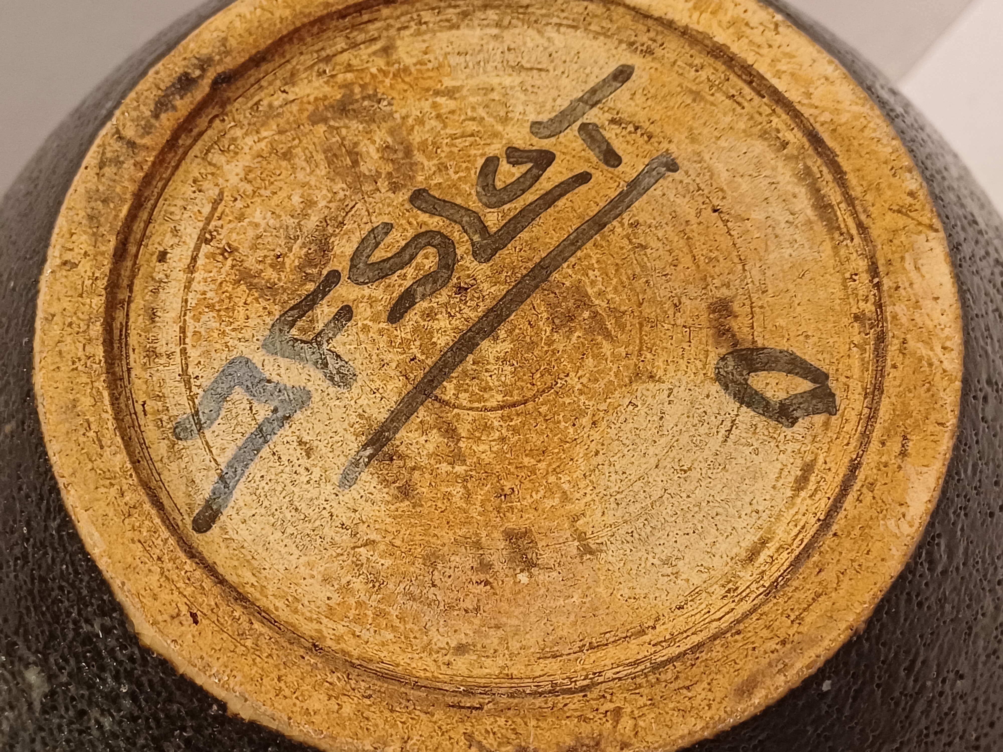 Handgedraaide vaas met donkere glazuur. Onderzijde gesigneerd