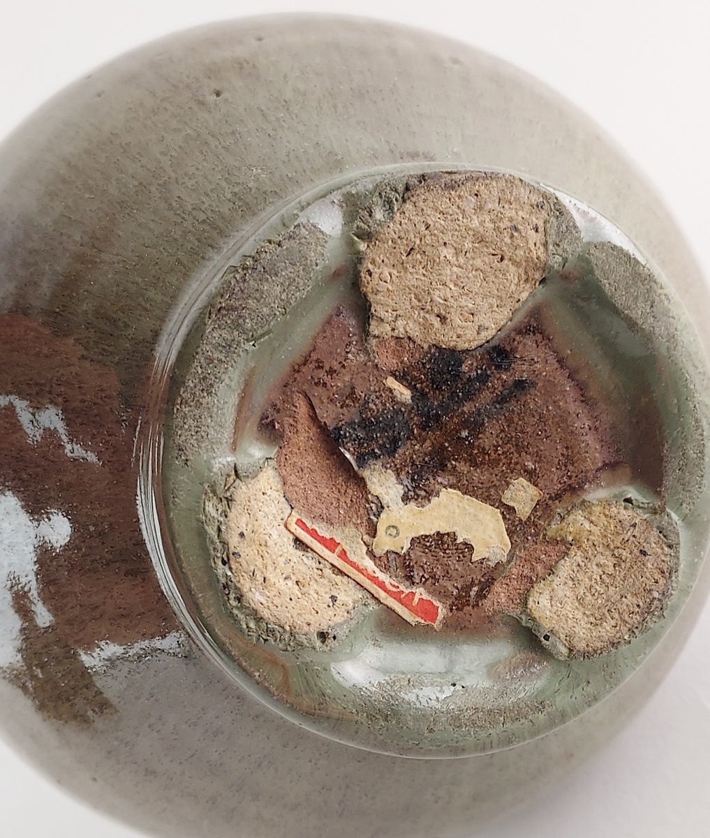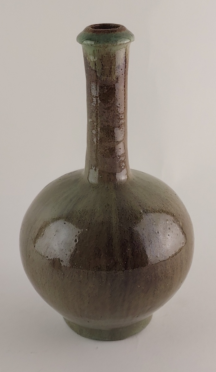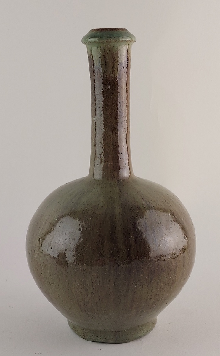 Hals vaas met groene glazuur. Onderzijde met JFS merk.