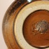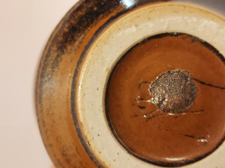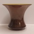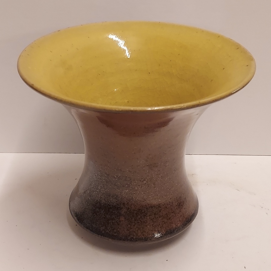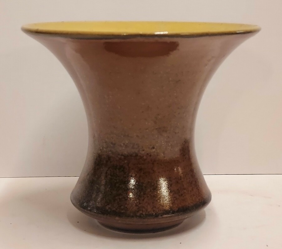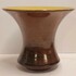 Trechtervormige vaas met bruine glazuur de binnenzijde met gele glazuur. Onderzijde gesigneerd.