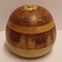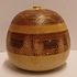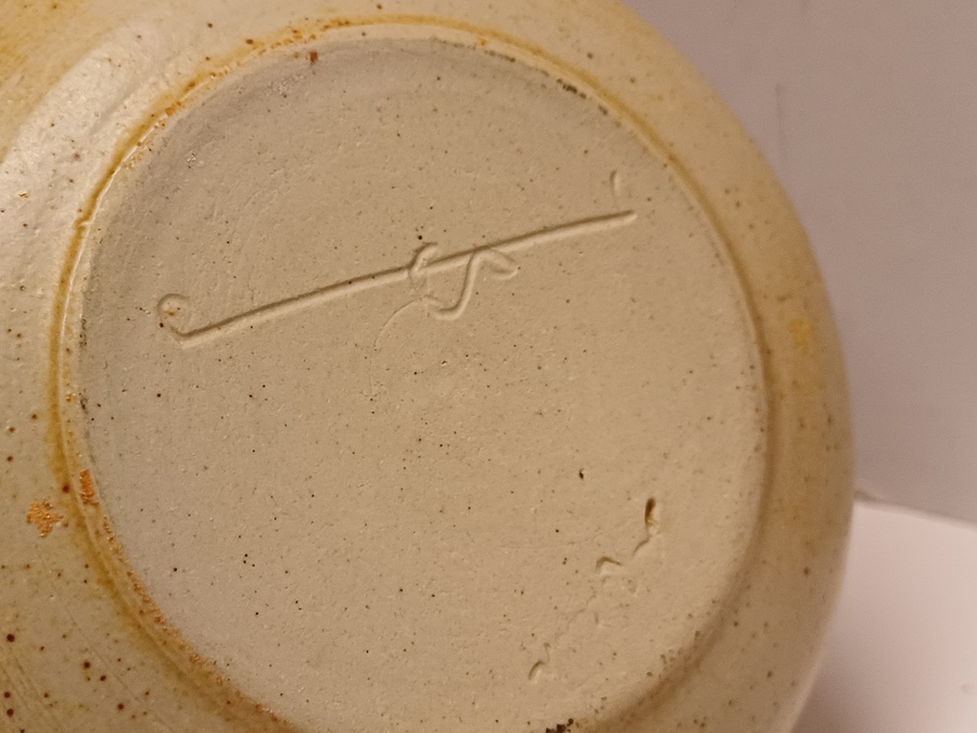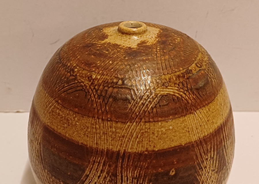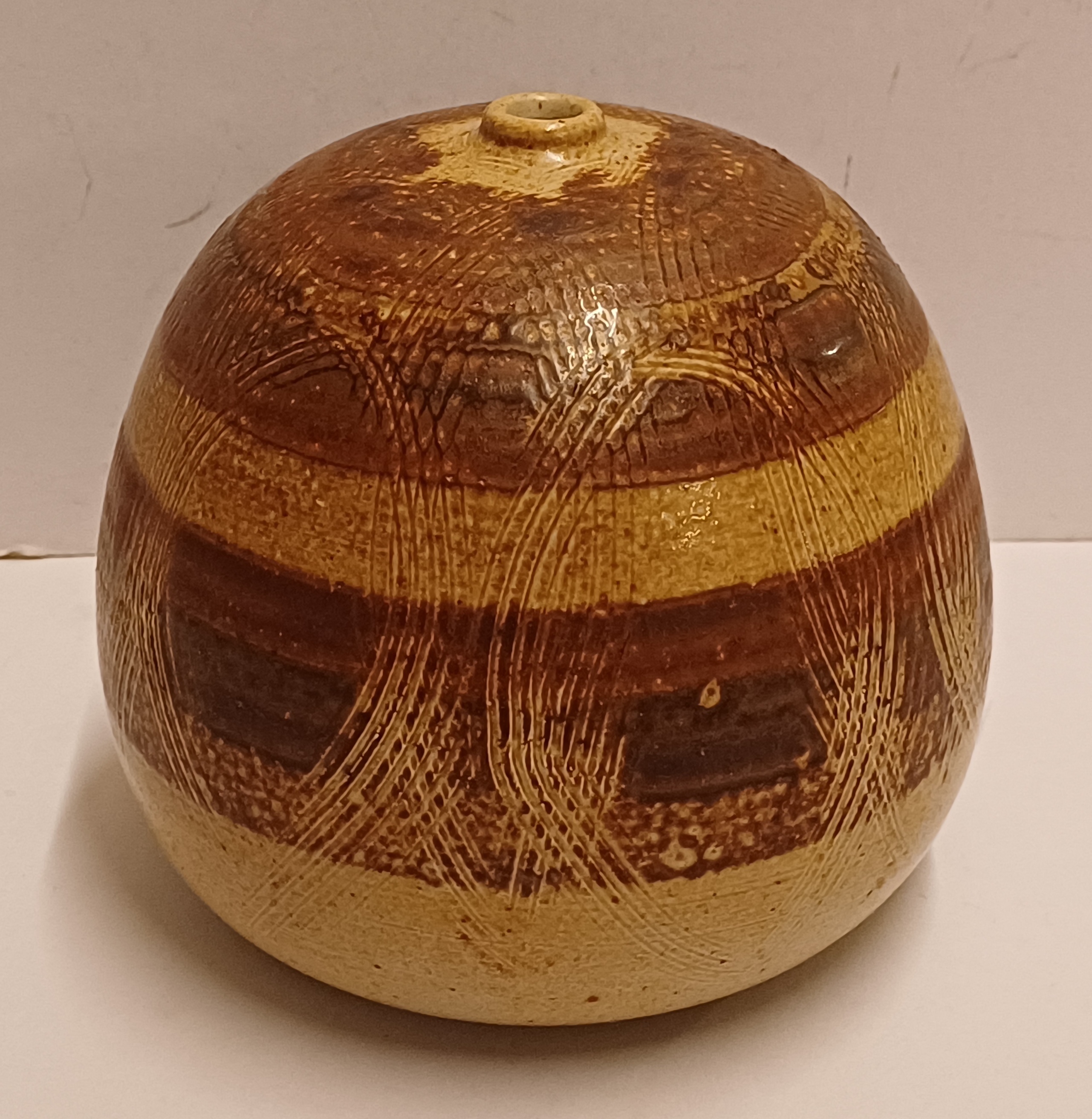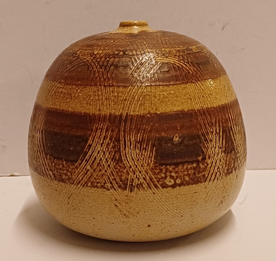 Bolle keramieken vaas met ingekrast decor met horizontale bruine banen en kleine mondopening. Onderzijde gemerkt en kunstenaars signatuur van Joke Stroes.